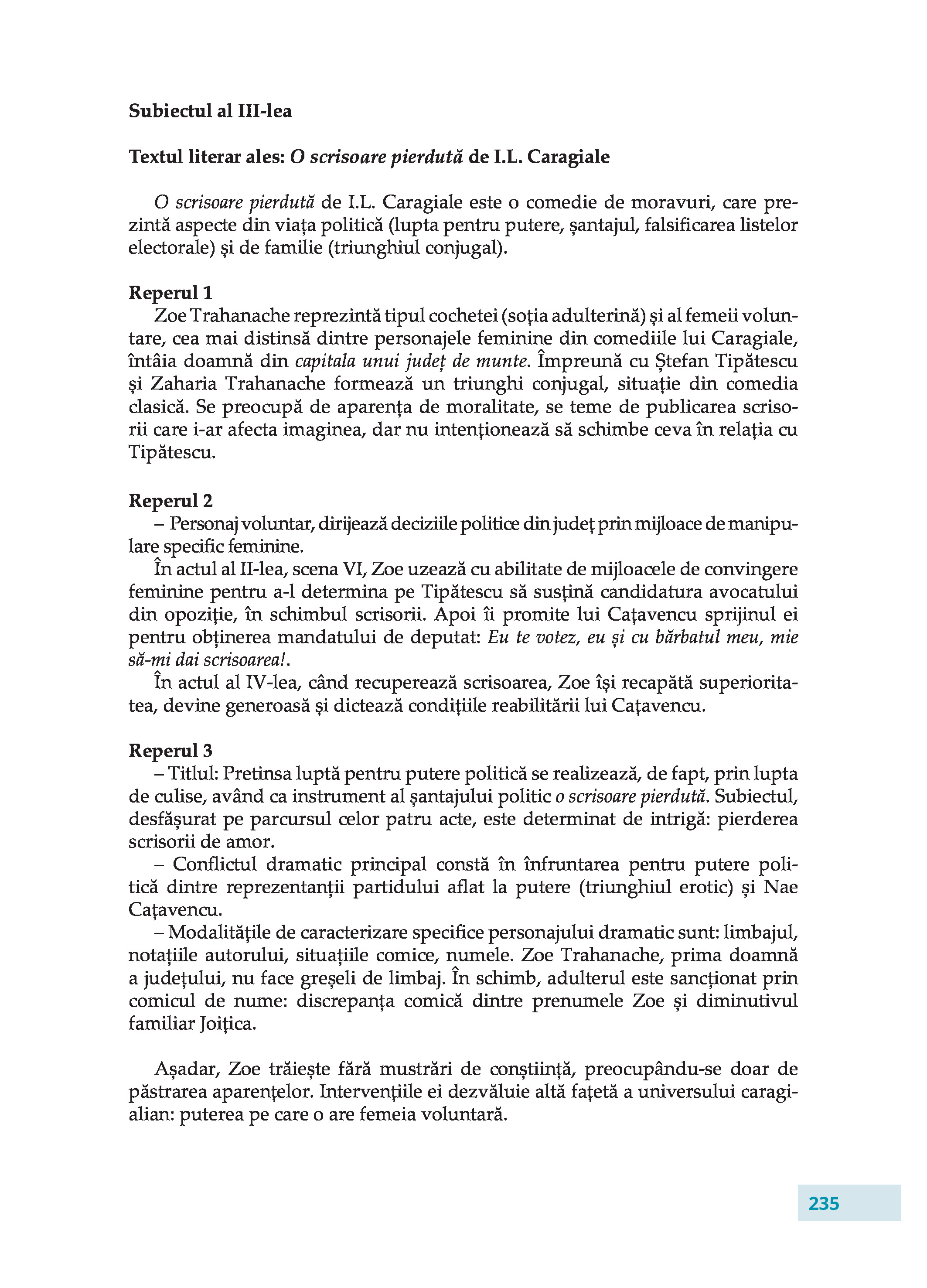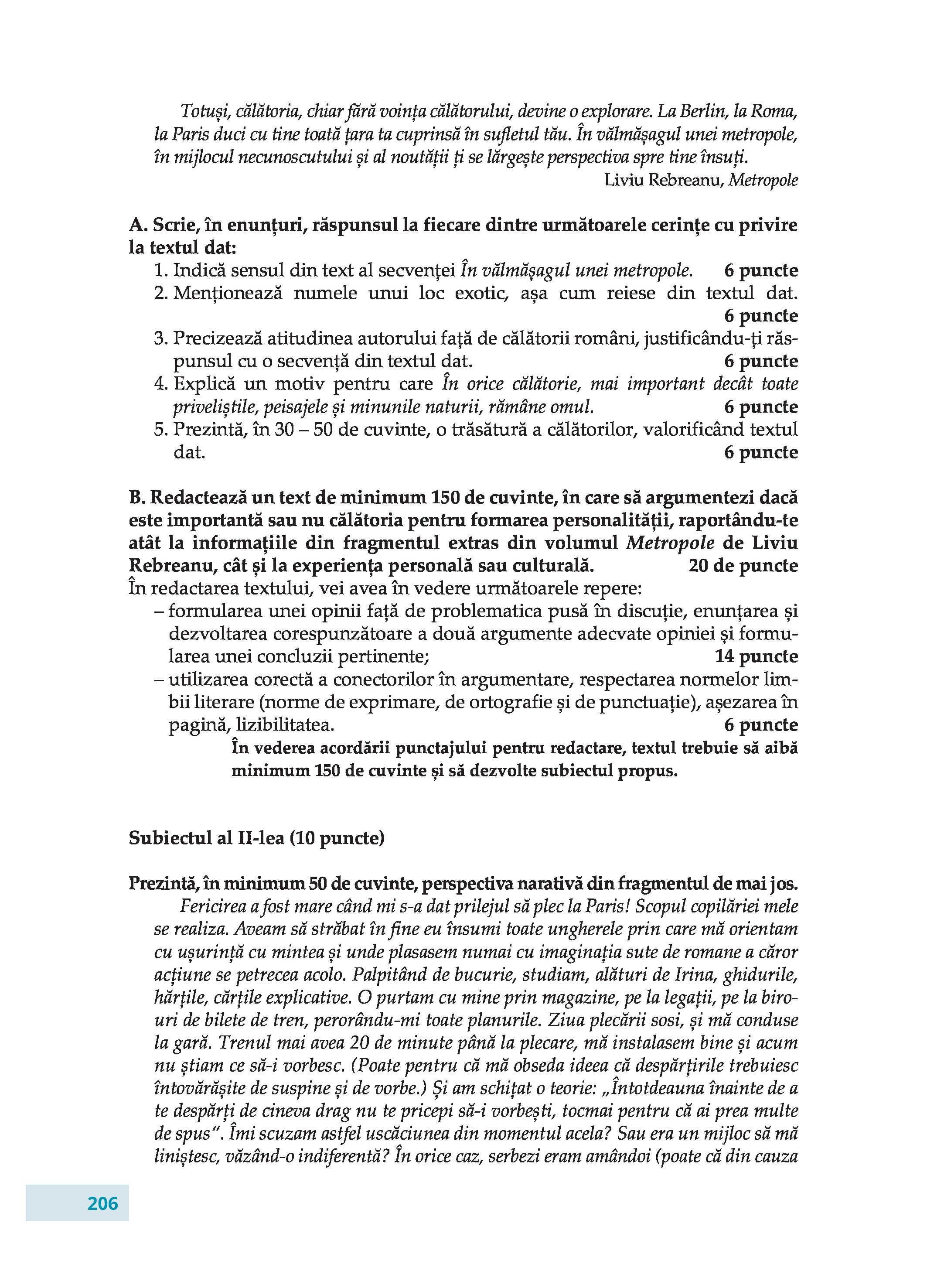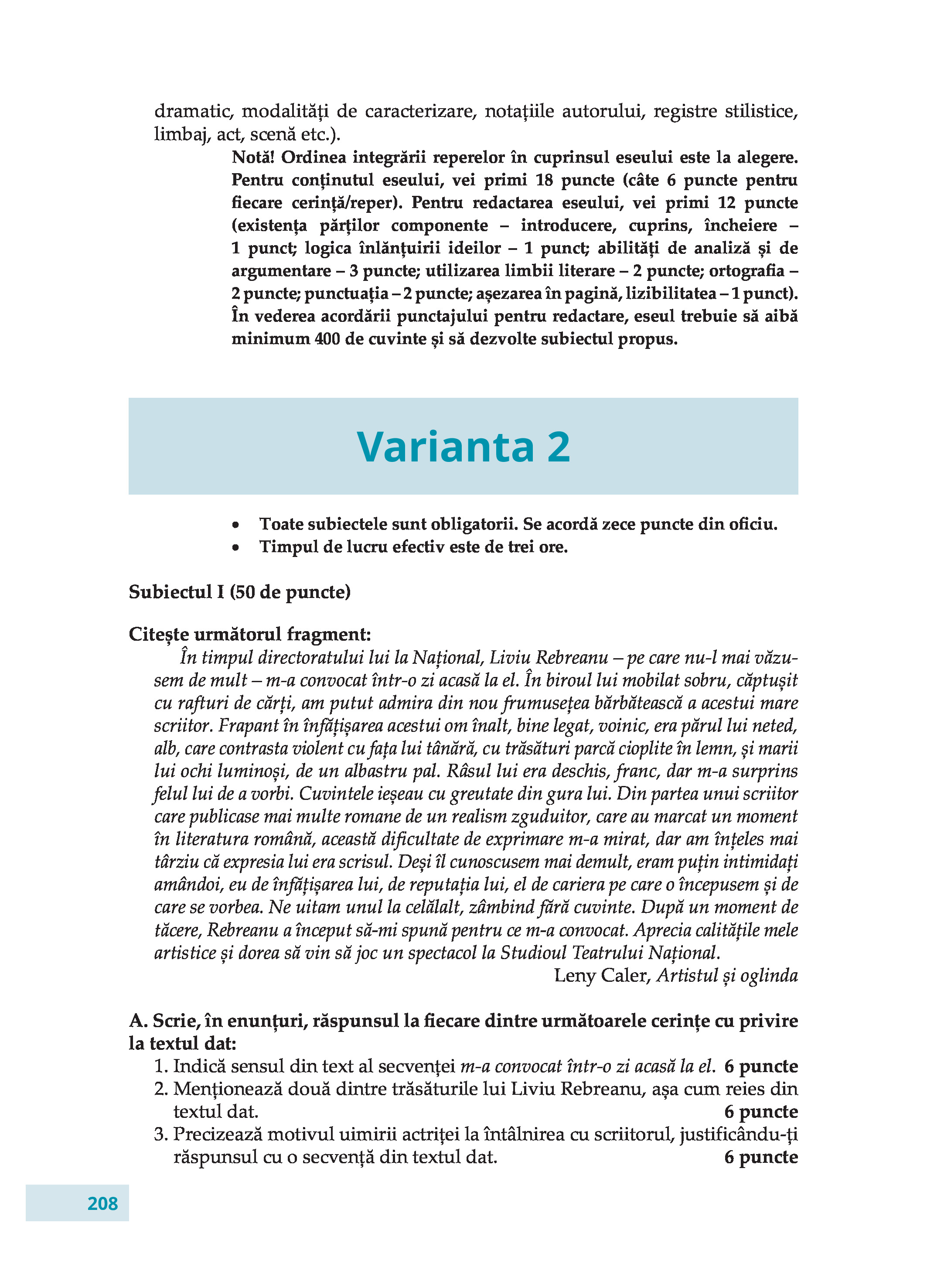 • Subiectul al II-lea (10 puncte), de tip întrebare cu răspuns scurt, foloseşte ca suport un text literar la prima vedere (epic, liric sau dramatic). Subiectele I şi al II-lea sunt comune tuturor filierelor, profilurilor şi specializărilor.Lucrarea a fost avizată de Ministerul Educaţiei şi Cercetării prin Ordinul nr. 6250/21.12.2020 şi se regăseşte la poziţia nr. 19 din anexa Ordinului.