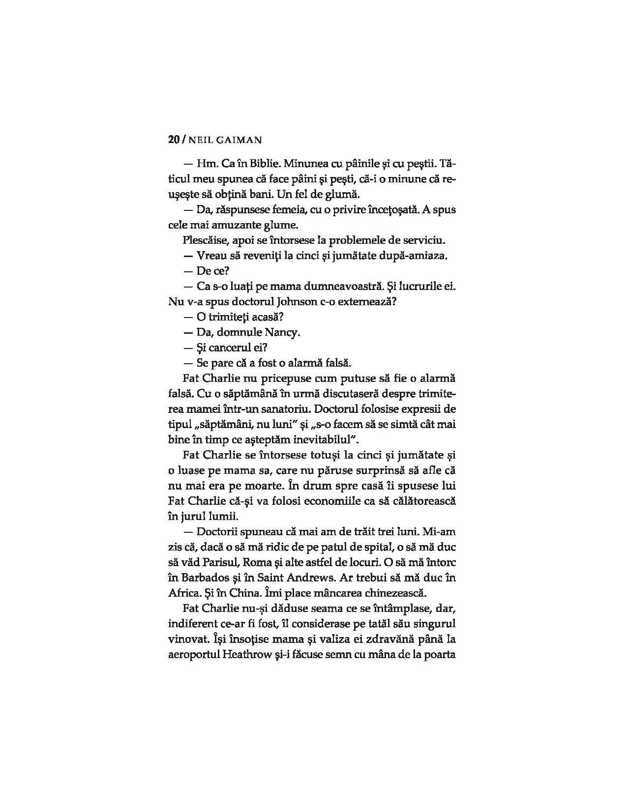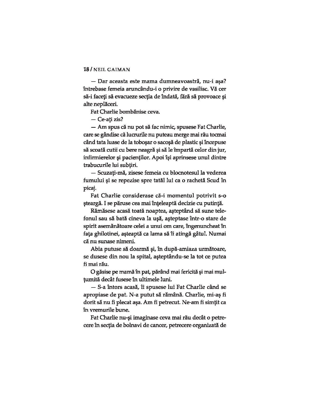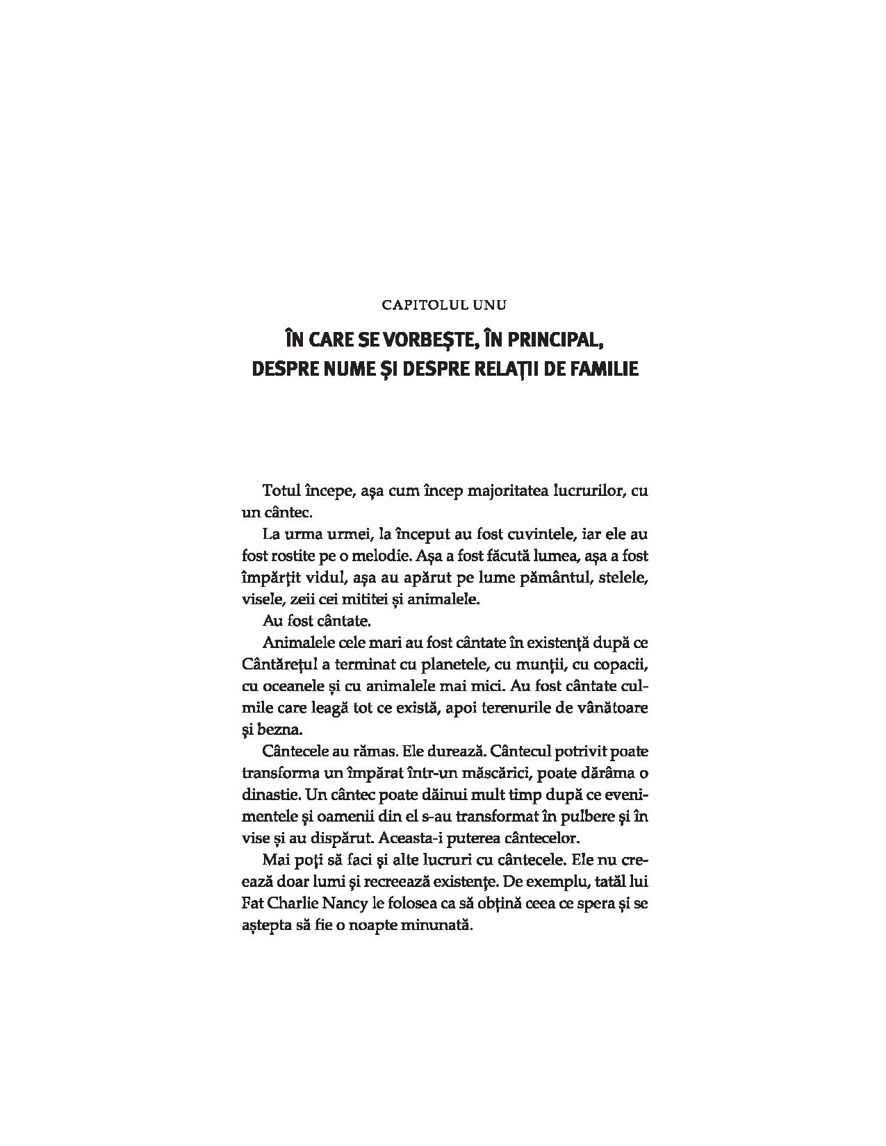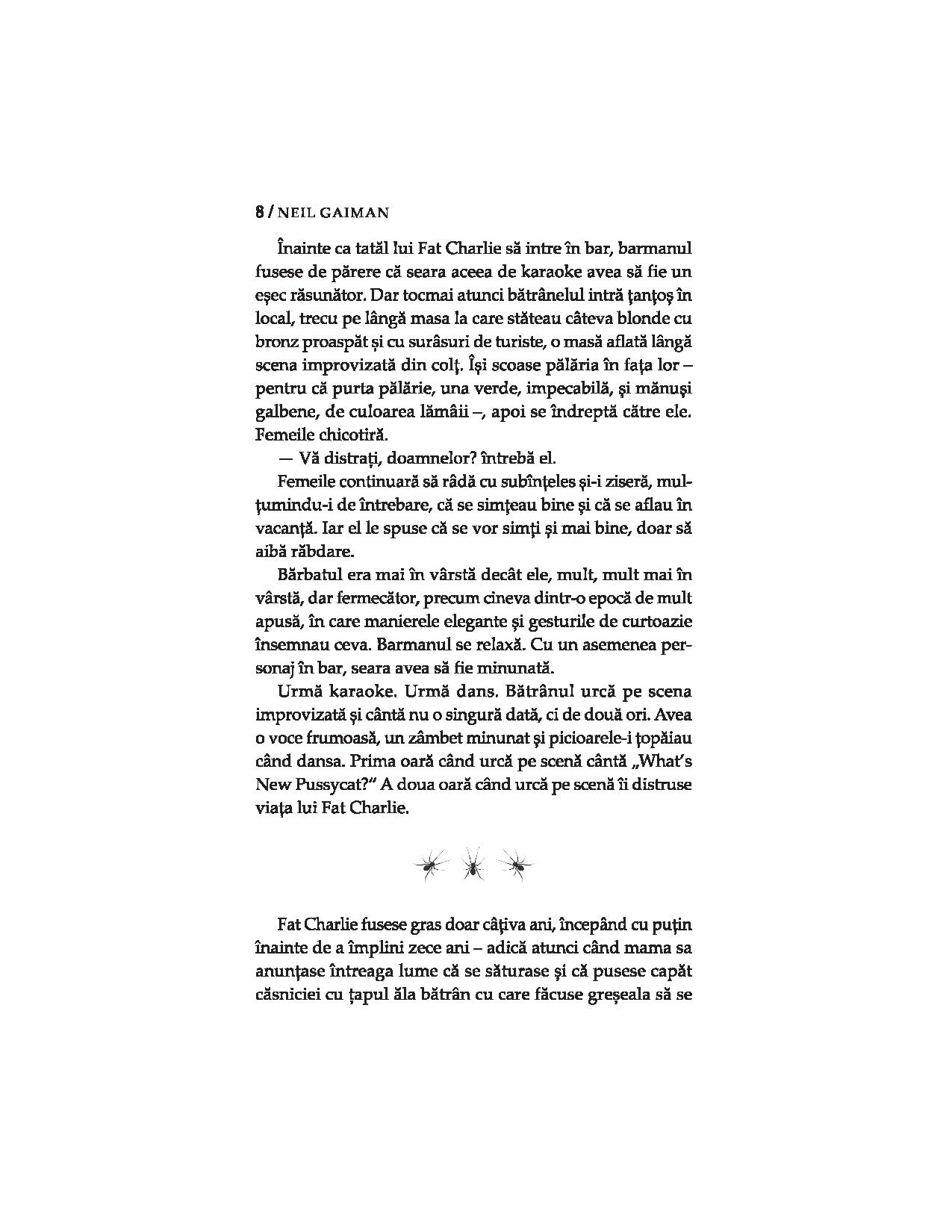 Viața lui Fat Charlie nu va mai fi niciodată la fel. Odată cu decesul tatălui său, el descoperă atât că acesta fusese de fapt zeul Anansi, cât și că are un frate despre care nu știuse nimic niciodată, Spider – care este tot ceea ce Fat Charlie nu poate fi: atrăgător, isteț și amuzant. Într-o lume magică a zeilor-animale, Fat Charlie descoperă însă că are o putere ce-l poate ajuta să descurce ițele existenței sale tot mai încurcate.