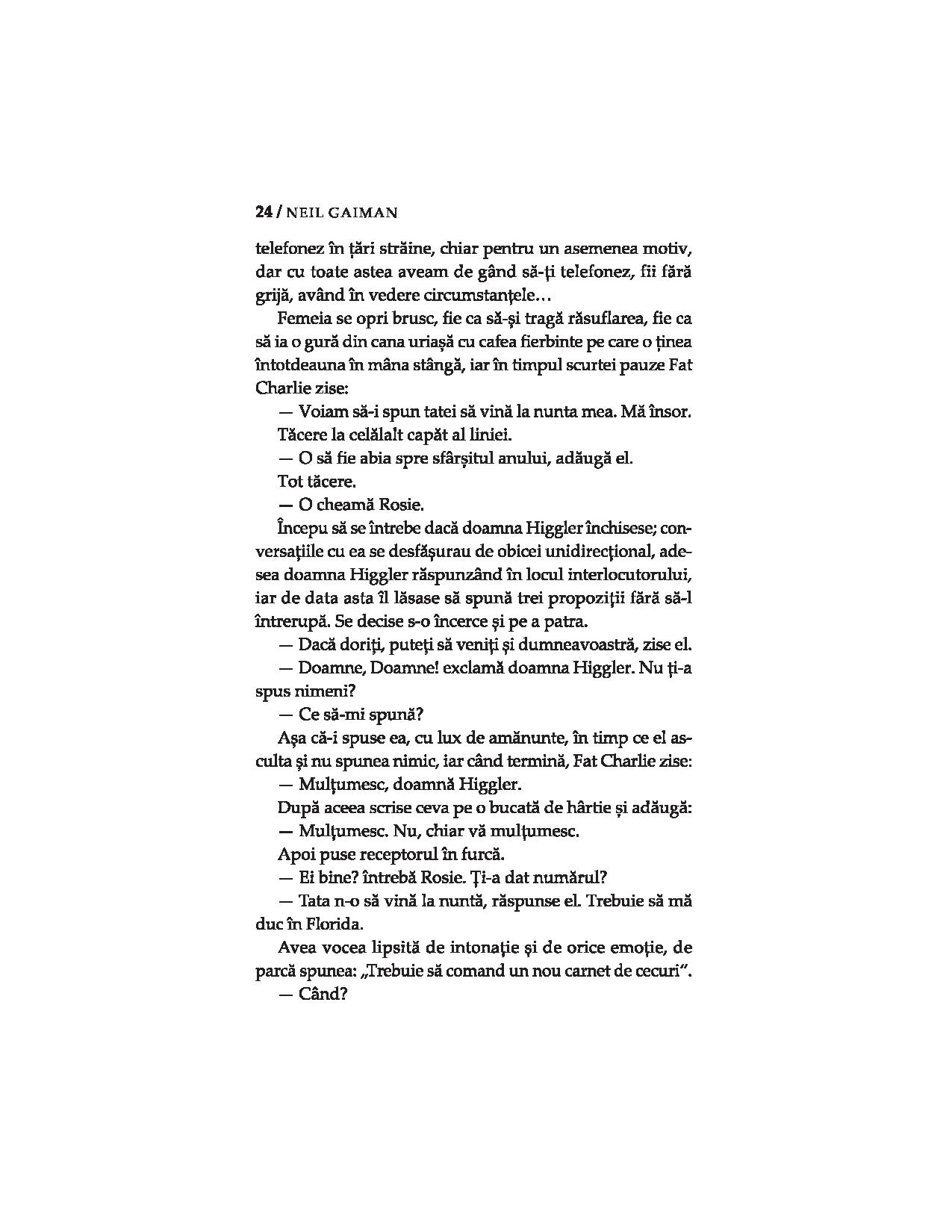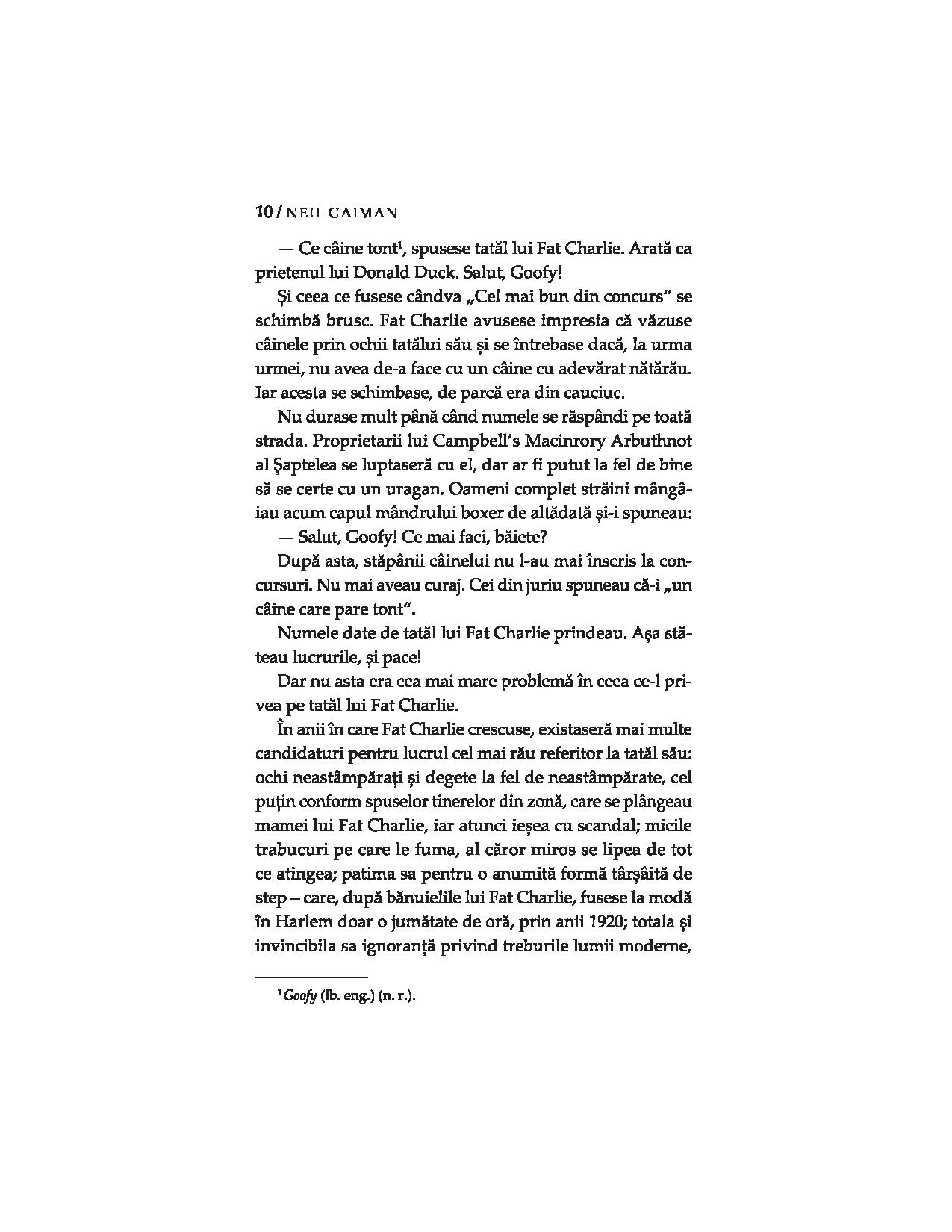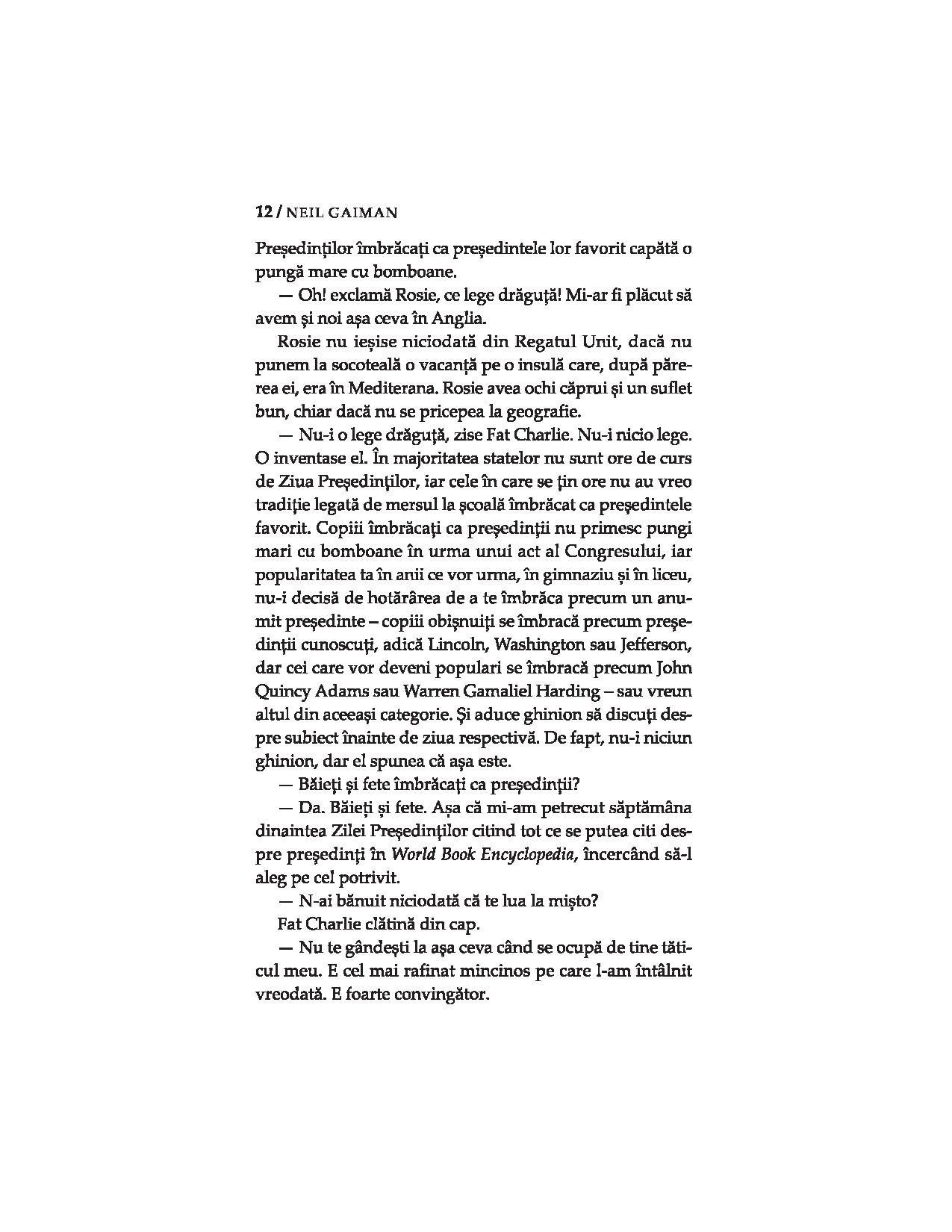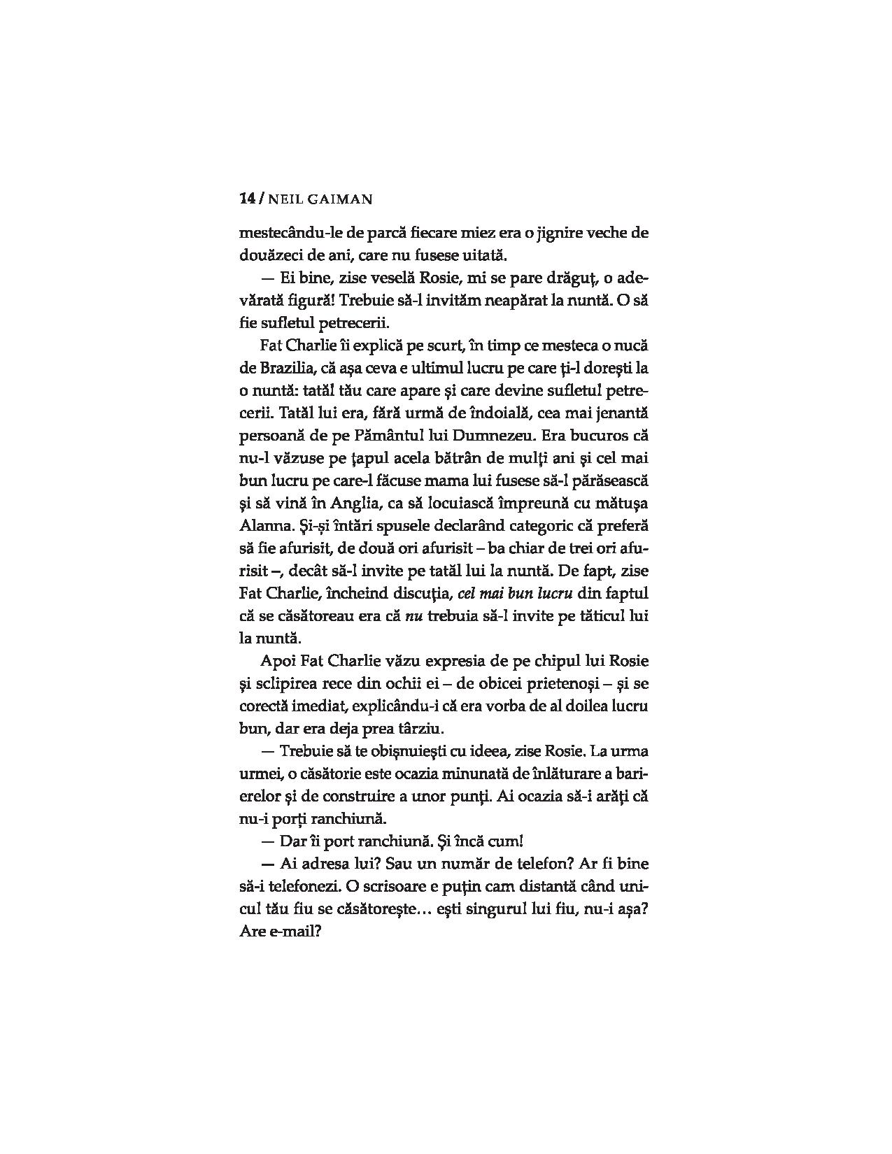 Viața lui Fat Charlie nu va mai fi niciodată la fel. Odată cu decesul tatălui său, el descoperă atât că acesta fusese de fapt zeul Anansi, cât și că are un frate despre care nu știuse nimic niciodată, Spider – care este tot ceea ce Fat Charlie nu poate fi: atrăgător, isteț și amuzant. Într-o lume magică a zeilor-animale, Fat Charlie descoperă însă că are o putere ce-l poate ajuta să descurce ițele existenței sale tot mai încurcate.