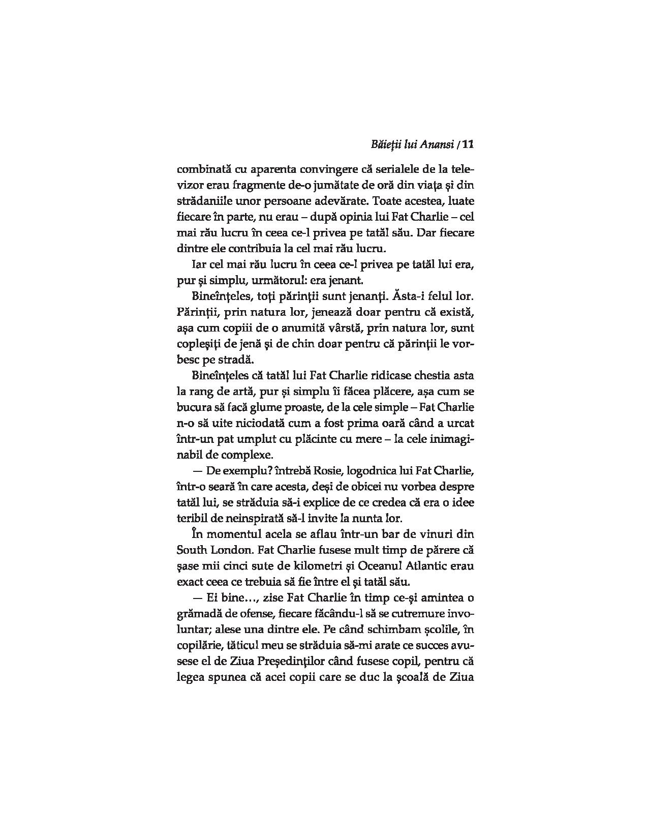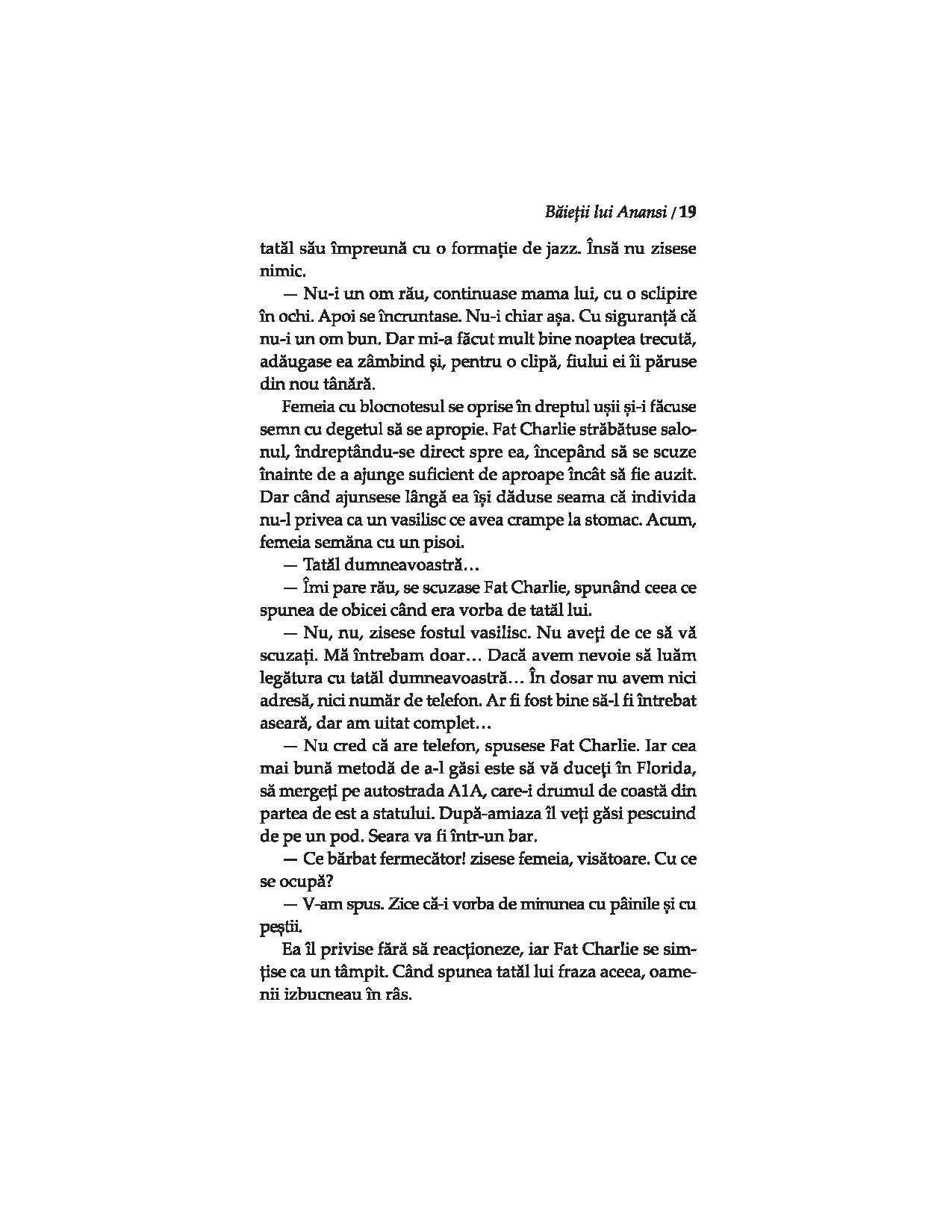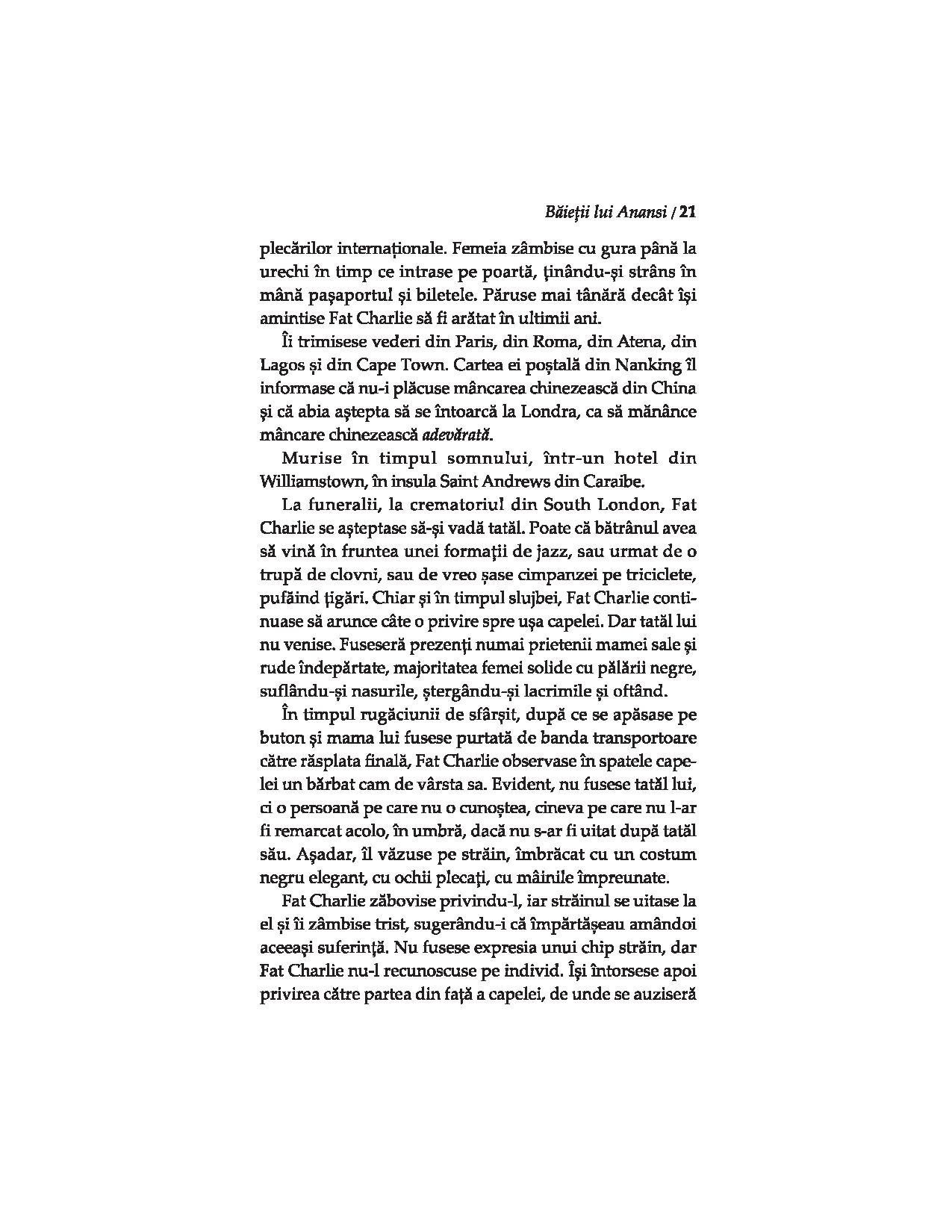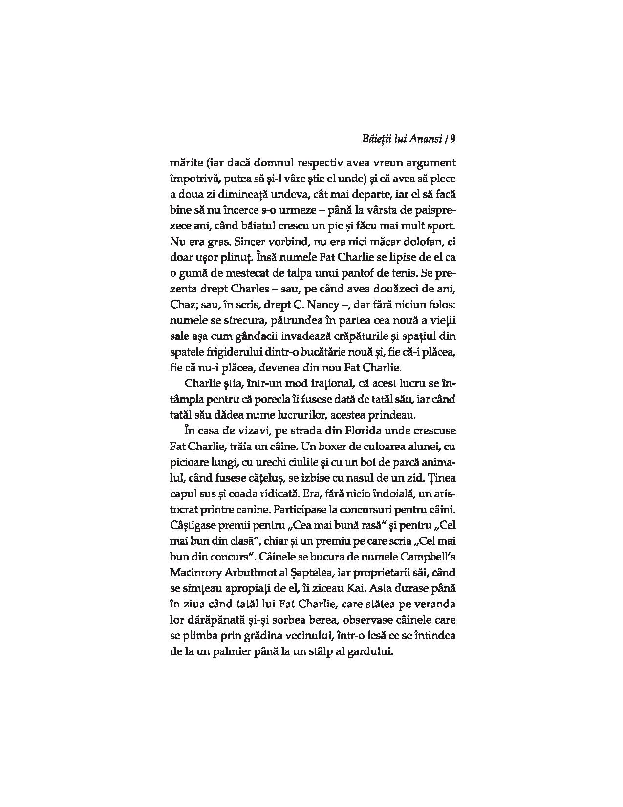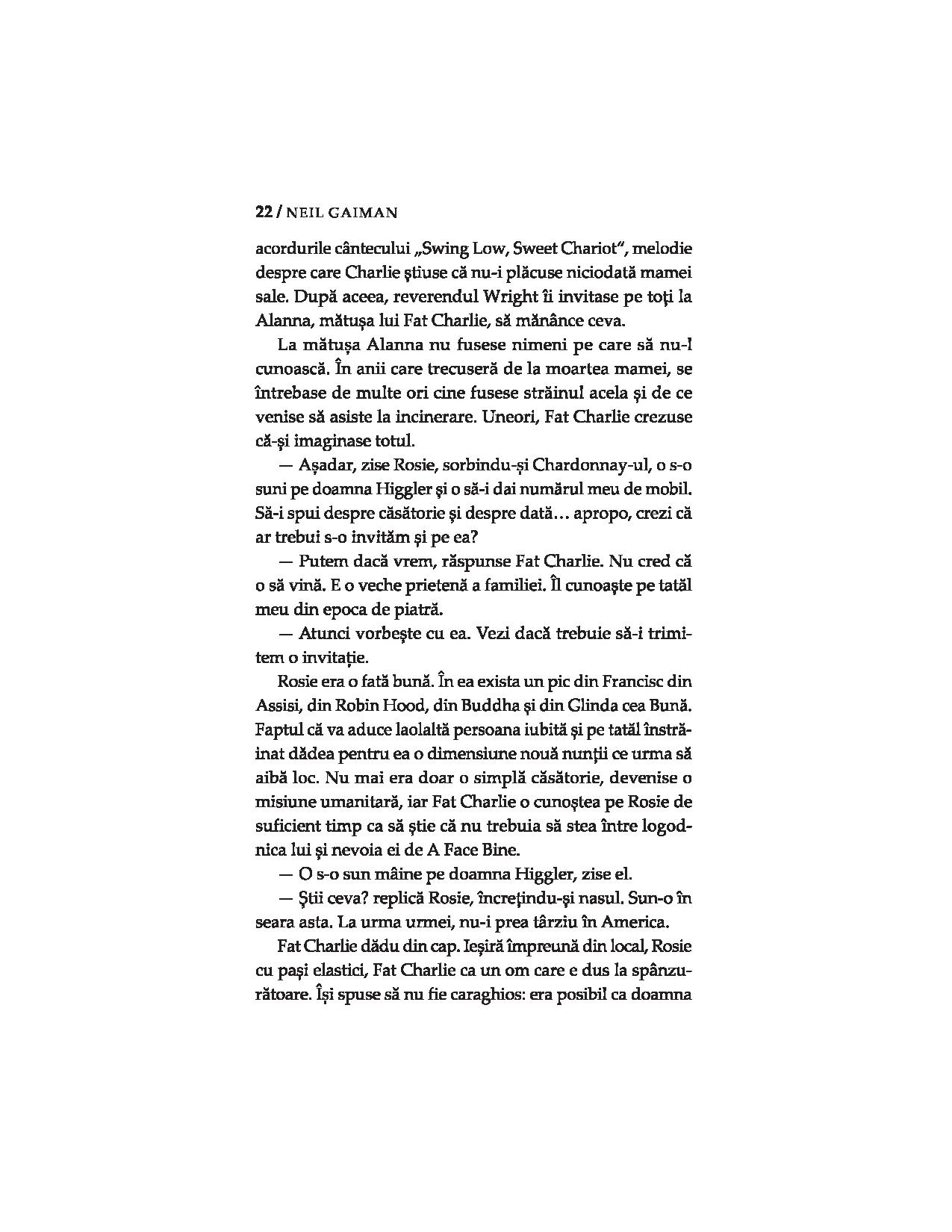Viața lui Fat Charlie nu va mai fi niciodată la fel. Odată cu decesul tatălui său, el descoperă atât că acesta fusese de fapt zeul Anansi, cât și că are un frate despre care nu știuse nimic niciodată, Spider – care este tot ceea ce Fat Charlie nu poate fi: atrăgător, isteț și amuzant. Într-o lume magică a zeilor-animale, Fat Charlie descoperă însă că are o putere ce-l poate ajuta să descurce ițele existenței sale tot mai încurcate.