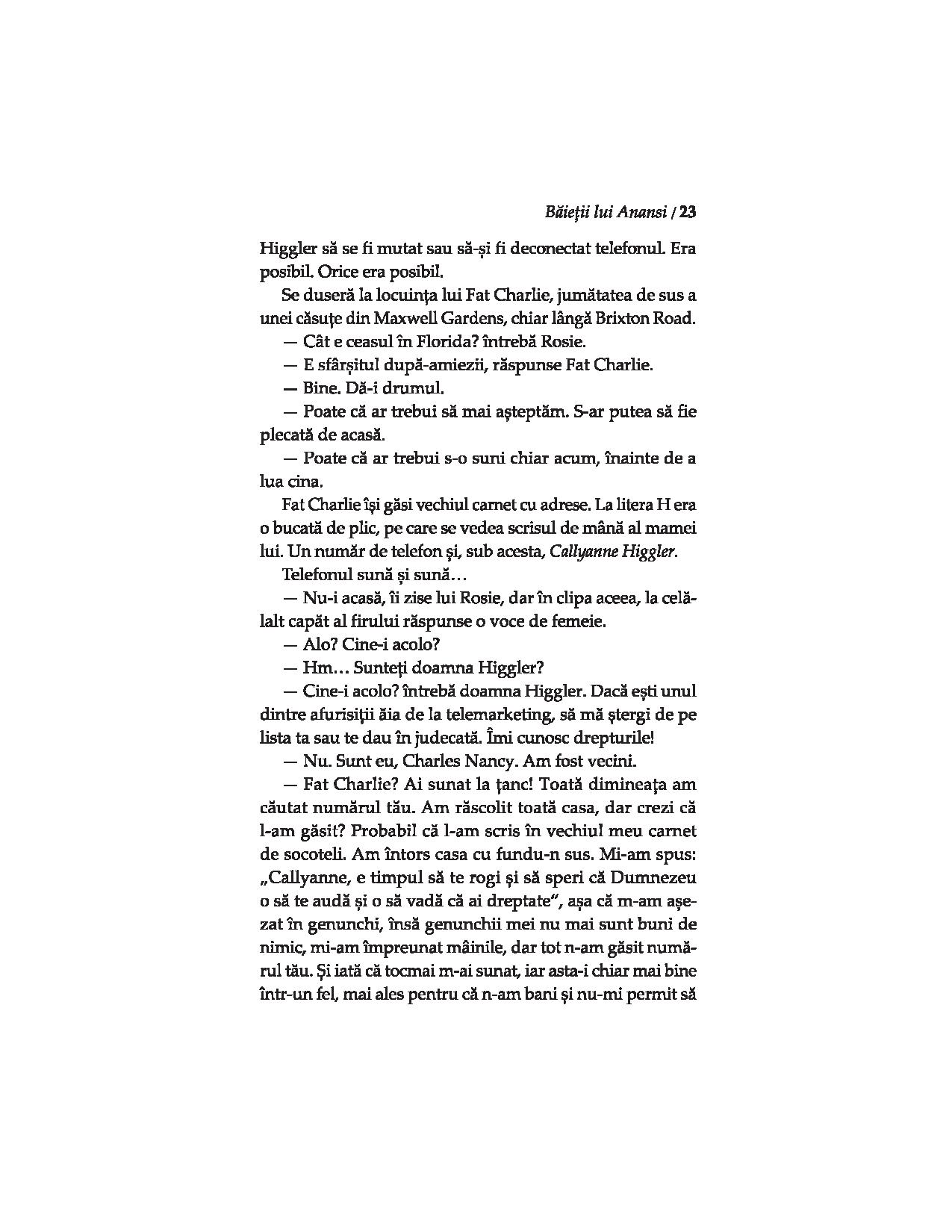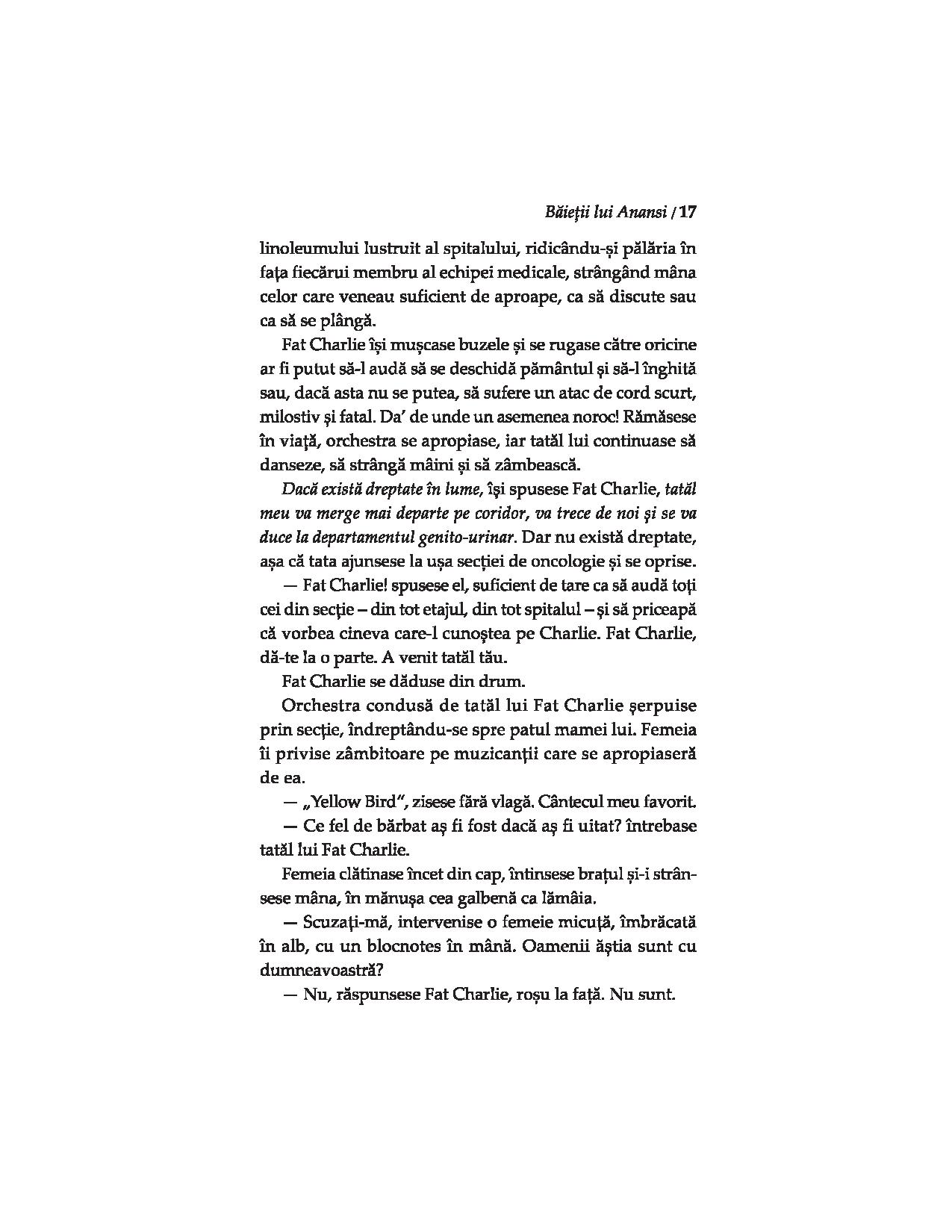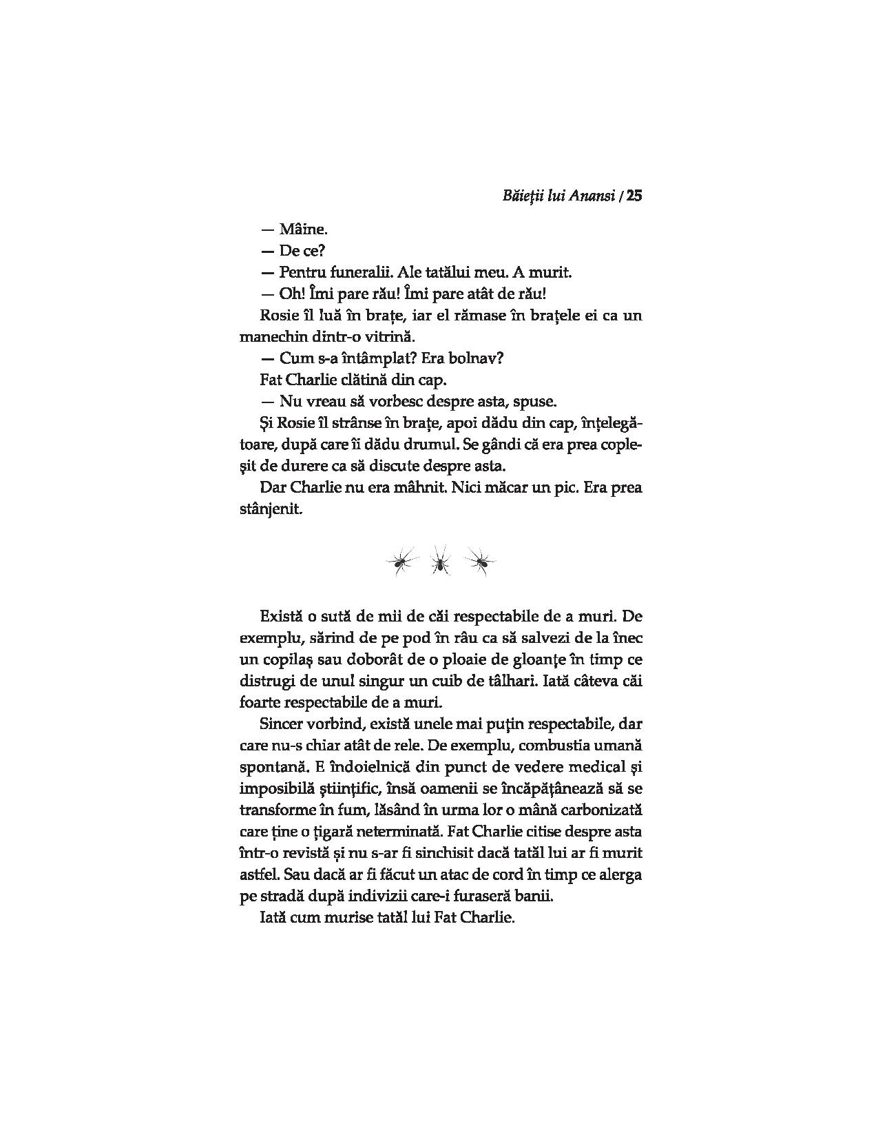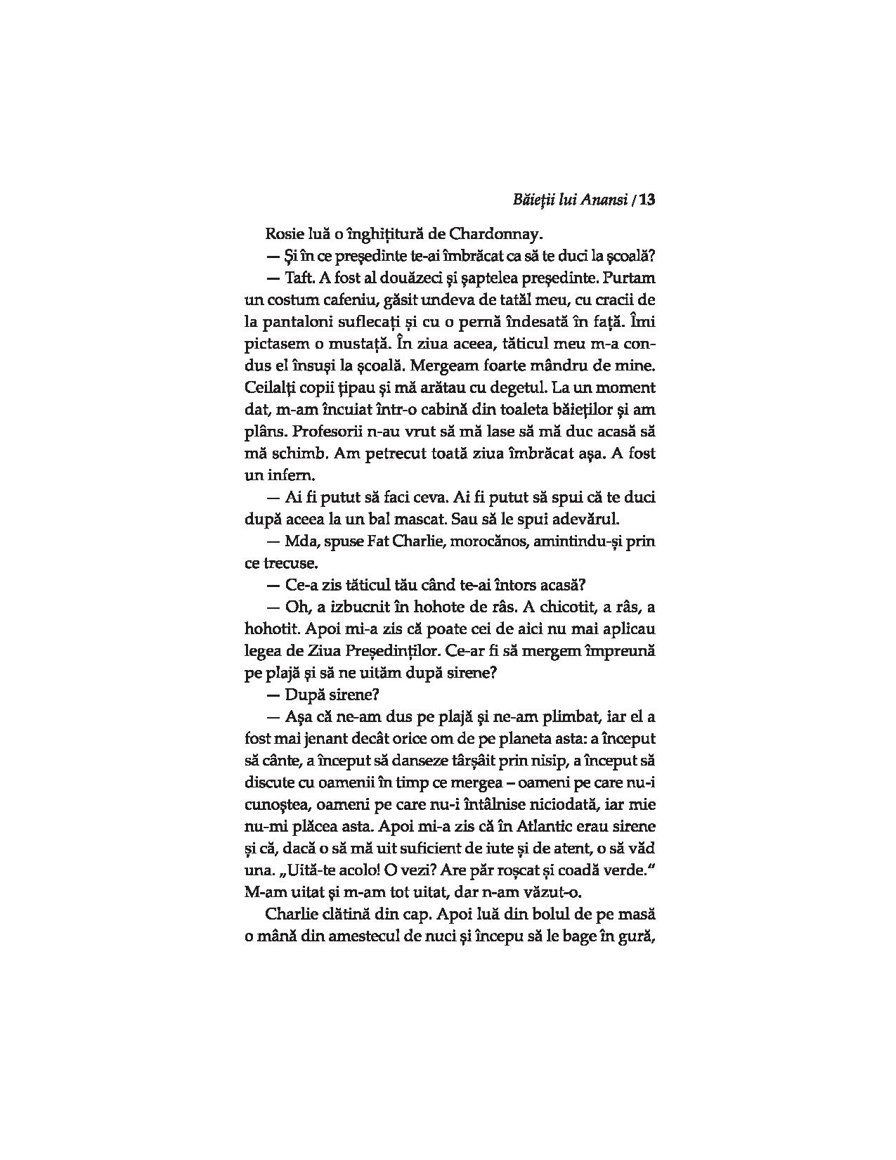 Viața lui Fat Charlie nu va mai fi niciodată la fel. Odată cu decesul tatălui său, el descoperă atât că acesta fusese de fapt zeul Anansi, cât și că are un frate despre care nu știuse nimic niciodată, Spider – care este tot ceea ce Fat Charlie nu poate fi: atrăgător, isteț și amuzant. Într-o lume magică a zeilor-animale, Fat Charlie descoperă însă că are o putere ce-l poate ajuta să descurce ițele existenței sale tot mai încurcate.