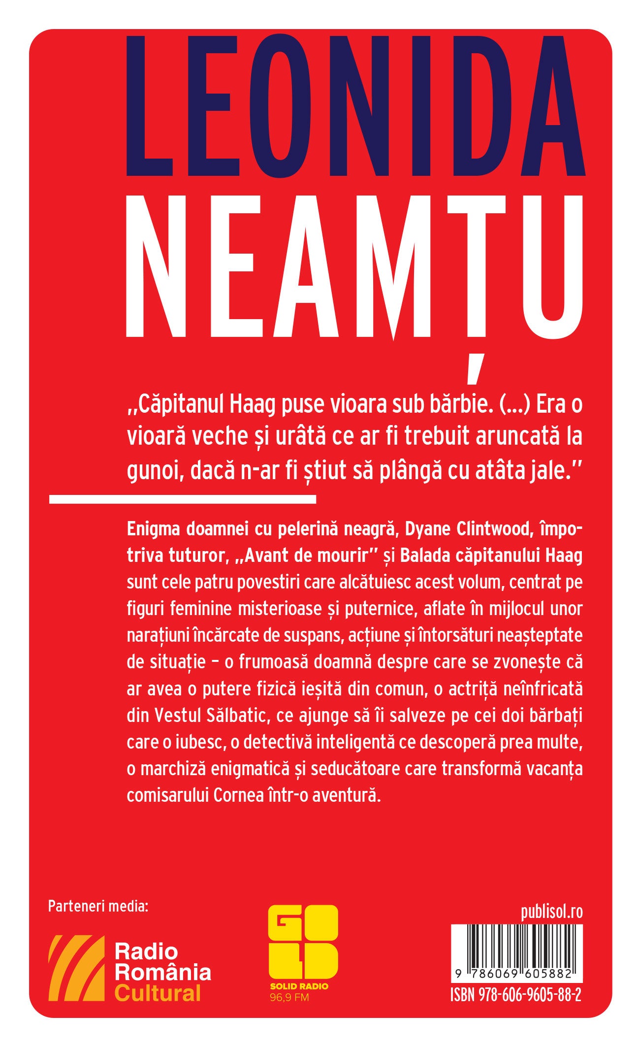 Enigma doamnei cu pelerina neagra, Dyane Clintwood, impotriva tuturor, Avant de mourir si Balada Capitanului Haag sunt cele patru povestiri care alcatuiesc acest volum de Leonida Neamtu, centrat pe figuri feminine misterioase si puternice, aflate in mijlocul unor naratiuni incarcate de suspans, actiune si intorsaturi neasteptate de situatie.