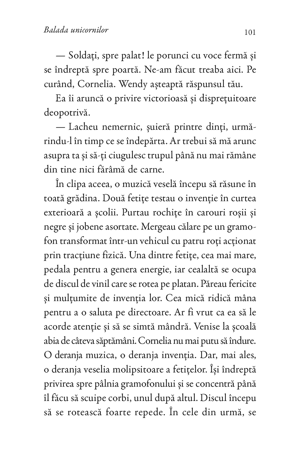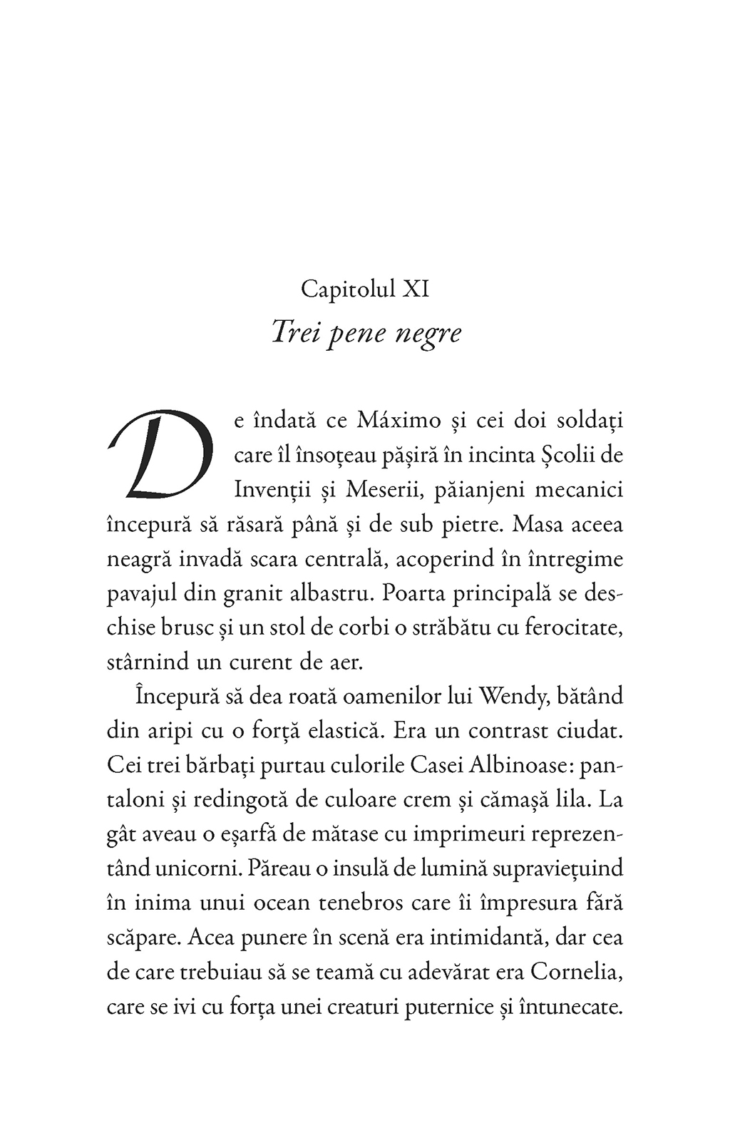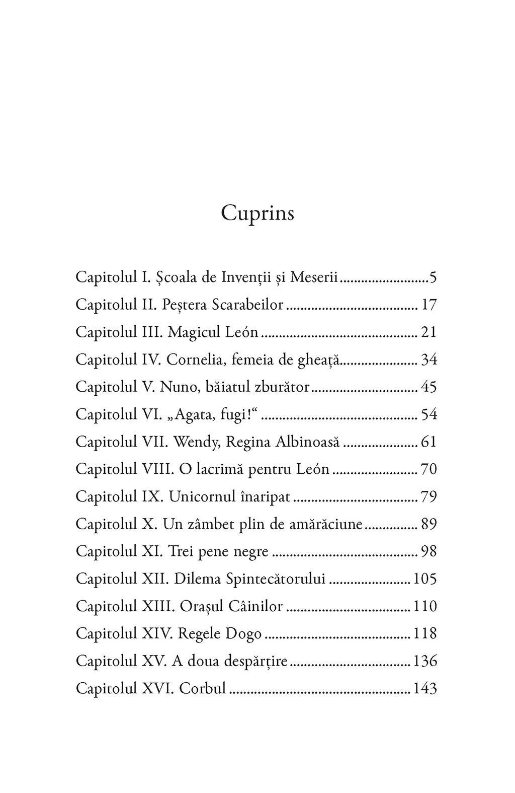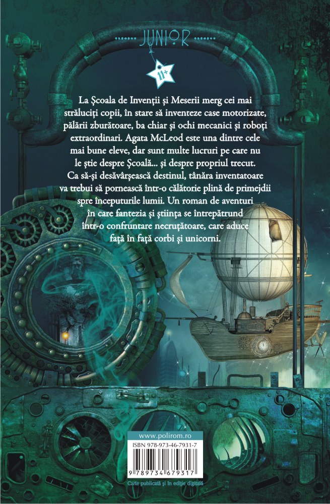 La Școala de Invenţii și Meserii merg cei mai străluciţi copii, în stare să inventeze case motorizate, pălării zburătoare, ba chiar și ochi mecanici și roboţi extraordinari. Agata McLeod este una dintre cele mai bune eleve, dar sînt multe lucruri pe care nu le știe despre Școală... și despre propriul trecut. Ca să-și desăvîrșească destinul, tînăra inventatoare va trebui să pornească într-o călătorie plină de primejdii spre începuturile lumii. Un roman de aventuri în care fantezia și știinţa se întrepătrund într-o confruntare necruţătoare, care aduce faţă în faţă corbi și unicorni.