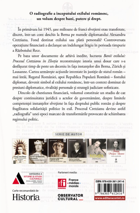 Pe baza unor documente de arhivă inedite, lucrarea Banii exilului. Procesul Cretzianu în Elveția reconstruiește istoria unui dosar care s-a desfășurat timp de peste un deceniu în fața instanțelor din Berna, Zürich și Lausanne.