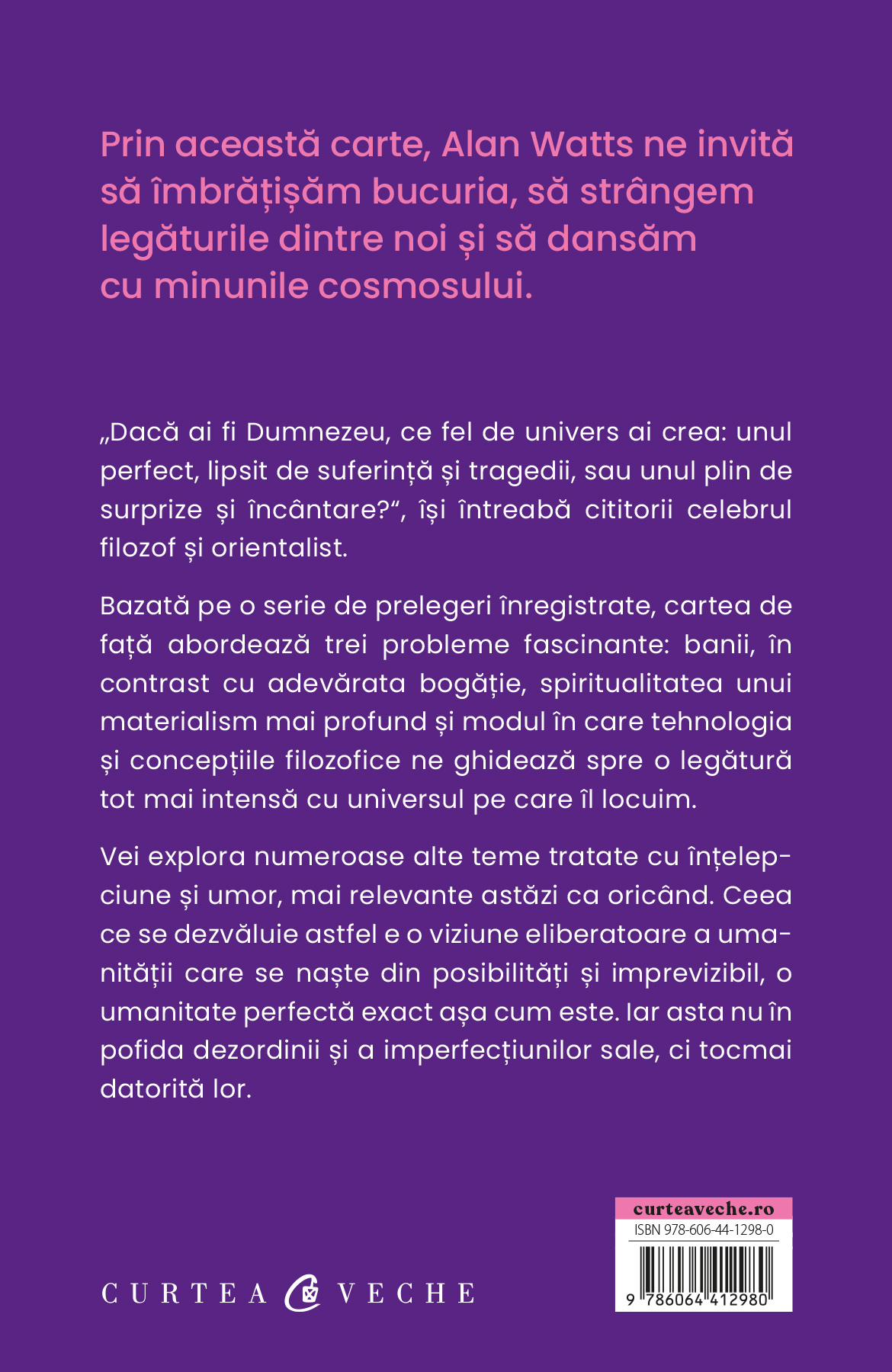 Bazată pe o serie de prelegeri înregistrate, cartea de față abordează trei probleme fascinante: banii. în contrast cu adevărata bogăție, spiritualitatea unui materialism mai profund și modul în care tehnologia și concepțiile filozofice ne ghidează spre o legătură tot mai intensă cu universul pe care îl locuim.