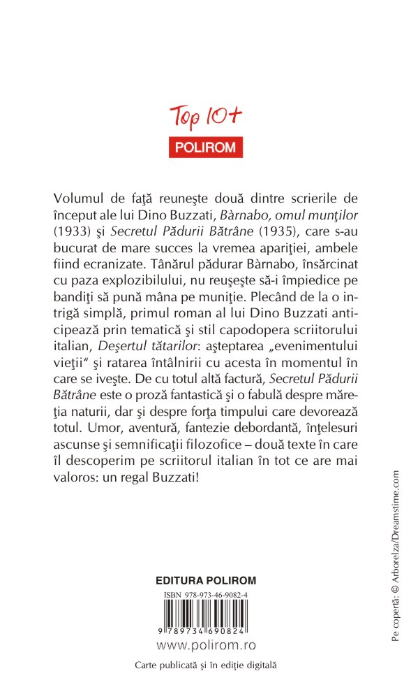 Volumul de faţă reuneşte două dintre scrierile de început ale lui Dino Buzzati, Bàrnabo, omul munţilor (1933) şi Secretul Pădurii Bătrâne (1935), care s-au bucurat de mare succes la vremea apariţiei, ambele fiind ecranizate. Tânărul pădurar Bàrnabo, însărcinat cu paza explozibilului, nu reuşeşte să-i împiedice pe bandiţi să pună mâna pe muniţie. Plecând de la o intrigă simplă, primul roman al lui Dino Buzzati anticipează prin tematică şi stil capodopera scriitorului italian, Deşertul tătarilor: aşteptarea „evenimentului vieţii” şi ratarea întâlnirii cu acesta în momentul în care se iveşte. De cu totul altă factură, Secretul Pădurii Bătrâne este o proză fantastică şi o fabulă despre măreţia naturii, dar şi despre forţa timpului care devorează totul. Umor, aventură, fantezie debordantă, înţelesuri ascunse şi semnificaţii filozofice – două texte în care îl descoperim pe scriitorul italian în tot ce are mai valoros: un regal Buzzati!