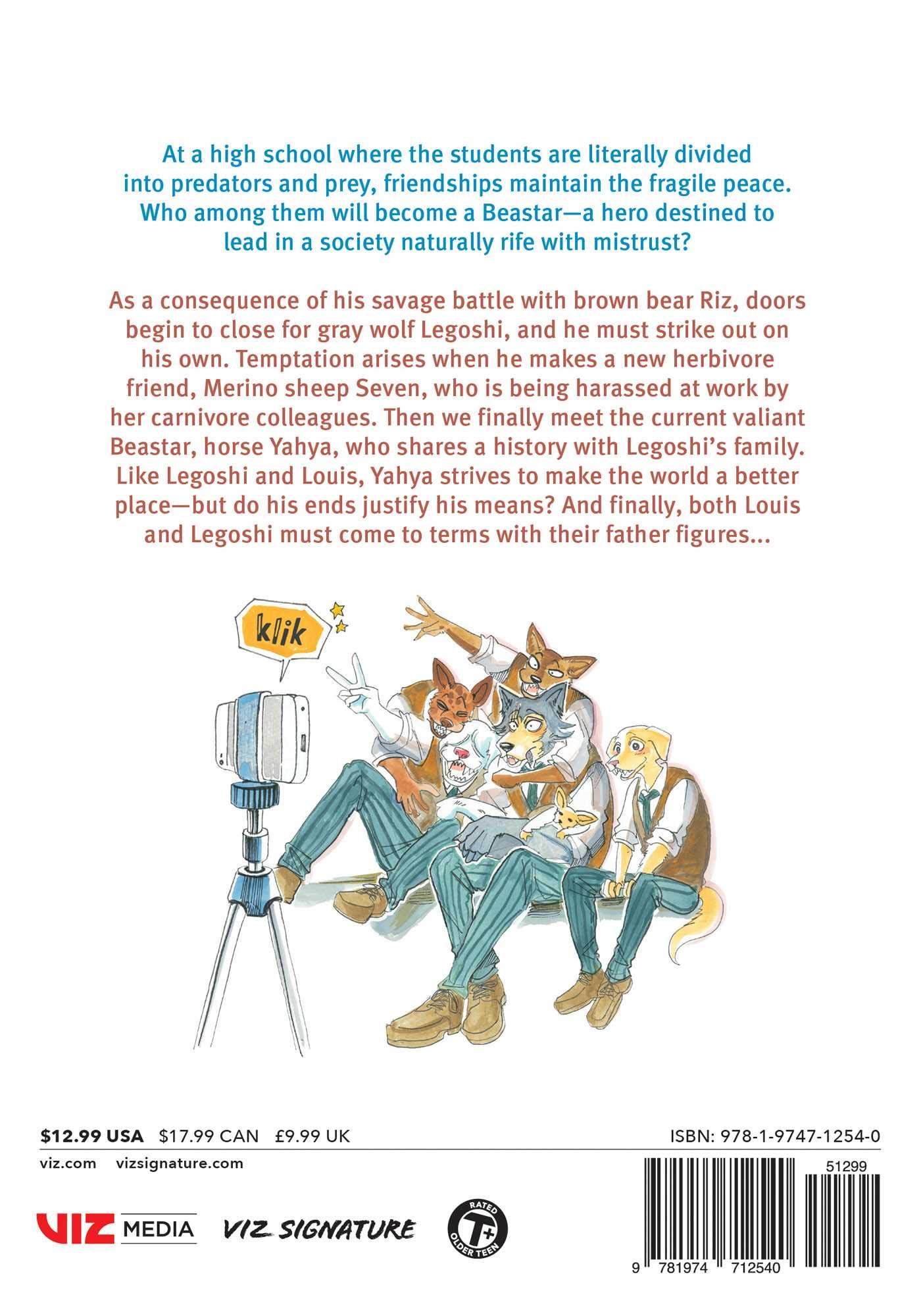 As a consequence of his savage battle with brown bear Riz, doors begin to close for gray wolf Legoshi, and he must strike out on his own. Temptation arises when he makes a new herbivore friend, Merino sheep Seven, who is being harassed at work by her carnivore colleagues. Then we finally meet the current valiant Beastar, horse Yahya, who shares a history with Legoshi’s family. Like Legoshi and Louis, Yahya strives to make the world a better place—but do his ends justify his means? And finally, both Louis and Legoshi must come to terms with their father figures…