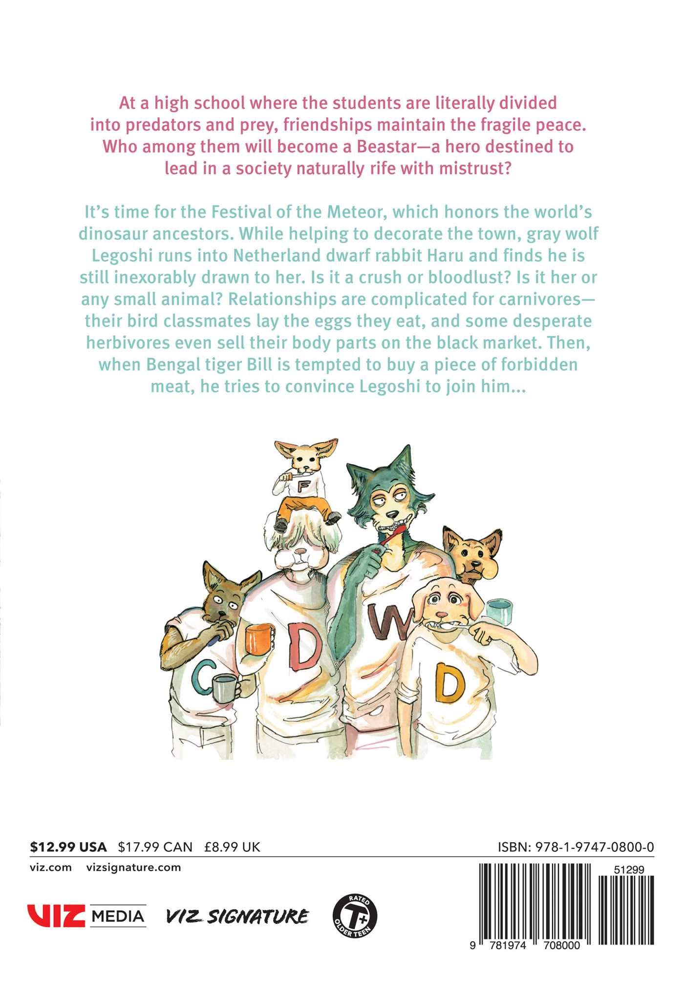 It’s time for the Meteor Festival, which honors the world’s dinosaur ancestors. While helping to decorate the town, gray wolf Legoshi runs into dwarf rabbit Haru and finds he is still inexorably drawn to her. Is it a crush or bloodlust? Is it her or any small animal? Relationships are complicated for carnivores—their bird classmates lay the eggs they eat, and some desperate herbivores even sell their body parts on the black market. Then, when Bengal tiger Bill is tempted to buy a piece of forbidden meat, he tries to convince Legoshi to join him…