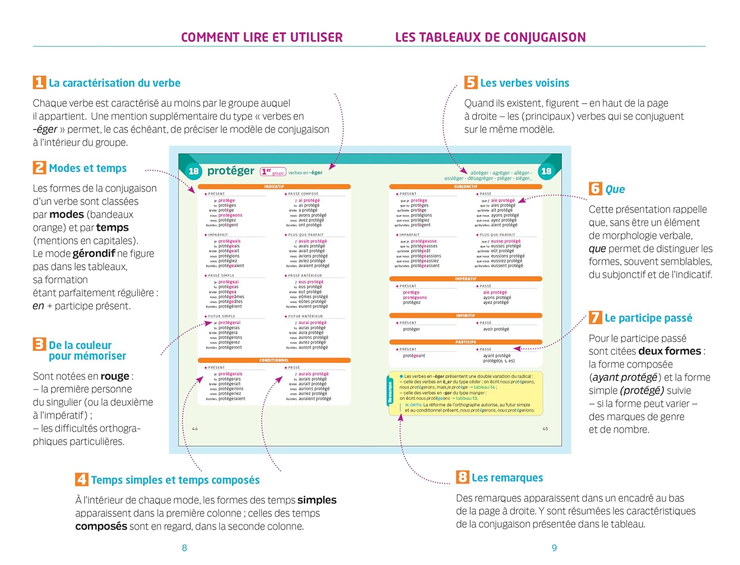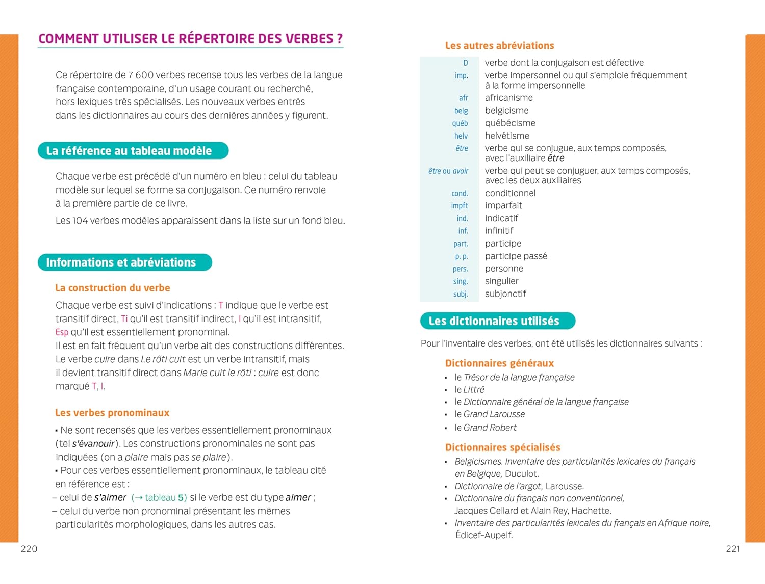 À chacun des 10 000 verbes sont associés des indications sur sa construction et un renvoi au tableau du verbe modèle, qui permet de résoudre immédiatement un problème de conjugaison.