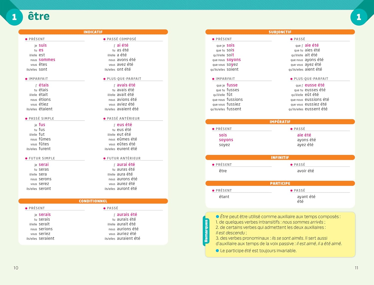 À chacun des 104 verbes modèles de la conjugaison française correspond un tableau clairement structuré, avec l'ensemble des formes simples et composées à la voix active.