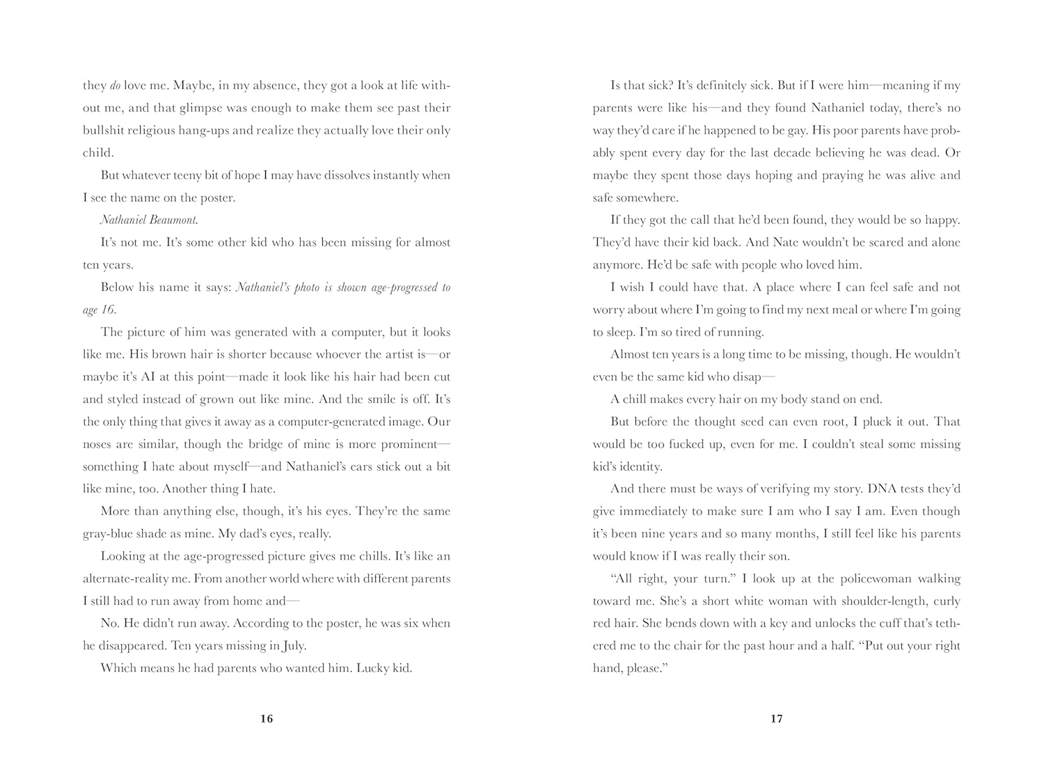 Desperate to escape a family who will never accept him, a queer runaway in police custody borrows the identity of a boy who vanished years ago: Nate Beaumont. But when Nate's family come to take him home, he's trapped in a web of lies.