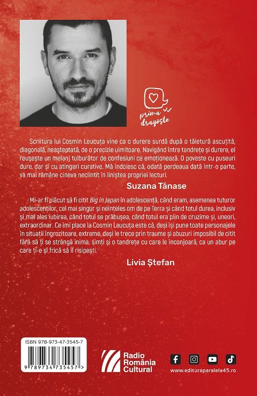 Mi-ar fi plăcut să fi citit Big in Japan în adolescență, când eram, asemenea tuturor adolescenților, cel mai singur și neînțeles om de pe Terra și când totul durea, inclusiv și mai ales iubirea, când totul se prăbușea, când totul era plin de cruzime și, uneori, extraordinar. Ce îmi place la Cosmin Leucuța este că, deși își pune toate personajele în situații îngrozitoare, extreme, deși le trece prin traume și abuzuri imposibil de citit fără să ți se strângă inima, simți și o tandrețe cu care le înconjoară, ca un abur pe care ți-e și frică să îl risipești.