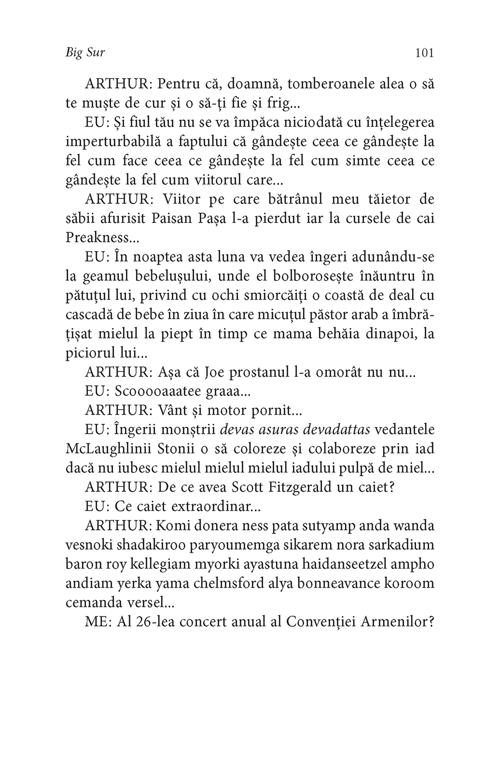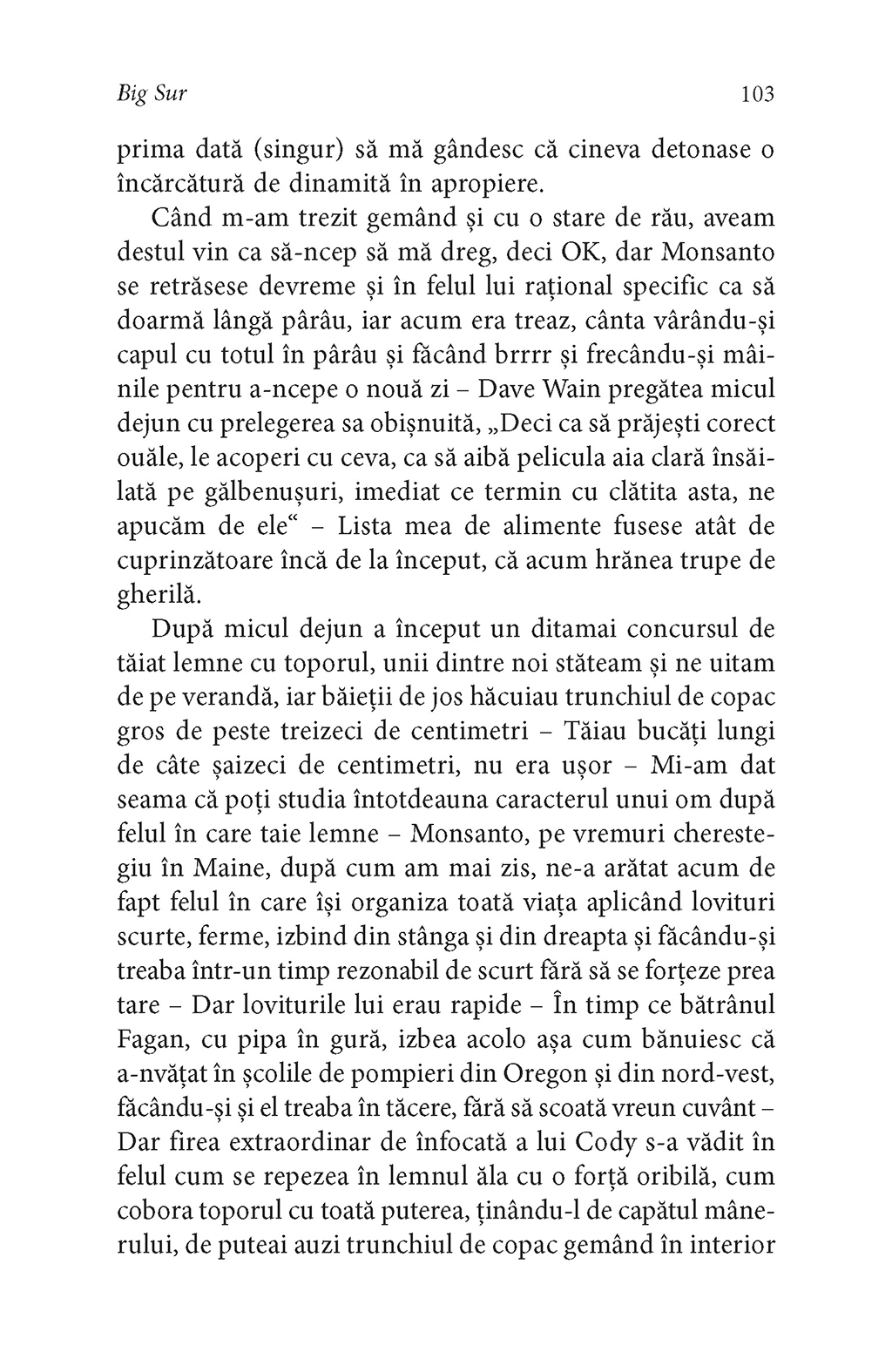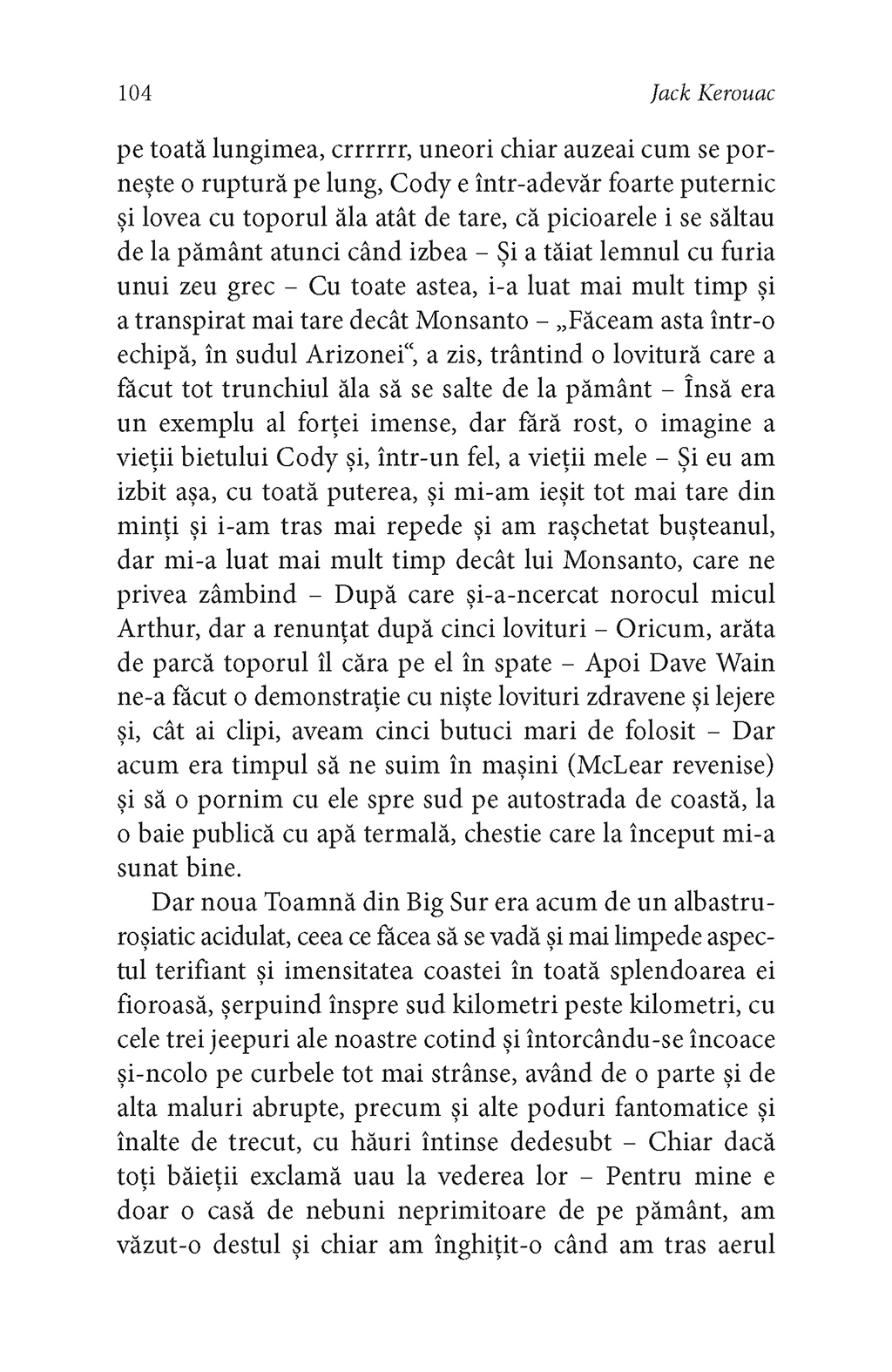 Împreună cu Pe drum, romanul Big Sur este una din creaţiile de vîrf ale lui Jack Kerouac şi un reper pentru viziunea sa asupra vieţii. Cartea relatează una dintre profundele crize existenţiale trăite de alter egoul autorului, Jack Duluoz. Însă în Big Sur, spre deosebire de alte romane ale lui Kerouac, personajul central este un scriitor devenit faimos după publicarea cărţii Pe drum şi care încearcă să scape de gloria proaspăt cucerită de „Rege al Beatnicilor”. Vrînd să evite gloata de admiratori care îl asaltează pînă şi acasă, Jack se retrage la cabana unui prieten de-al său, Lorenzo Monsanto, în pădurile din Big Sur. Numai că, după doar trei săptămîni, e copleşit de singurătate şi de o tulburare nelămurită, ce îl fac să revină în San Francisco. Aici se reîntîlneşte cu vechii săi prieteni, inclusiv cu legendarul Cody, şi intră iarăşi în cunoscuta spirală a petrecerilor, beţiilor şi degradării, căutînd totuşi cu disperare o cale de salvare. Scrisă în doar zece zile, într-un flux narativ ce captivează şi, uneori, copleşeşte şi care se încheie cu un poem-experiment elaborat în timpul şederii scriitorului la cabană, Big Sur este, incontestabil, o carte fundamentală pentru Kerouac şi pentru înţelegerea aşa-numitei „generaţii beat”.