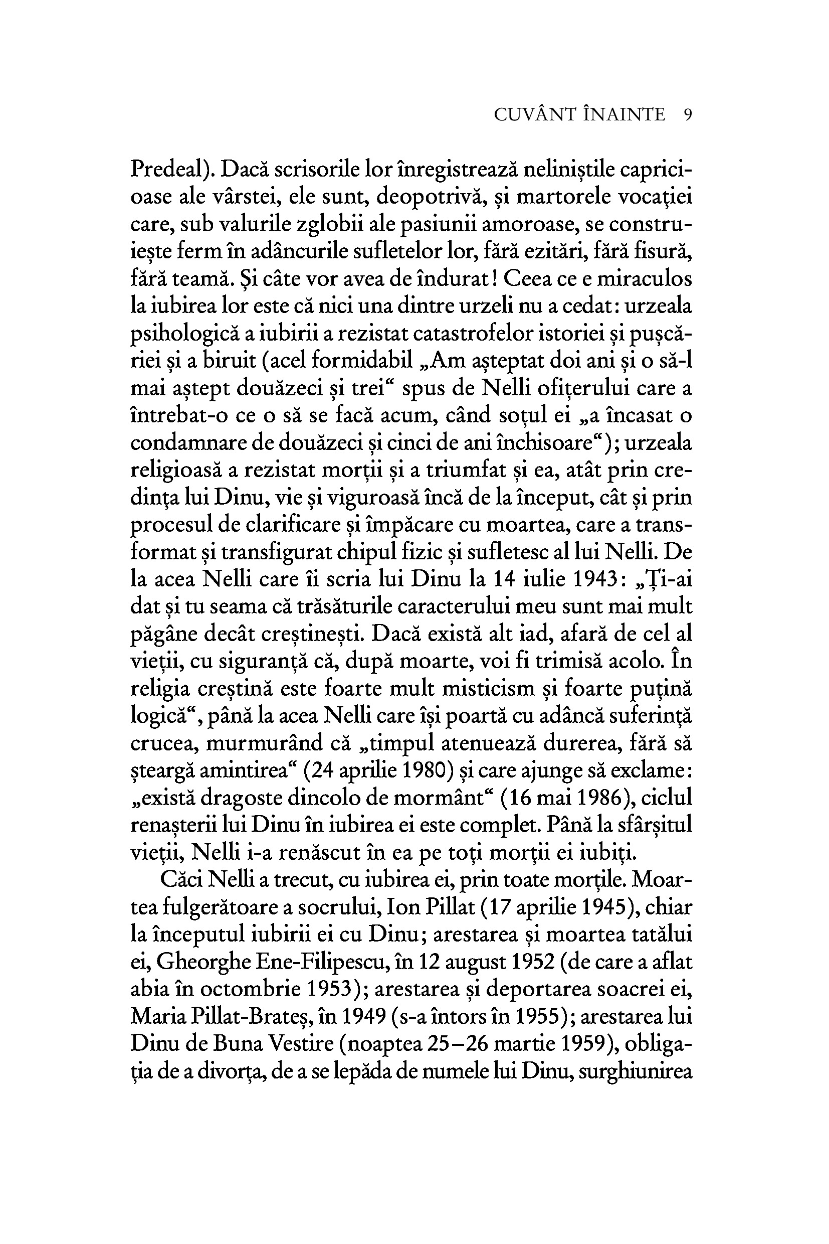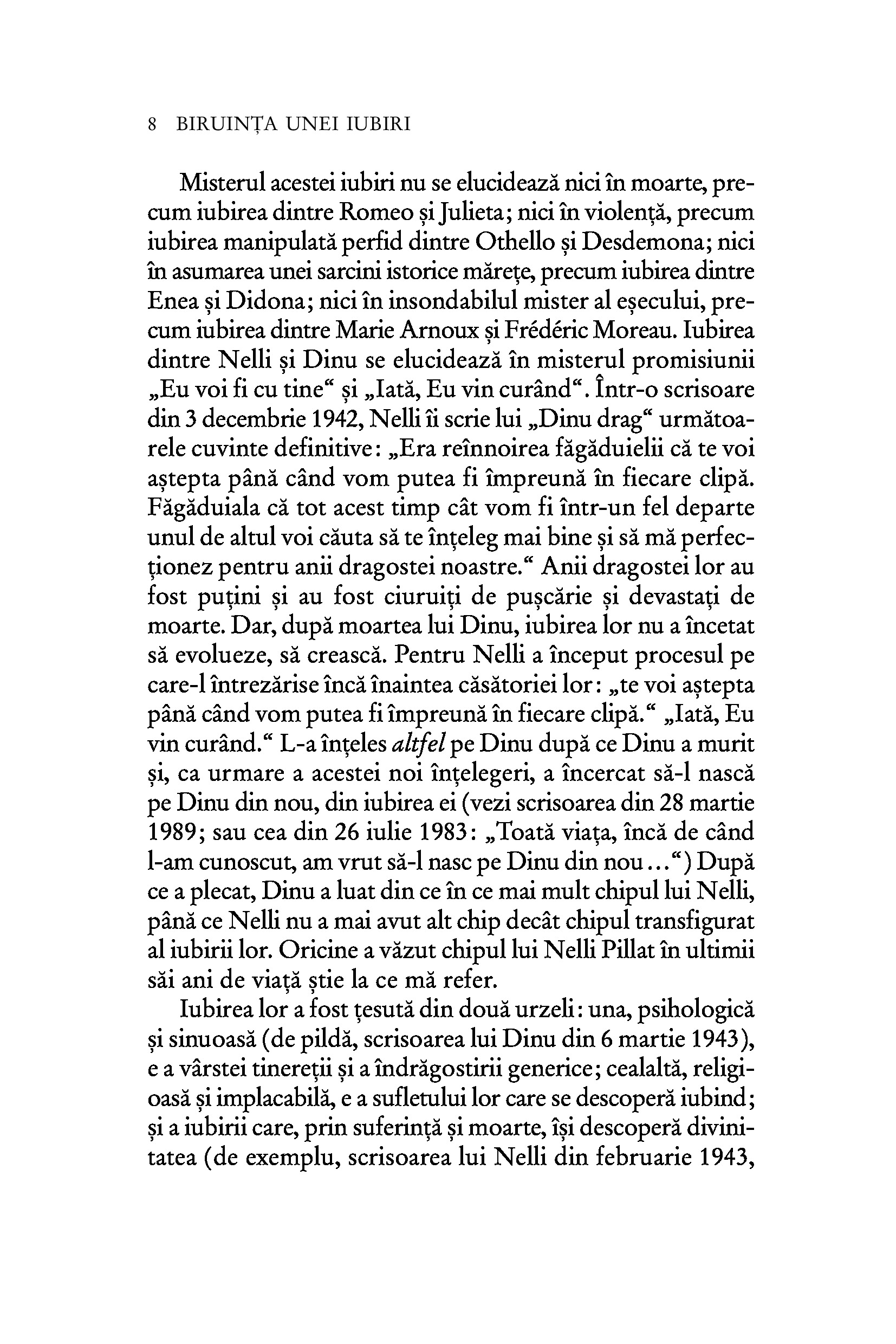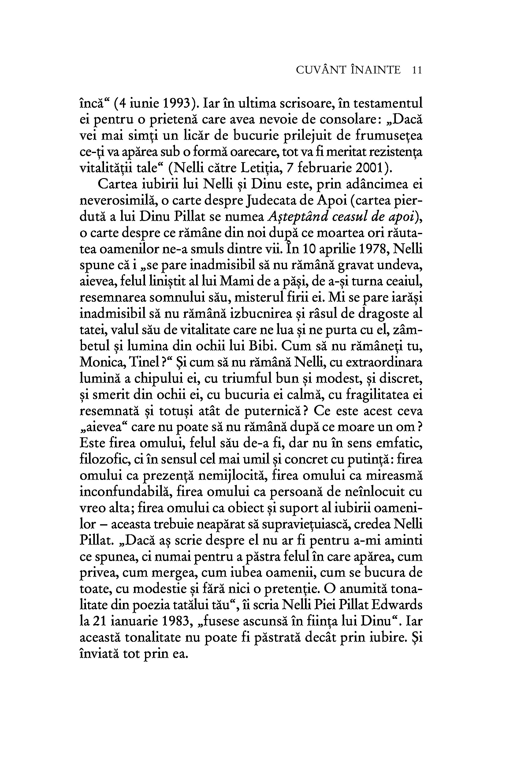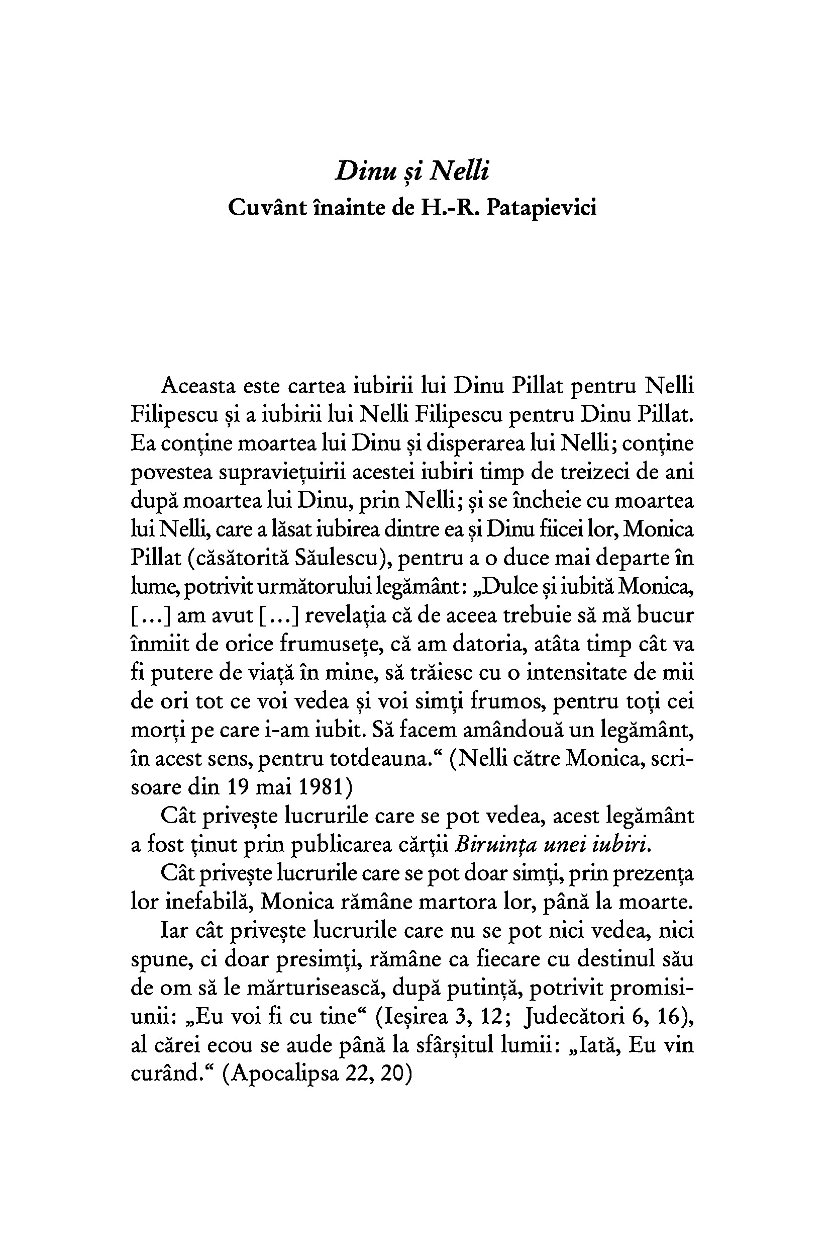 „Misterul acestei iubiri nu se elucidează nici în moarte, precum iubirea dintre Romeo și Julieta; nici în violență, precum iubirea manipulată perfid dintre Othello și Desdemona; nici în asumarea unei sarcini istorice mărețe, precum iubirea dintre Enea și Didona; nici în insondabilul mister al eșecului, precum iubirea dintre Marie Arnoux și Frédéric Moreau. Iubirea dintre Nelli și Dinu se elucidează în misterul promisiunii «Eu voi fi cu tine» și «Iată, Eu vin curând»… Cartea iubirii lui Nelli și Dinu este, prin adâncimea ei neverosimilă, o carte despre Judecata de Apoi (cartea pierdută a lui Dinu Pillat se numea Așteptând ceasul de apoi), o carte despre ce rămâne din noi după ce moartea ori răutatea oamenilor ne-a smuls dintre vii.“ (H.-R. Patapievici)