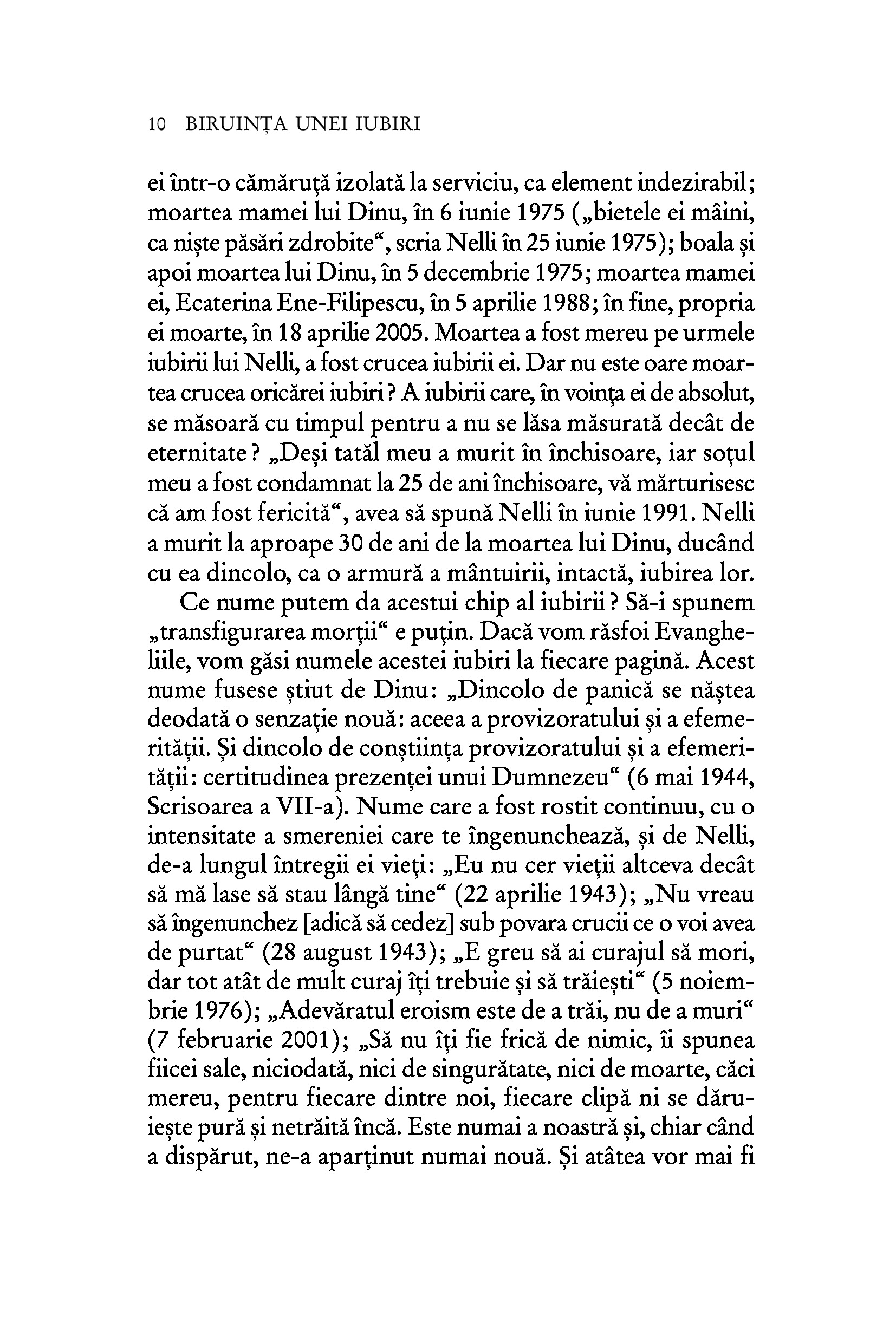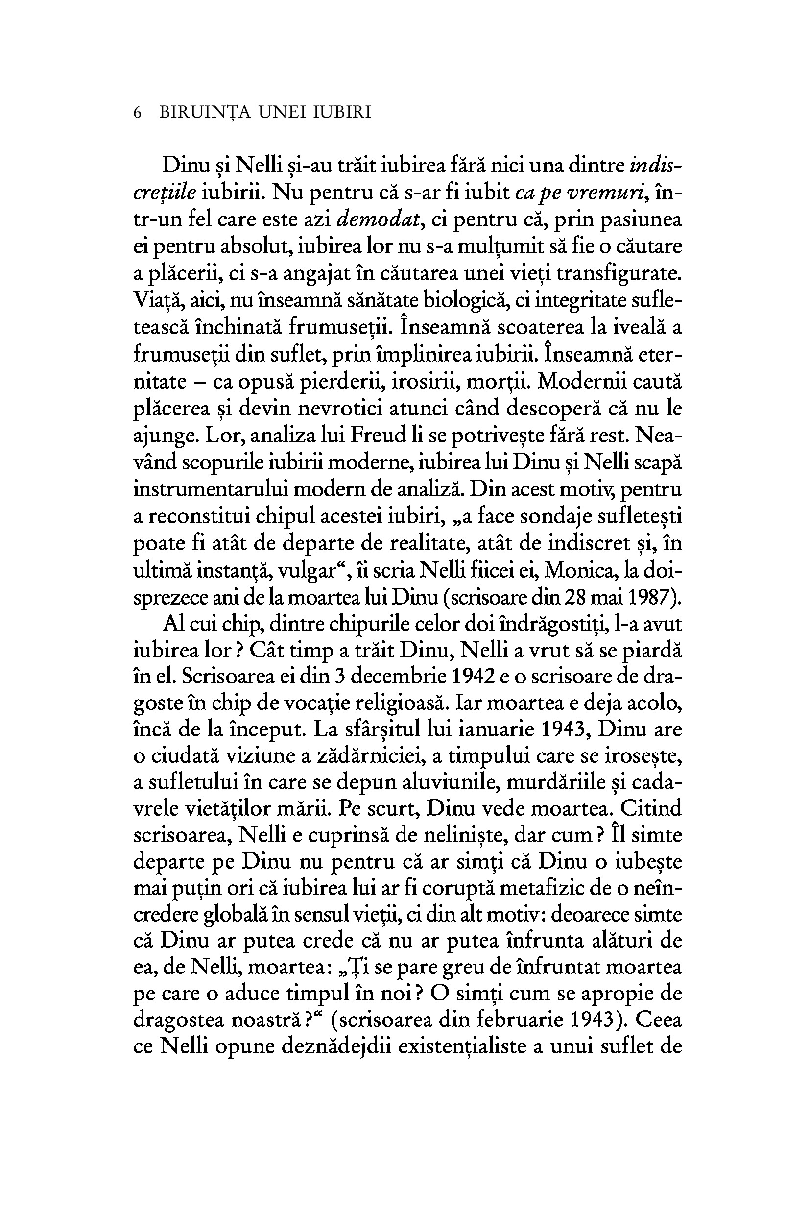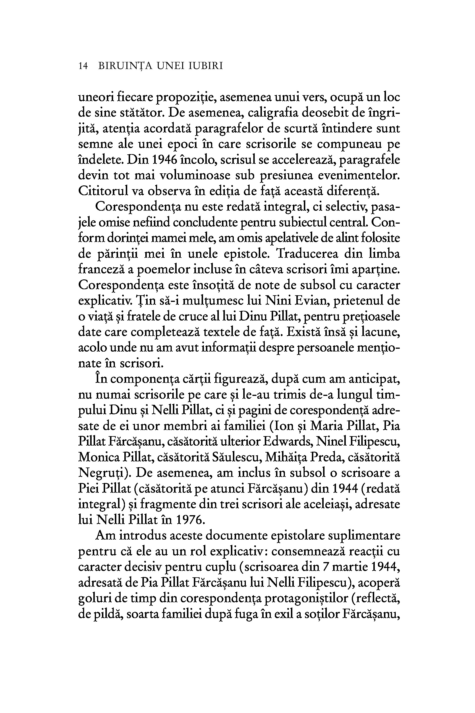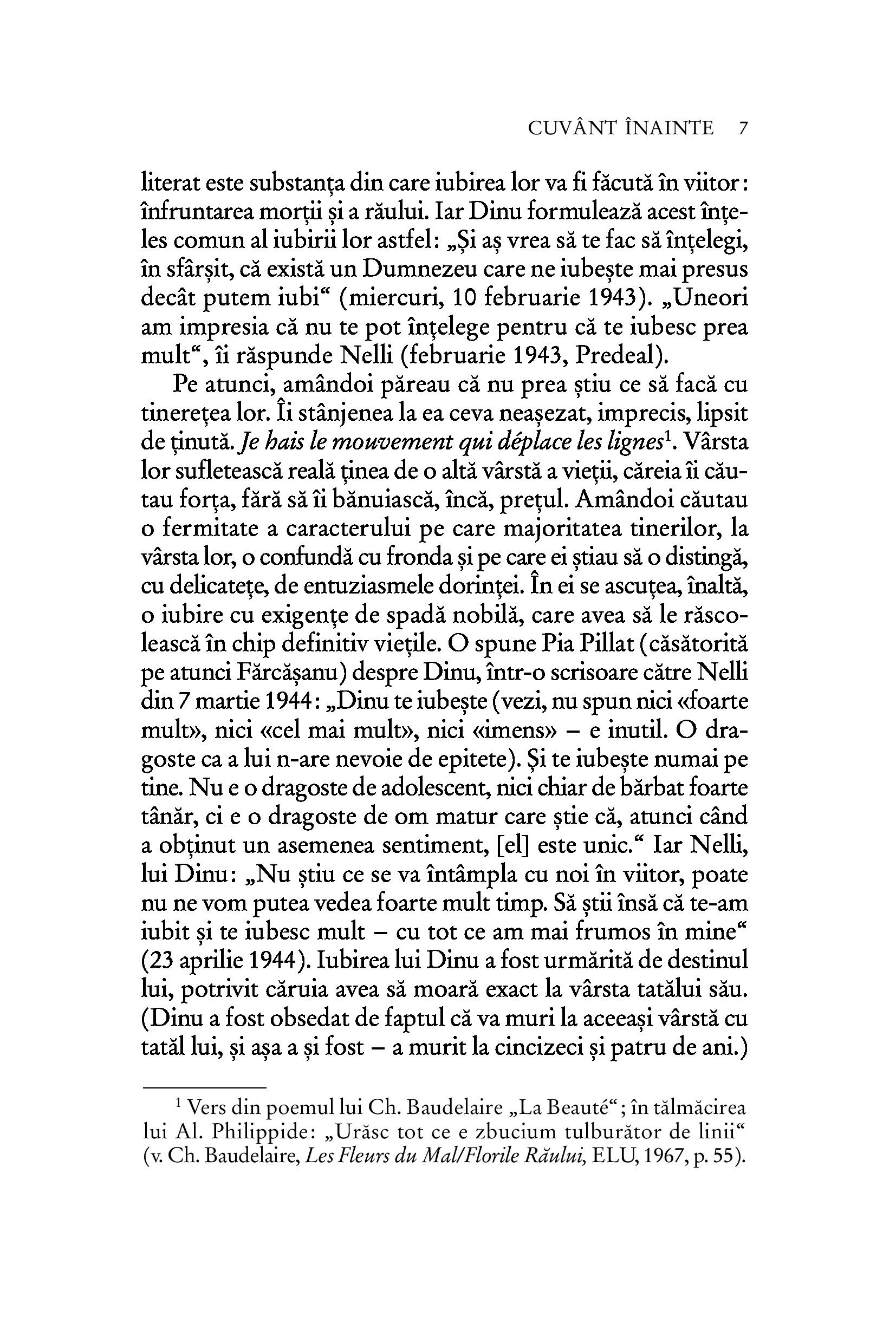 „Misterul acestei iubiri nu se elucidează nici în moarte, precum iubirea dintre Romeo și Julieta; nici în violență, precum iubirea manipulată perfid dintre Othello și Desdemona; nici în asumarea unei sarcini istorice mărețe, precum iubirea dintre Enea și Didona; nici în insondabilul mister al eșecului, precum iubirea dintre Marie Arnoux și Frédéric Moreau. Iubirea dintre Nelli și Dinu se elucidează în misterul promisiunii «Eu voi fi cu tine» și «Iată, Eu vin curând»… Cartea iubirii lui Nelli și Dinu este, prin adâncimea ei neverosimilă, o carte despre Judecata de Apoi (cartea pierdută a lui Dinu Pillat se numea Așteptând ceasul de apoi), o carte despre ce rămâne din noi după ce moartea ori răutatea oamenilor ne-a smuls dintre vii.“ (H.-R. Patapievici)