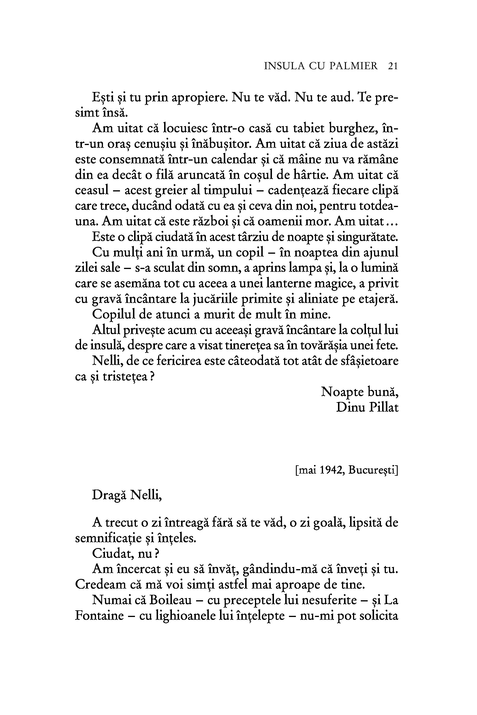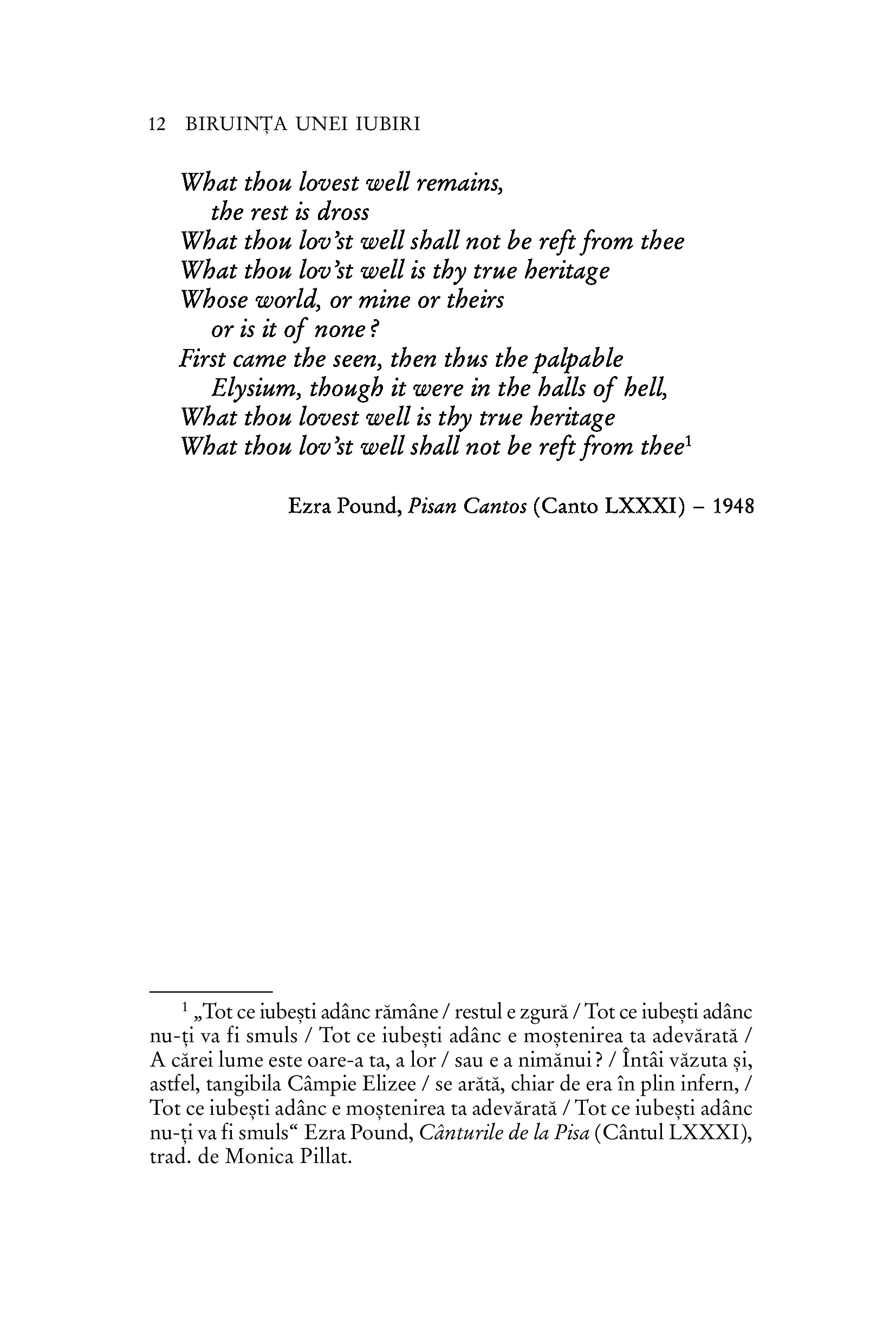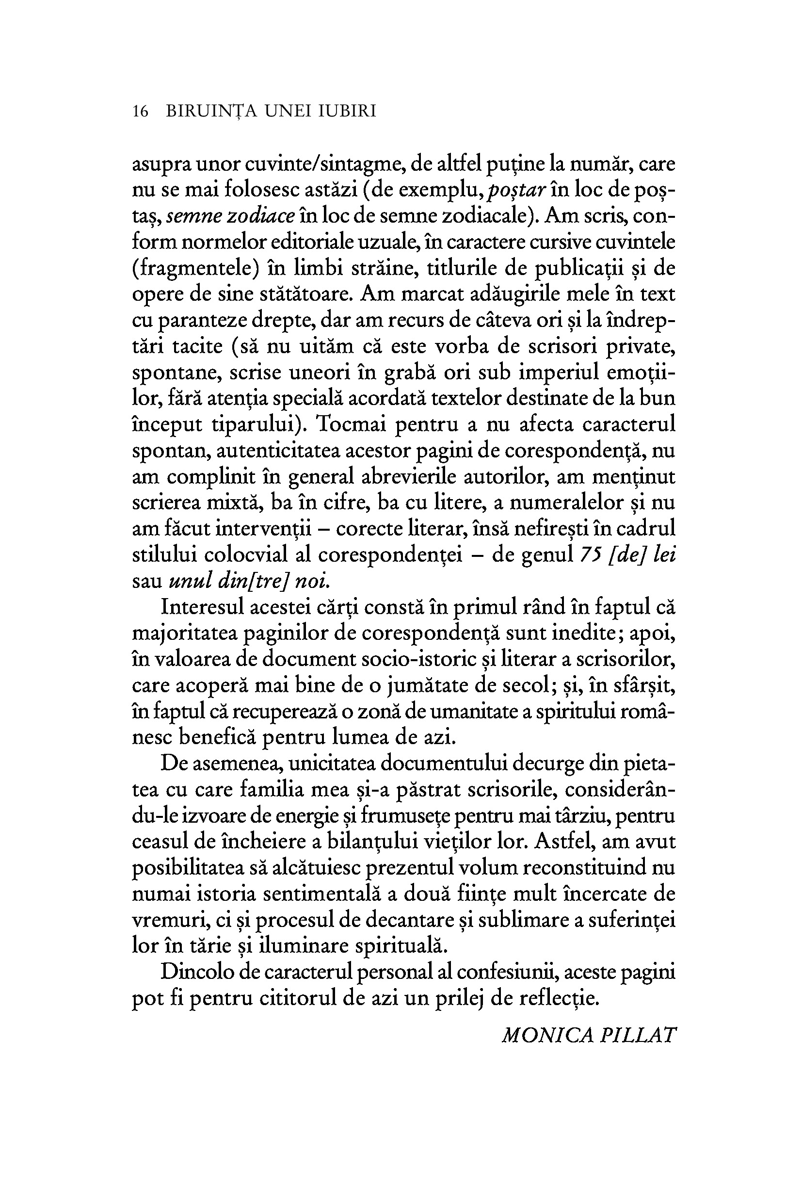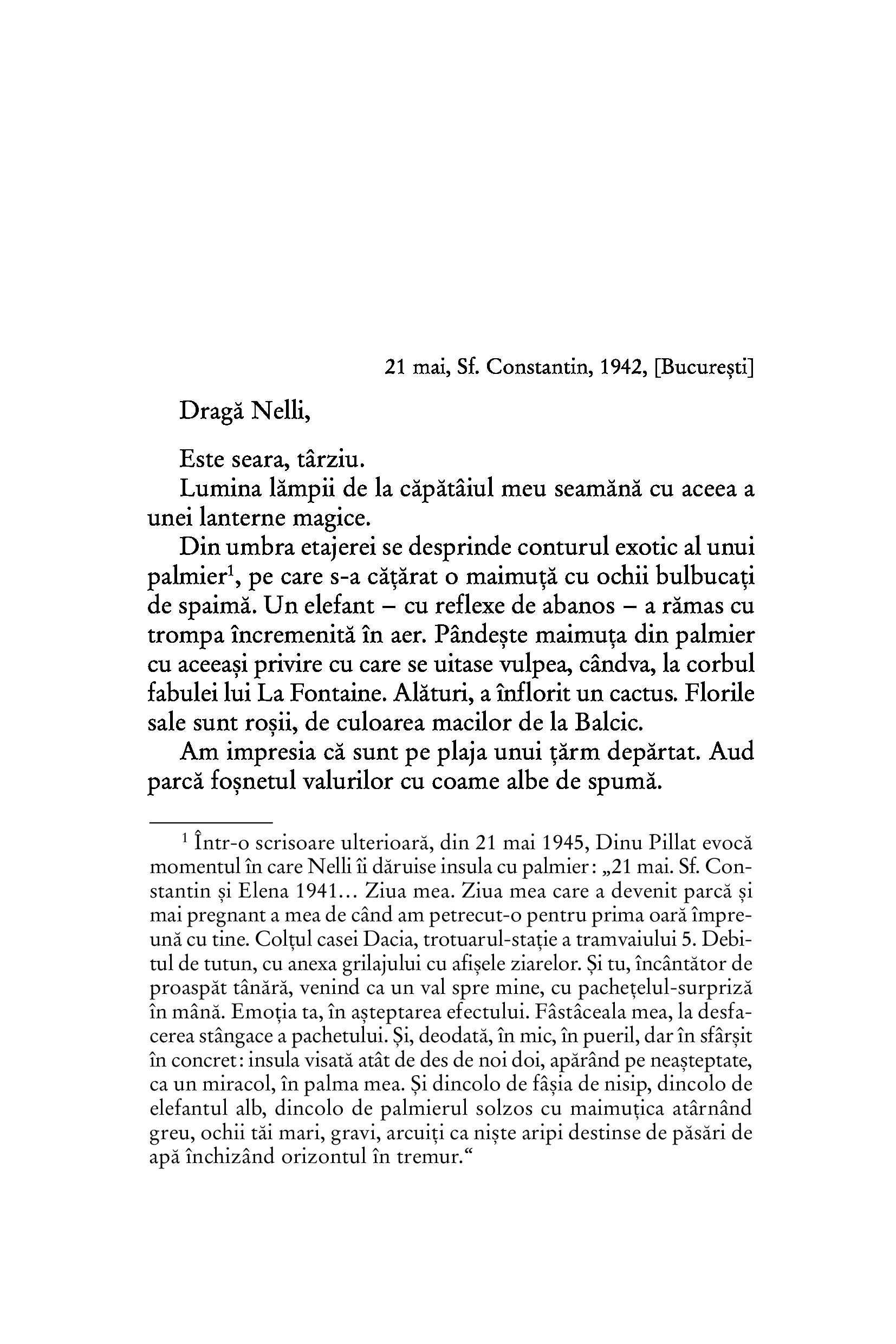 „Misterul acestei iubiri nu se elucidează nici în moarte, precum iubirea dintre Romeo și Julieta; nici în violență, precum iubirea manipulată perfid dintre Othello și Desdemona; nici în asumarea unei sarcini istorice mărețe, precum iubirea dintre Enea și Didona; nici în insondabilul mister al eșecului, precum iubirea dintre Marie Arnoux și Frédéric Moreau. Iubirea dintre Nelli și Dinu se elucidează în misterul promisiunii «Eu voi fi cu tine» și «Iată, Eu vin curând»… Cartea iubirii lui Nelli și Dinu este, prin adâncimea ei neverosimilă, o carte despre Judecata de Apoi (cartea pierdută a lui Dinu Pillat se numea Așteptând ceasul de apoi), o carte despre ce rămâne din noi după ce moartea ori răutatea oamenilor ne-a smuls dintre vii.“ (H.-R. Patapievici)