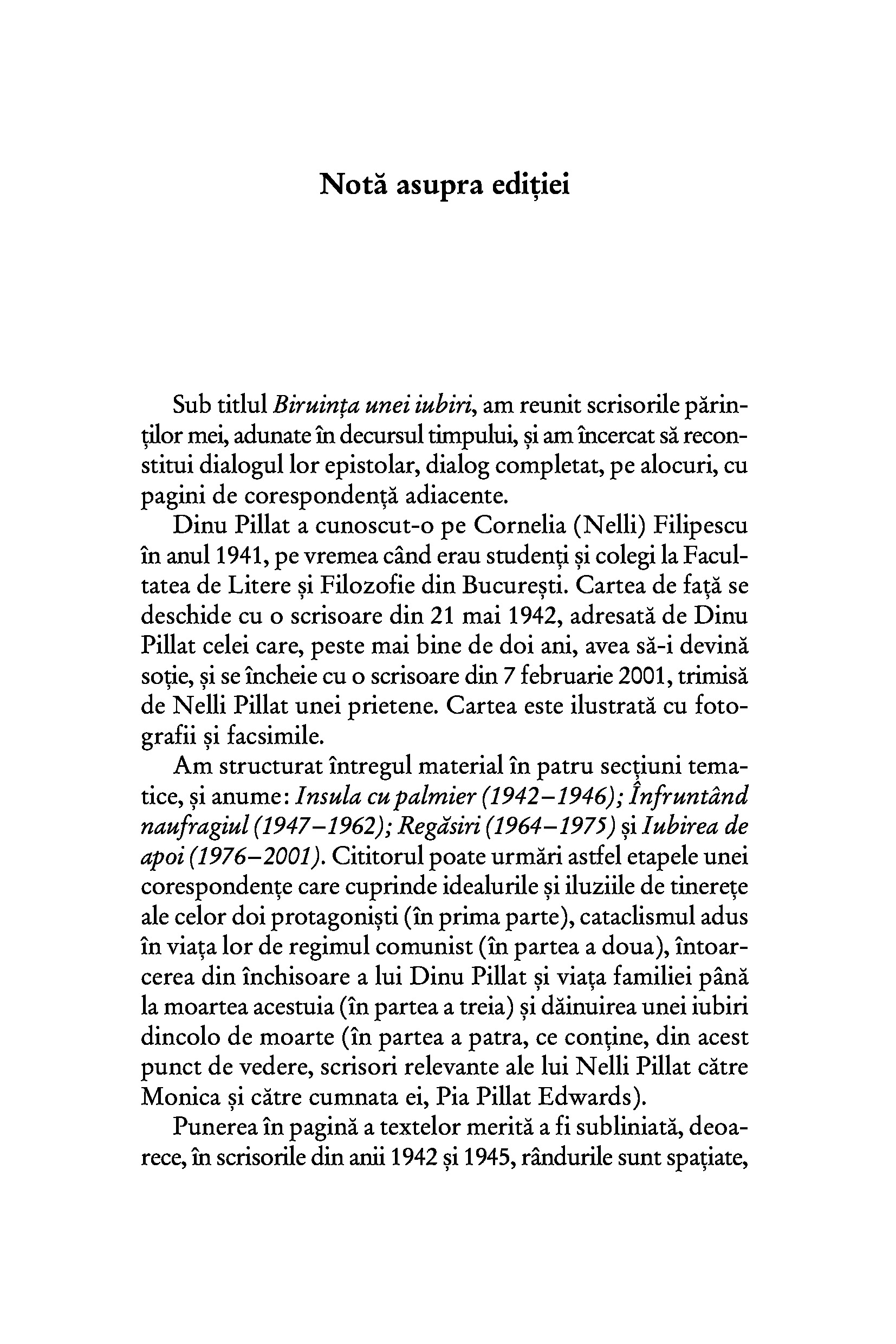 Subiectul acestui volum este iubirea atotbiruitoare dintre un bărbat și o femeie greu încercați de vremuri. Bărbatul este Dinu Pillat (1921–1975), „cap de lot“, alături de Constantin Noica, în sinistrul proces înscenat de Securitate, la sfârșitul anilor ’50, unui grup de intelectuali socotiți vinovați de „uneltire contra ordinii sociale“; iar dincolo de acest dureros episod biografic, un remarcabil romancier, critic și istoric literar. Femeia este Nelli Filipescu (1921–2005), colegă de facultate la Litere și Filozofie cu Dinu Pillat și, din 1944, soția lui; împlinită profesional ca editoare, memorialistă și cercetătoare în istoria artei. După moartea lui Nelli, Monica Pillat-Săulescu, ea însăși scriitoare, a reconstituit tulburătorul dialog epistolar al părinților săi, completându-l cu pagini de corespondență adiacente, fotografii și facsimile.
