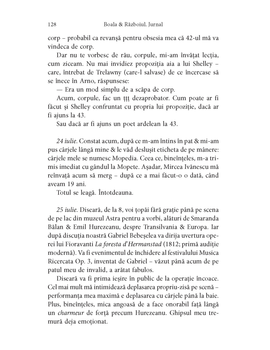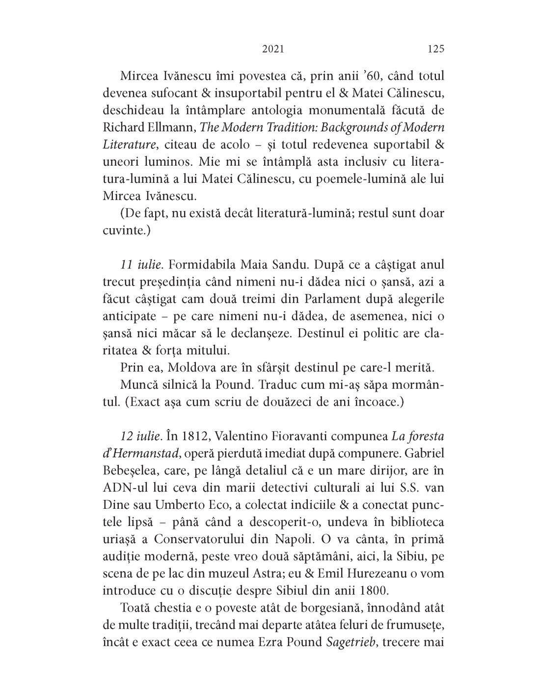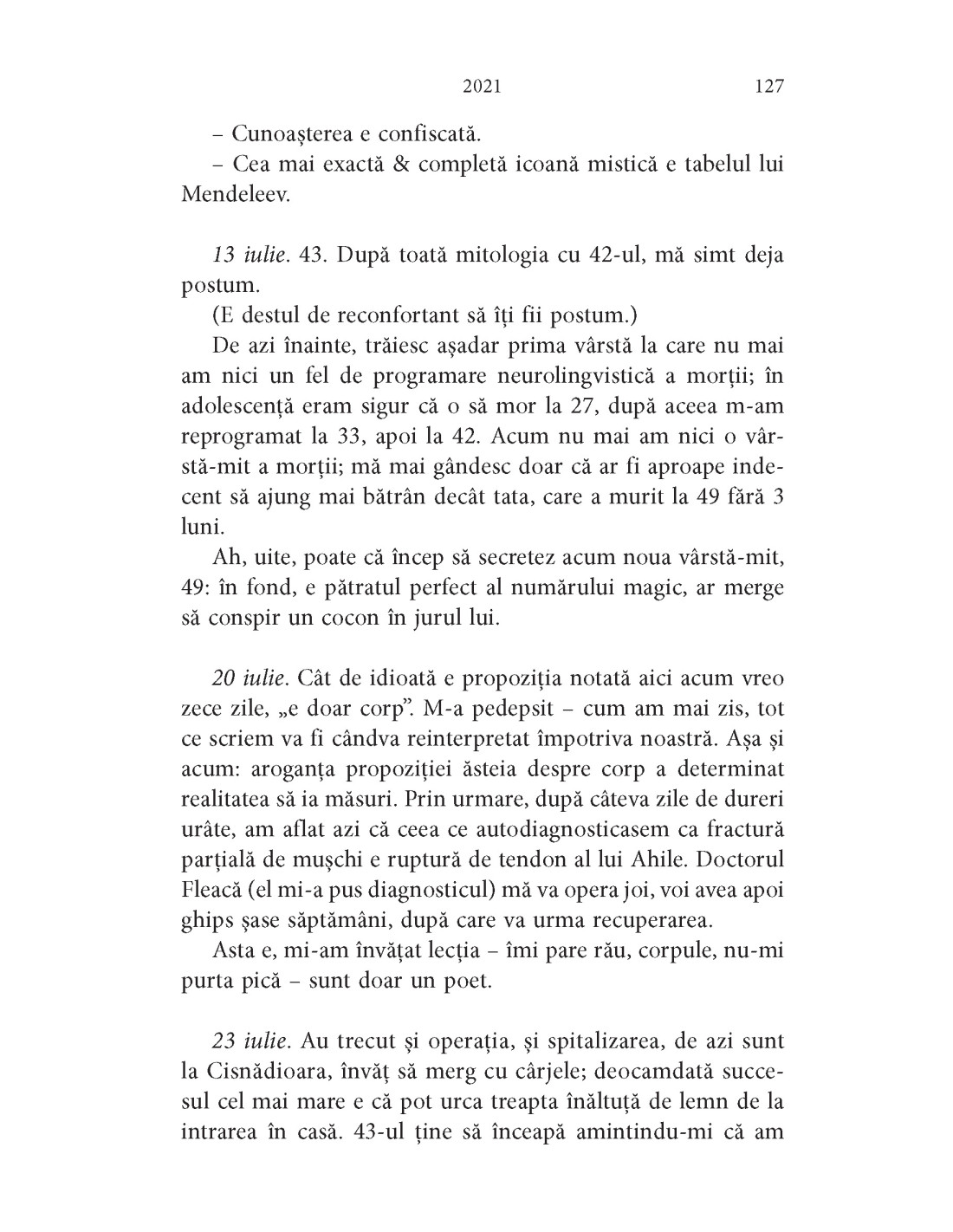 „Supraviețuirea prin poezie. Cititul ca al șaselea simț, cel fără de care nu ai cum să percepi și să pricepi plenitudinea vieții. O uriașă înțelegere a omenescului disperat. Câte un zâmbet repede ascuns. Și mai ales, mai ales admirația, mereu la pândă, mereu în căutarea unei prăzi, atât în cărți, cât și în viață.
