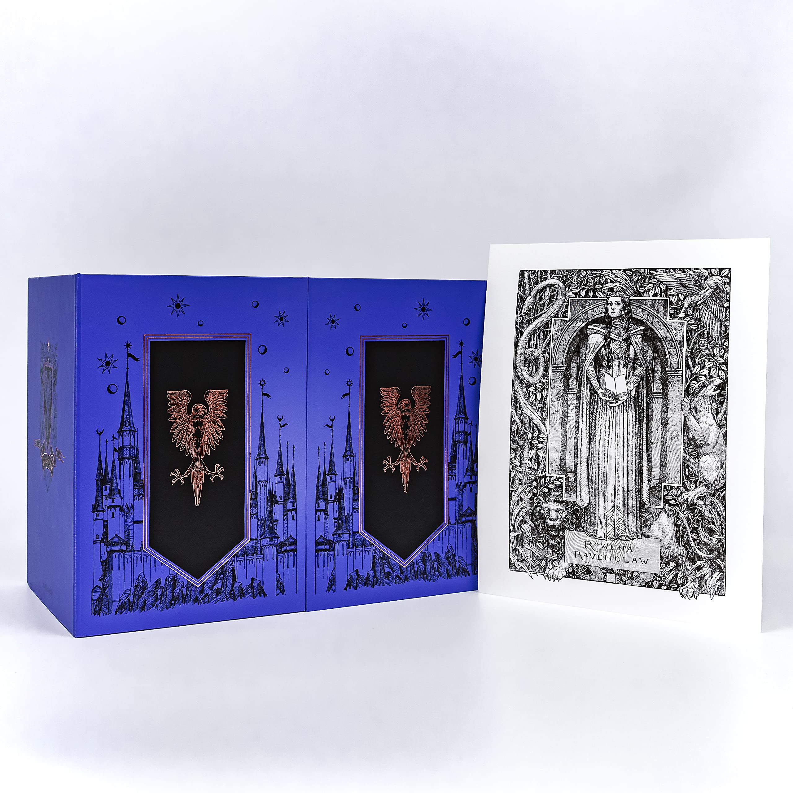Home to the wise, Ravenclaw house has produced some of the most famous witches and wizards in history, including Luna Lovegood and Filius Flitwick. The seven lovingly designed covers are individually decorated with enchanting details that capture favourite house themes from each novel. Charming vignettes of the Ravenclaw eagle in a series of playful poses across the seven book spines complete the decoration scheme. An exclusive artwork print depicting house founder Rowena Ravenclaw wearing the Ravenclaw diadem makes for a highly collectable keepsake.