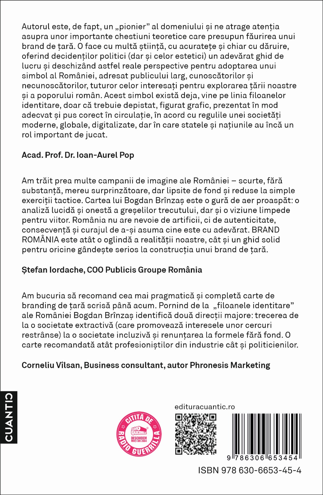 ” Am trait prea multe campanii de imagine ale Romaniei – scurte, fara substanta, mereu surprinzatoare, dar lipsite de fond si reduse la simple exercitii tactice. Cartea lui Bogdan Brinzas este o gura de aer proaspat: o analiza lucida si onesta a greselilor trecutului, dar si o viziune limpede pentru viitor. Romania nu are nevoie de artificii, ci de autenticitate, consecventa si curajul de a-si asuma cine este cu adevarat. BRAND ROMÂNIA este atat o oglinda a realitatii noastre, cat si un ghid solid pentru oricine gandeste serios la constructia unui brand de tara.”