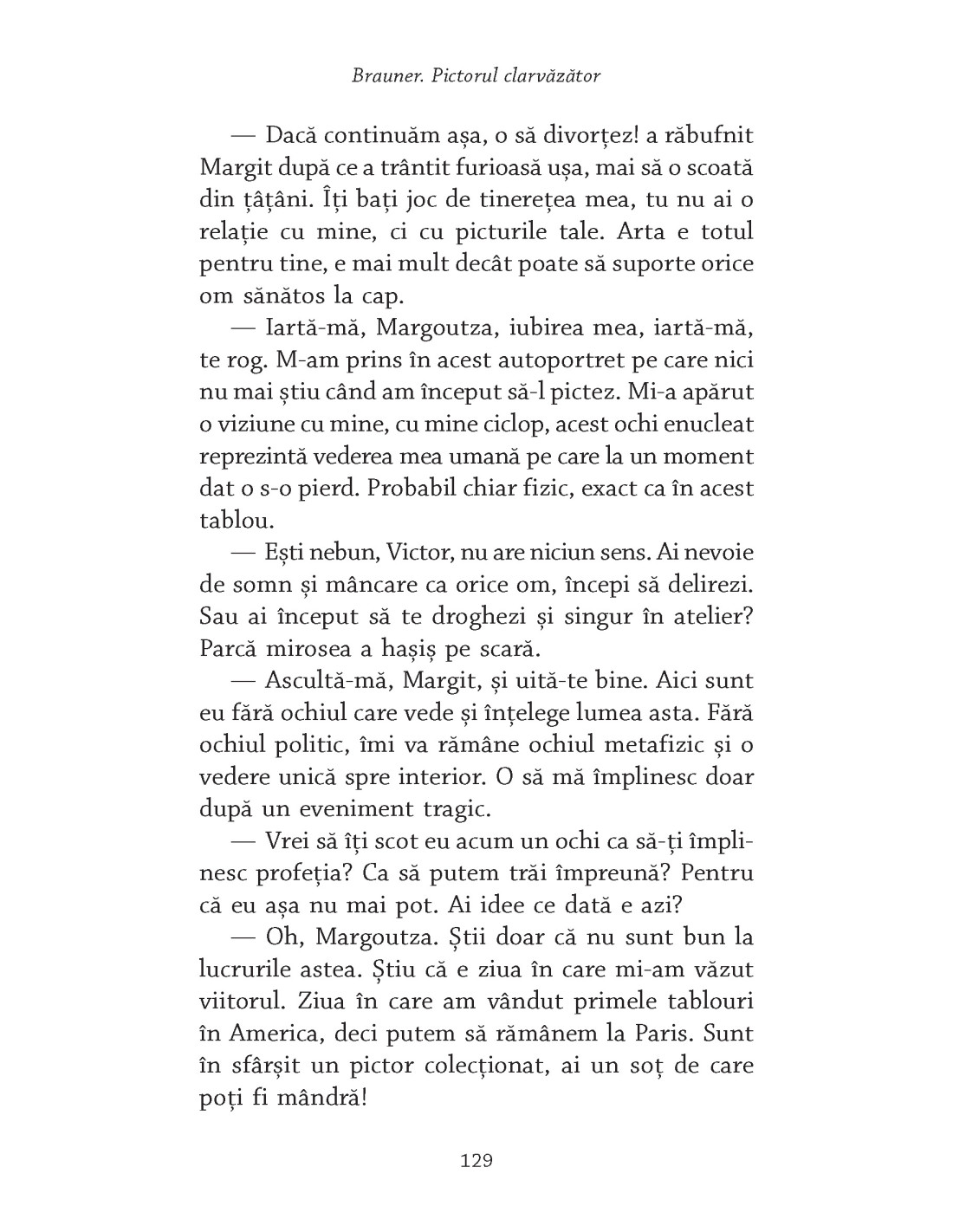 „Lumea spiritelor pe care a văzut-o era una a animalelor fantastice, plină de simboluri cosmogonice şi sugestii ancestrale. Era chemarea spre traducere a necunoscutului prin pictură pe care o simţea de ceva timp. Mai mult ca niciodată, a înţeles că menirea lui de pictor depăşeşte reprezentarea realităţii. A recunoscut chemarea, contactul cu alte lumi. S-a întâlnit parcă cu un alt Victor Brauner, un Victor infinit, victorios, iluminator. S-a întâlnit cu sine, o parte ascunsă a sinelui. Sinele vrăjitor, sinele scrib, sinele care decodifică mistere. Sinele medium, permanent legat de lumea spiritelor.”