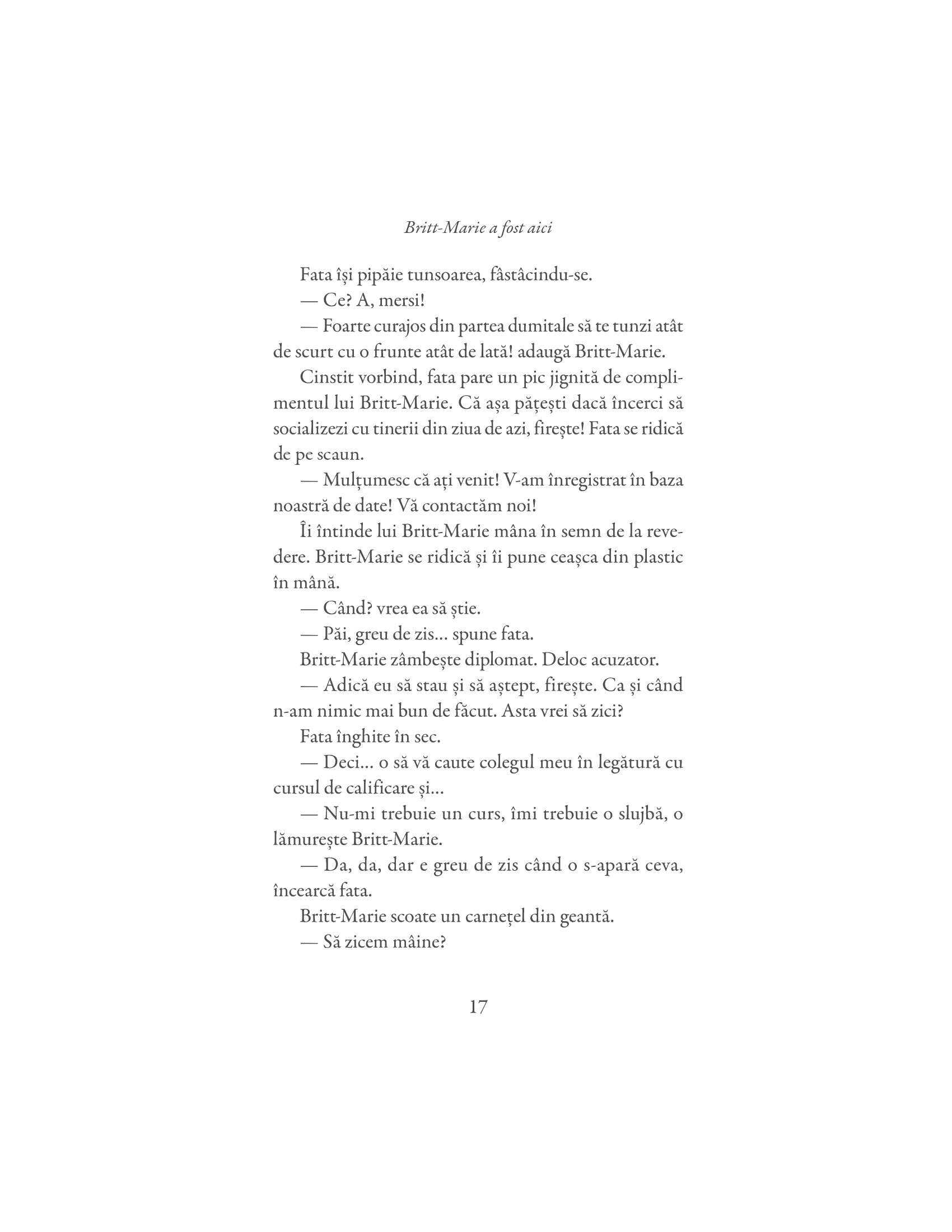 Britt-Marie are în continuare obsesiile ei legate de felul cum trebuie făcute lucrurile, are liste de la care nu se poate abate pentru nimic în lume, iar complimentele pe care concede uneori să le facă par mai degrabă atacuri la persoană. Dar curajul cu care își ia în mâini propria viață, după o căsnicie în care nu a avut aproape niciun cuvânt de spus, o umanizează și o transformă într-un personaj digerabil, pentru ca treptat, aproape fără să ne dăm seama, să ajungem să o iubim.