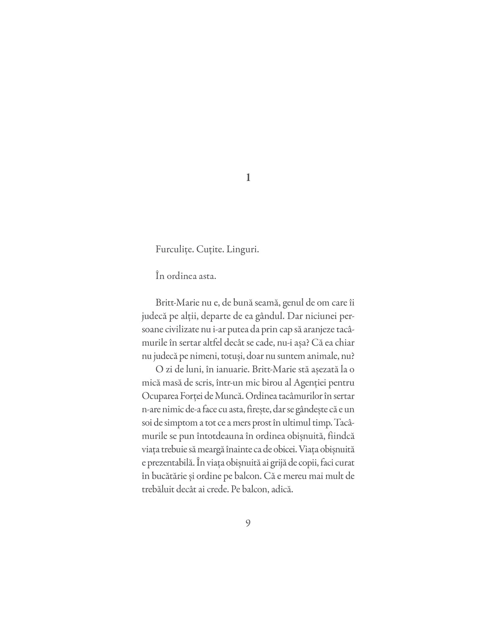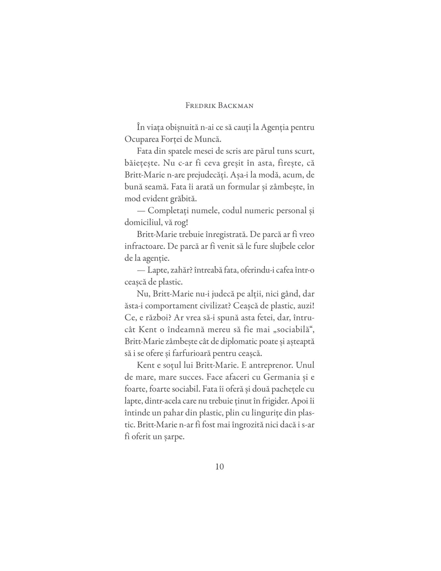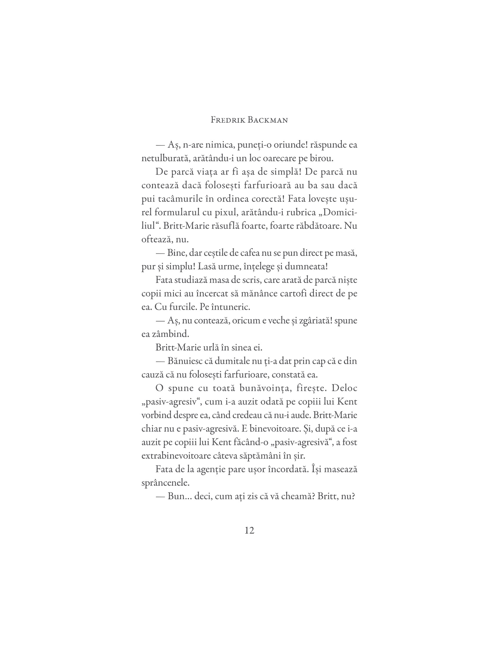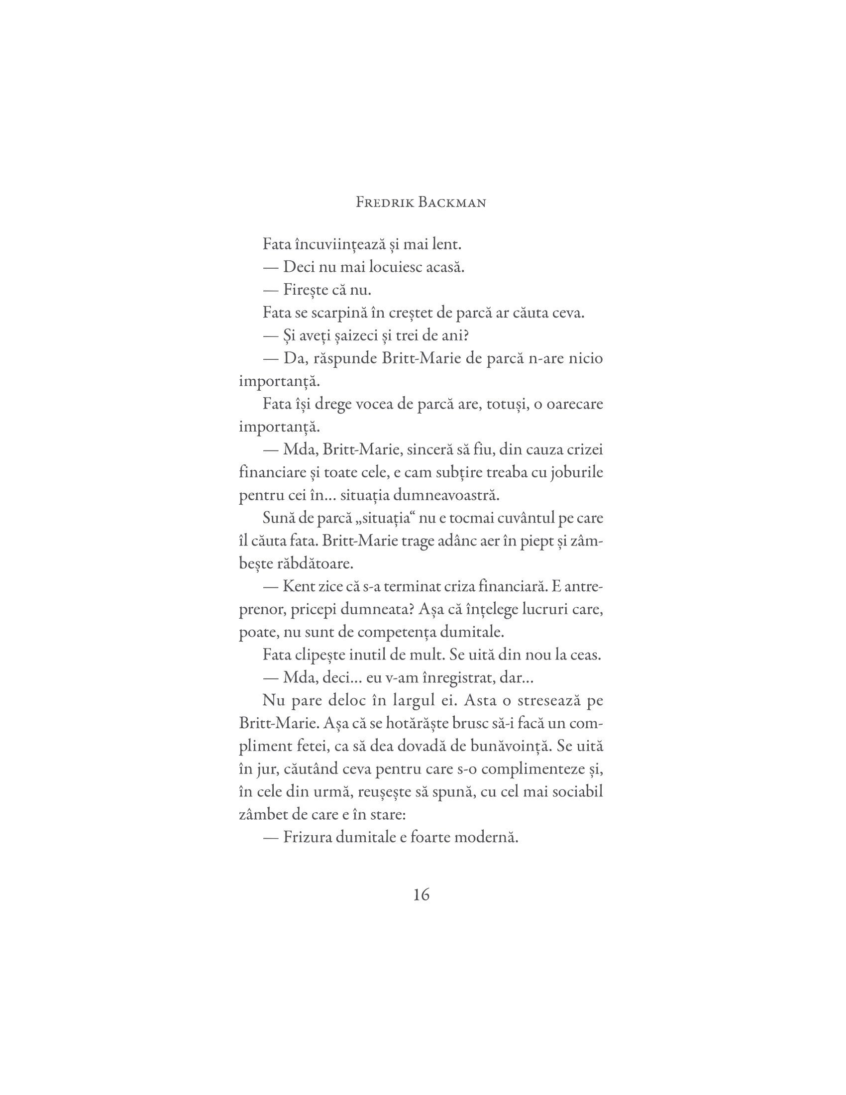 Personajul Britt-Marie apare pentru prima dată, în toată splendoarea răutăților ei obsesive, în Bunica mi-a zis că-i pare rău, dar Backman a simțit imensul potențial al personajului său și, poate, a tânjit cumva să-i facă dreptate. Și reușește.