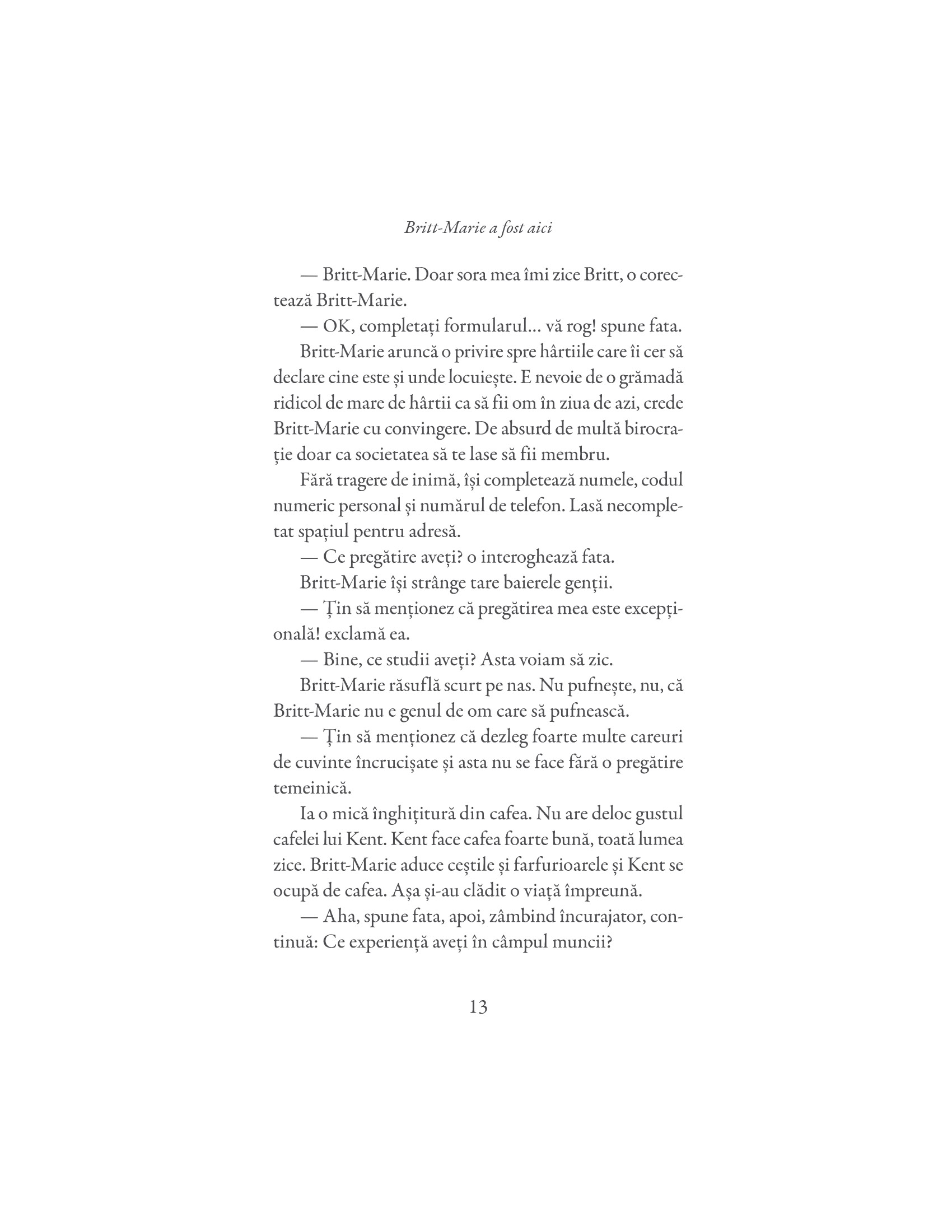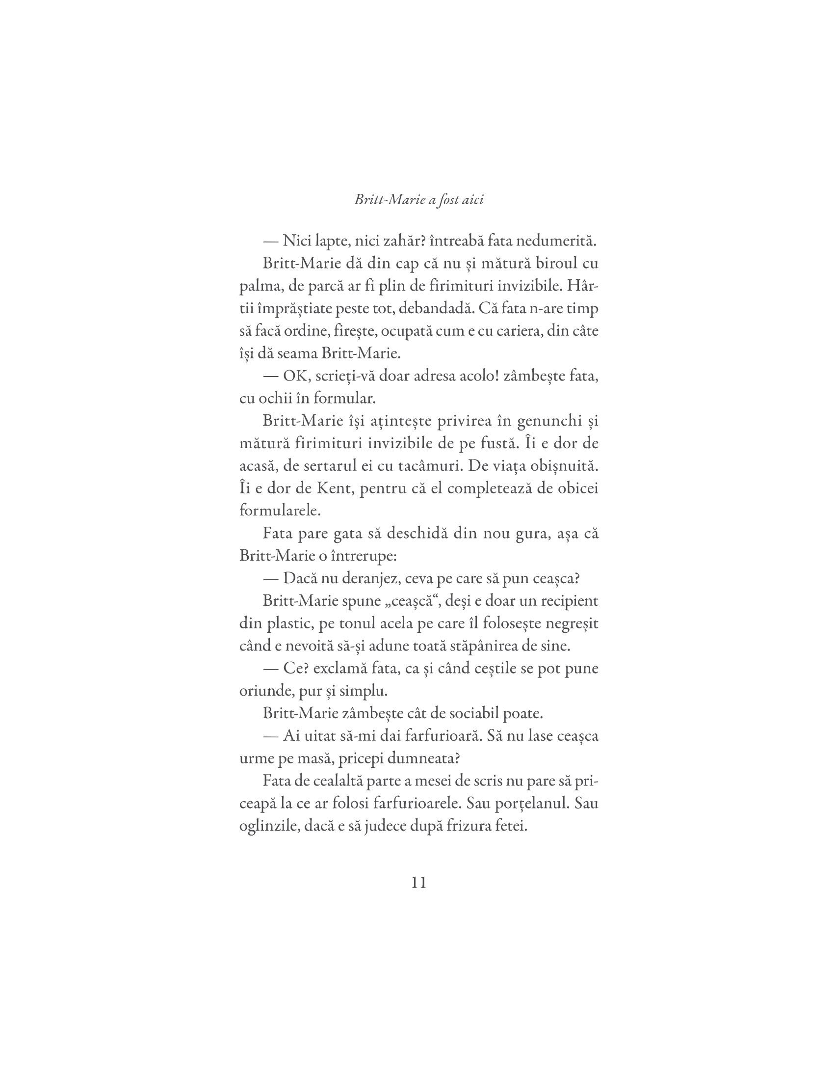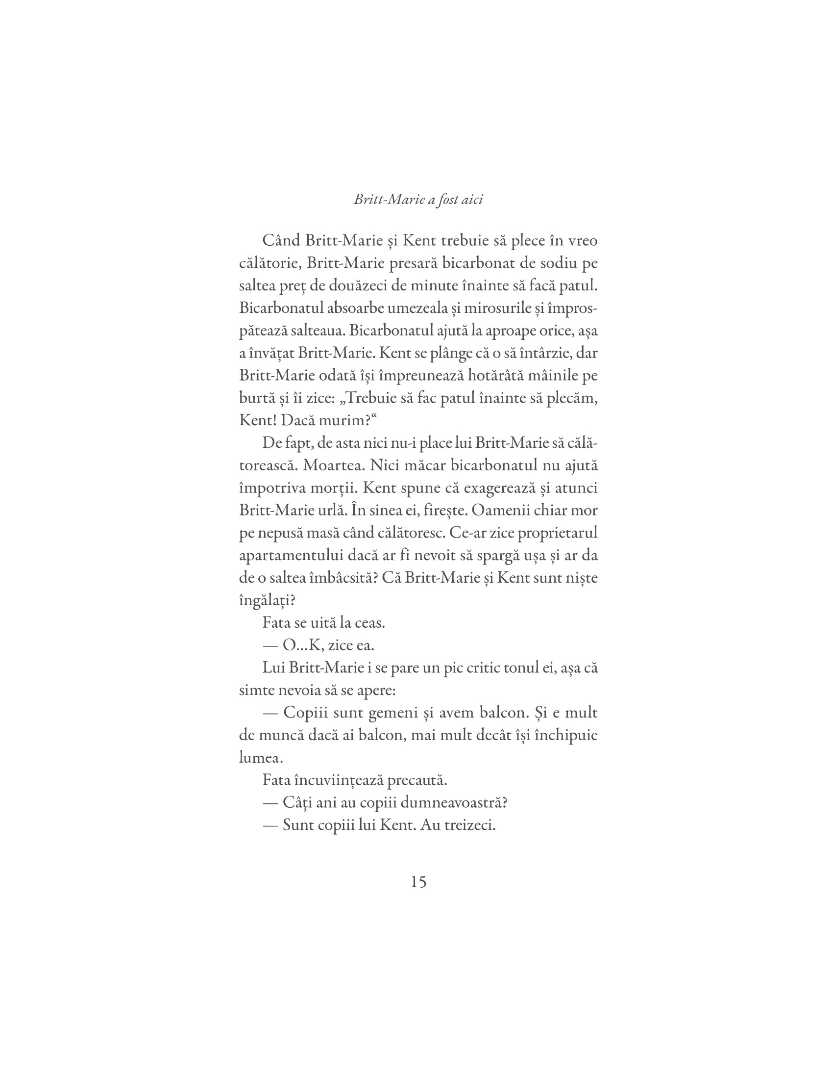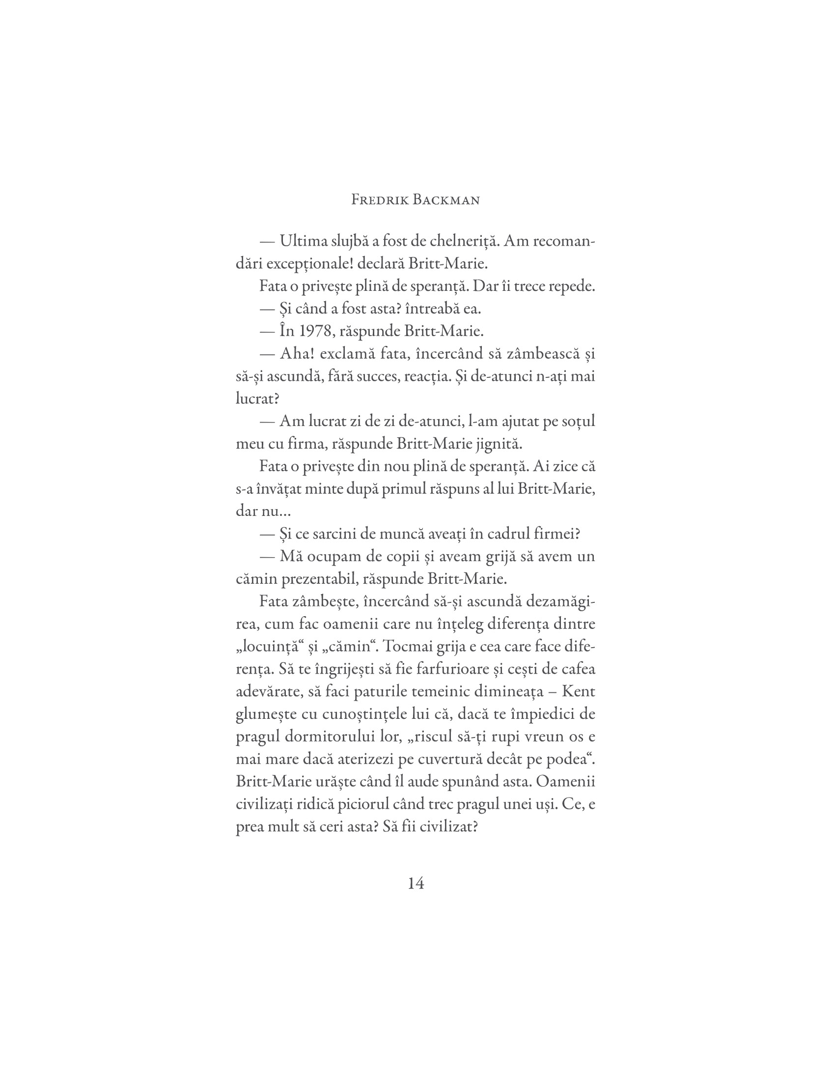 Personajul Britt-Marie apare pentru prima dată, în toată splendoarea răutăților ei obsesive, în Bunica mi-a zis că-i pare rău, dar Backman a simțit imensul potențial al personajului său și, poate, a tânjit cumva să-i facă dreptate. Și reușește.