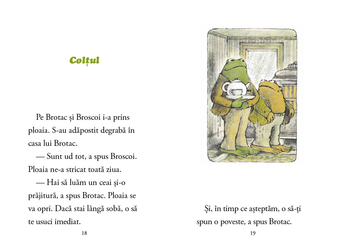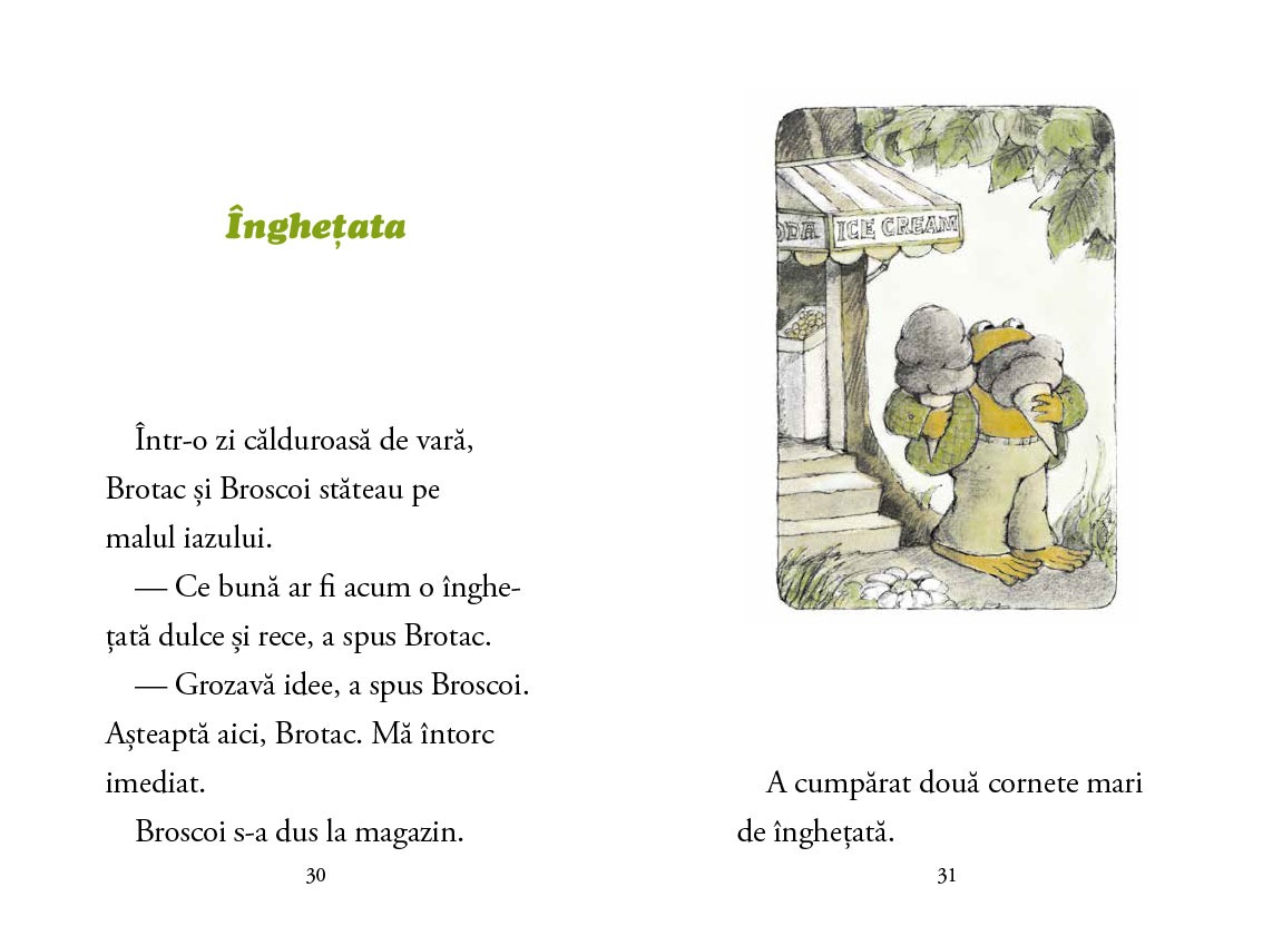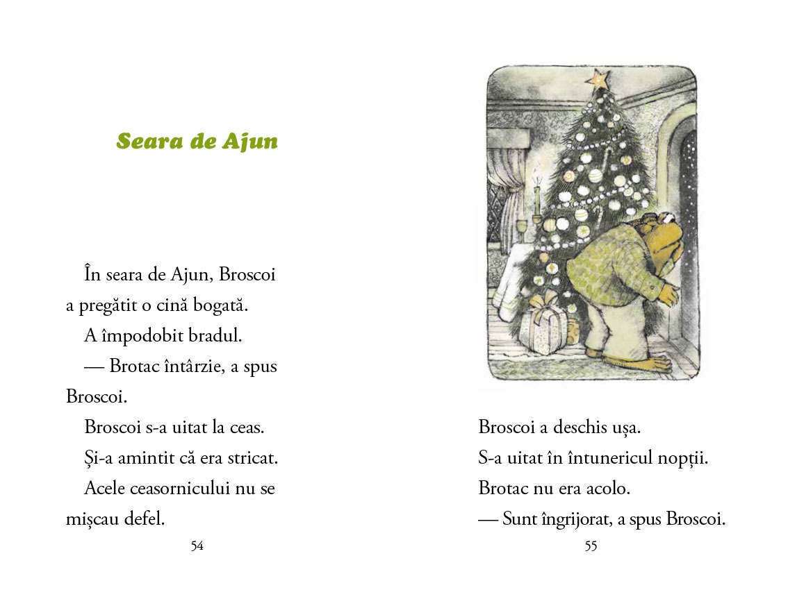 Ce fac Broscoi și Brotac de-a lungul anului? Iarna se dau cu sania, primăvara se bucură de lumină și căldură, vara mănâncă înghețată, toamna adună frunzele uscate, iar când vine decembrie așteaptă nerăbdători Crăciunul. Lucruri obișnuite, dar pe care cei doi le transformă în aventuri care, cu căldură și umor, ne vorbesc despre puterea fără margini a prieteniei.