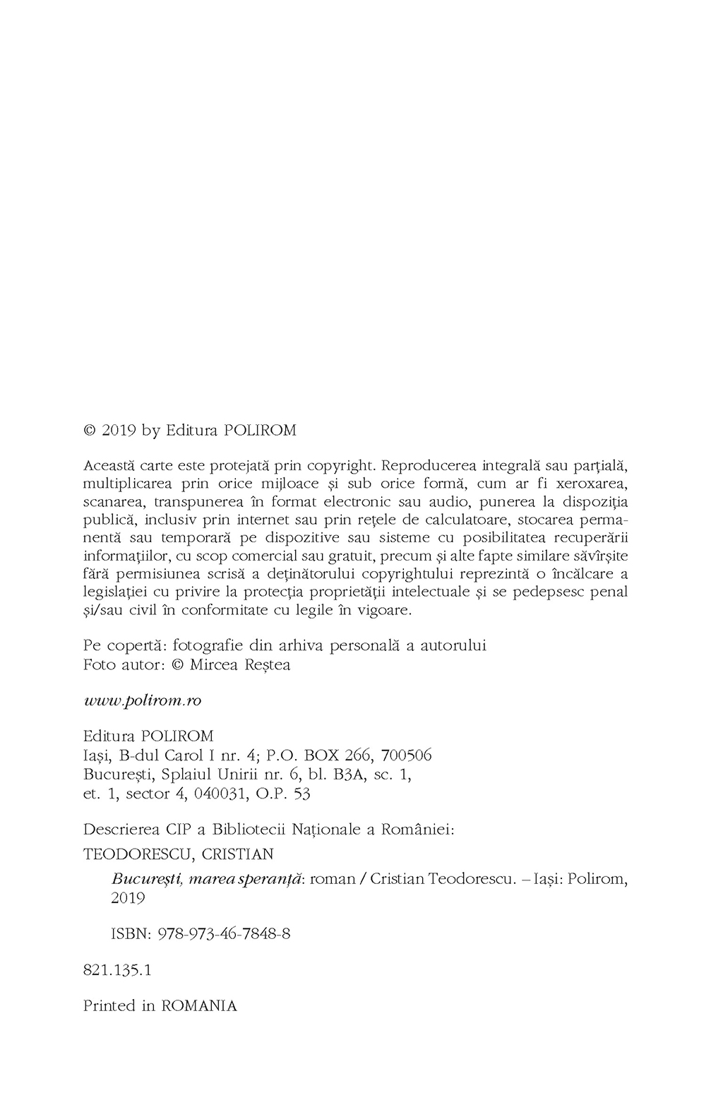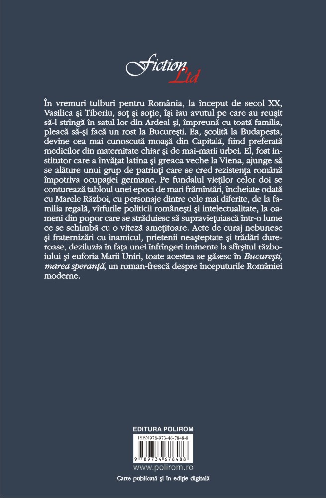 În vremuri tulburi pentru România, la început de secol XX, Vasilica şi Tiberiu, soţ şi soţie, îşi iau avutul pe care au reuşit să-l strîngă în satul lor din Ardeal şi, împreună cu toată familia, pleacă să-şi facă un rost la Bucureşti. Ea, şcolită la Budapesta, devine cea mai cunoscută moaşă din capitală, fiind preferată medicilor din maternitate chiar şi de mai-marii urbei. El, fost institutor care a învăţat latina şi greaca veche la Viena, ajunge să se alăture unui grup de patrioţi care se cred rezistenţa română împotriva ocupaţiei germane. Pe fundalul vieţilor celor doi se conturează tabloul unei epoci de mari frămîntări, încheiate odată cu Marele Război, cu personaje dintre cele mai diferite, de la familia regală, vîrfurile politicii româneşti şi intelectualitate, la oameni din popor care se străduiesc să supravieţuiască într-o lume ce se schimbă cu o viteză ameţitoare. Acte de curaj nebunesc şi fraternizări cu inamicul, prietenii neaşteptate şi trădări dureroase, deziluzia în faţa unei înfrîngeri iminente la sfîrşitul războiului şi euforia Marii Uniri, toate acestea se găsesc în Bucureşti, marea speranţă, un roman-frescă despre începuturile României moderne.