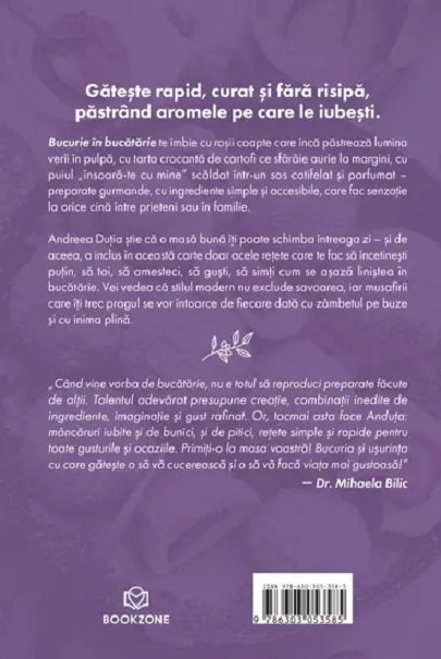 Or, tocmai asta face Anduța: mâncăruri iubite și de bunici, și de pitici, rețete simple și rapide pentru toate gusturile și ocaziile. Primiți-o la masa voastră! Bucuria și ușurința cu care gătește o să vă cucerească și o să vă facă viața mai gustoasă!”