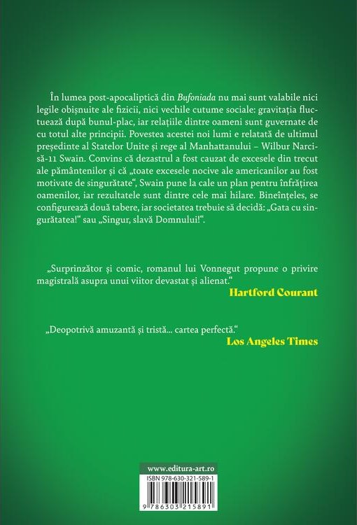 În lumea post-apocaliptică din „Bufoniada” nu mai sunt valabile nici legile obișnuite ale fizicii, nici vechile cutume sociale: gravitația fluctuează după bunul plac, iar relațiile dintre oameni sunt guvernate de cu totul alte principii. Povestea acestei noi lumi este relatată de ultimul președinte al Statelor Unite și rege al Manhattanului, Wilbur Narcisă-11 Swain. Convins că dezastrul a fost cauzat de excesele din trecut ale pământenilor și că „toate excesele nocive ale americanilor au fost motivate de singurătate”, Swain pune la cale un plan pentru înfrățirea oamenilor, iar rezultatele sunt dintre cele mai hilare. Bineînțeles, se configurează două tabere, iar societatea trebuie să decidă: „Gata cu singurătatea!” sau „Singur, slavă Domnului!”.