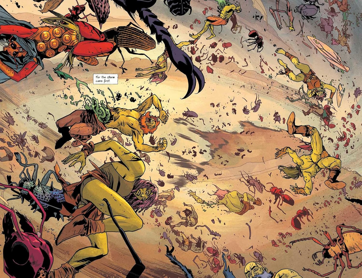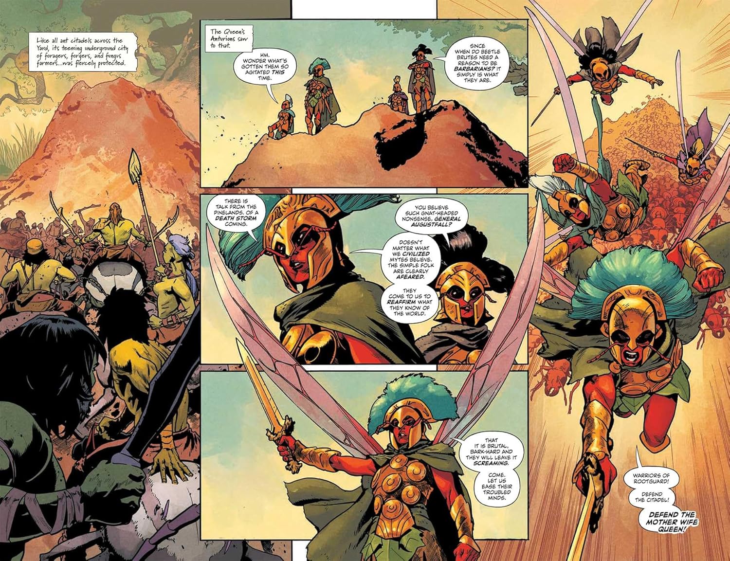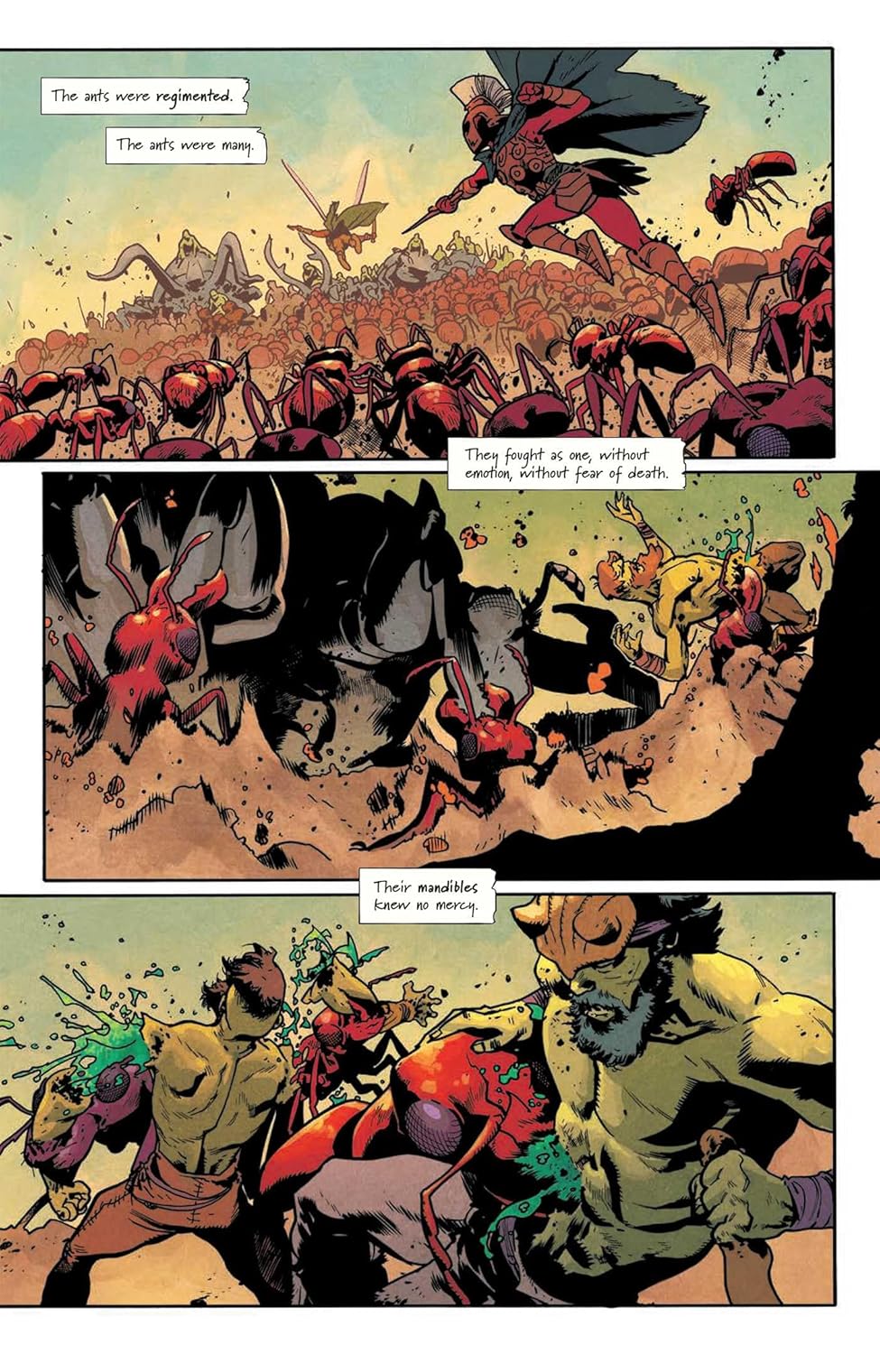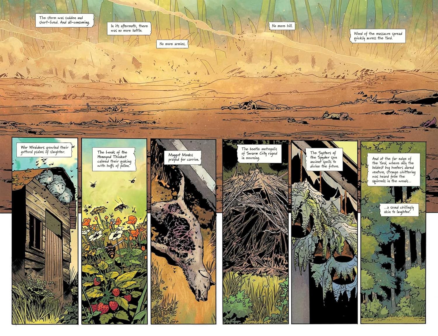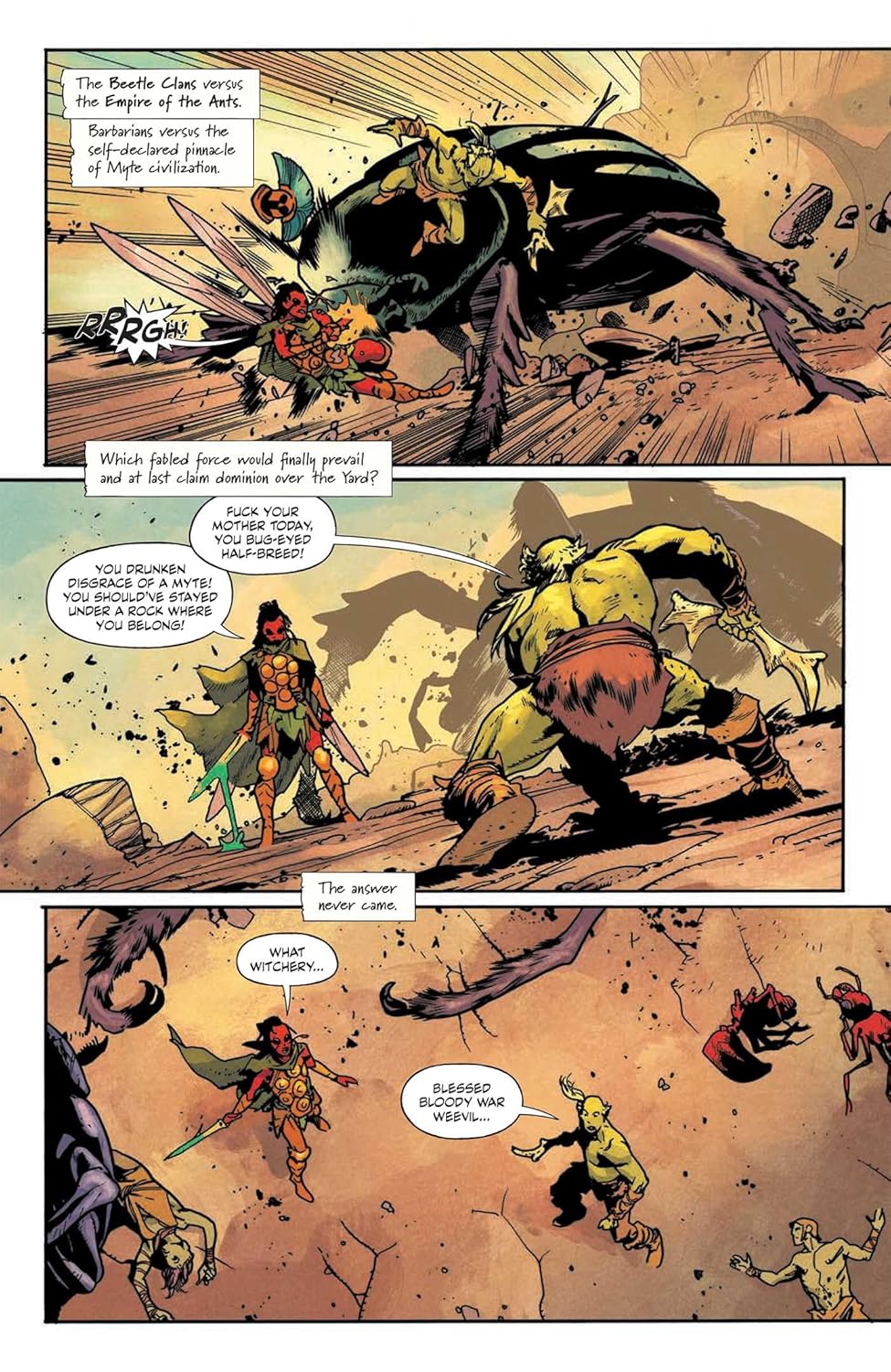The bug world is violent. Much more violent than I need in my graphic novels. I read a lot of dark fantasy and horror, I don’t mind splatterpunk, but do we really need to see heads flying off bodies? Do we really need the massive amount of cursing that opens this book? Probably not. It sets a tone, but frankly, this reader wouldn’t bother read the next comic volume. The characters are too one-dimensional when this is their language.
