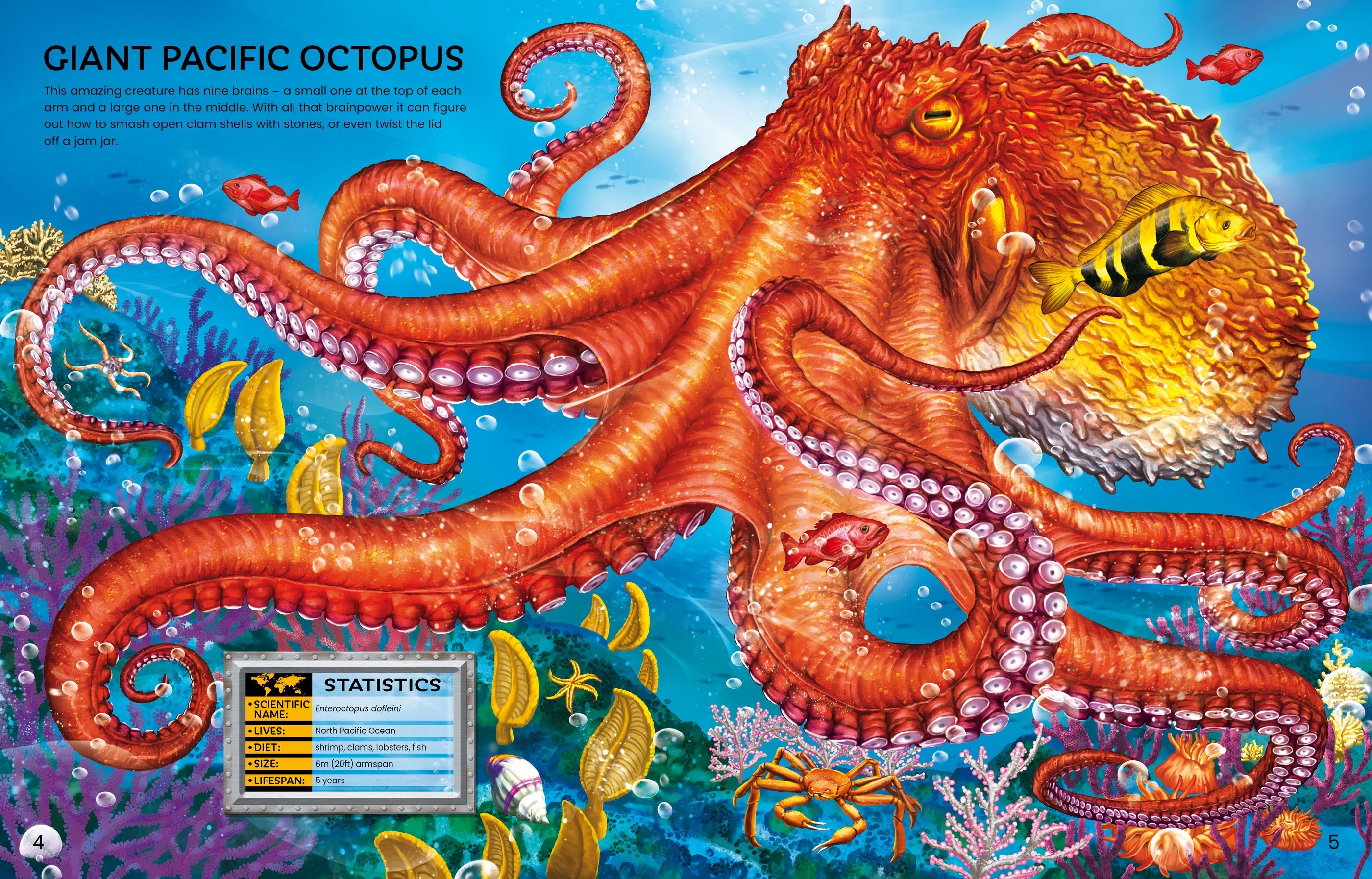 Journey to the depths of the ocean and meet some of its deadliest, strangest and most incredible animals with this awesome sticker book. From polar seas to tropical reefs, you'll meet humpback whales, hammerhead sharks, lionfish and many more. Complete them using the stickers, and read the descriptions to find out fascinating facts about each one.