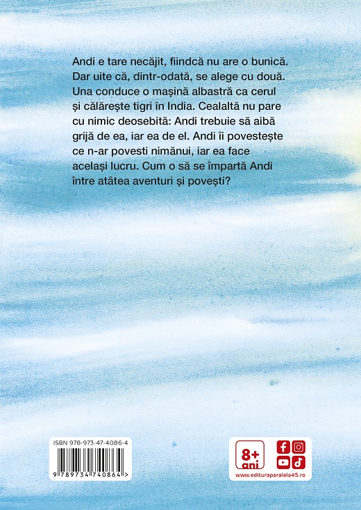 Andi e tare necăjit, fiindcă nu are o bunică. Dar uite că, dintr-odată, se alege cu două. Una conduce o mașină albastră ca cerul și călărește tigri în India. Cealaltă nu pare cu nimic deosebită: Andi trebuie să aibă grijă de ea, iar ea de el. Andi îi povestește ce n-ar povesti nimănui, iar ea face același lucru. Cum o să se împartă Andi între atâtea aventuri și povești?