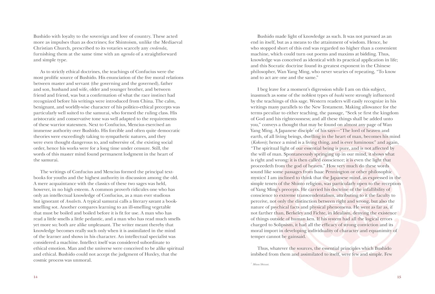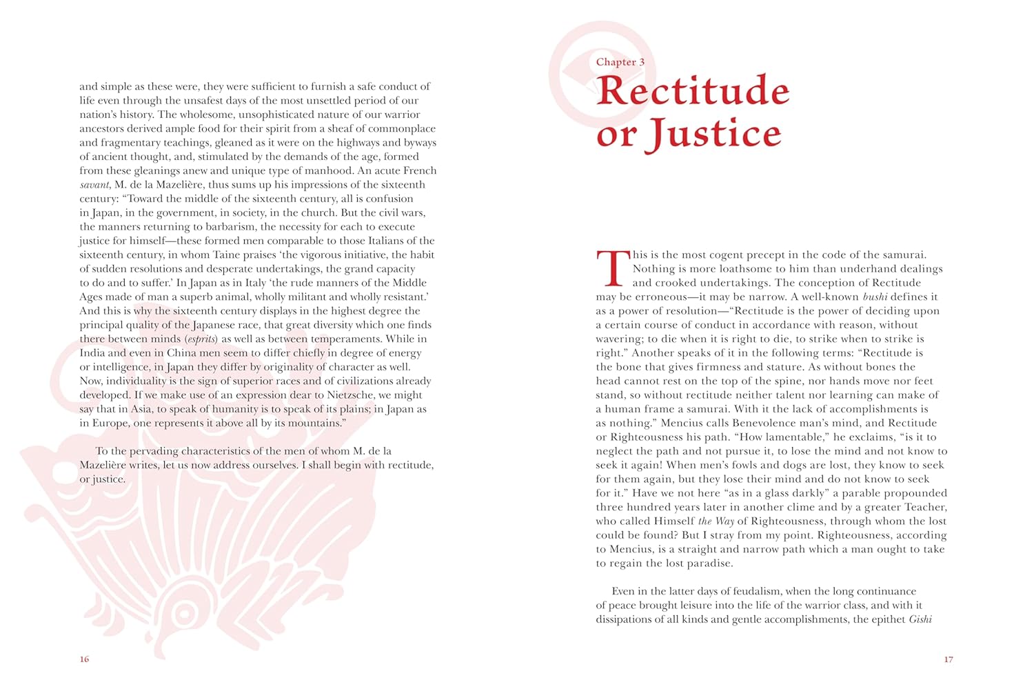 Bushido is the chivalric code of moral principles that the Samurai followed: rectitude, courage, benevolence, respect, honesty, honour and loyalty. Influenced by Confucianism, Shinto and Zen Buddhism, it tempers the violence of a warrior with wisdom and serenity. Alongside Sun Tzu’s The Art of War and Machiavelli’s The Prince, Inazo’s book has become influential among military and corporate leaders looking for ways to manage their people and overcome their opponents.