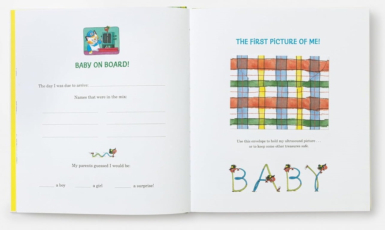 There's a spot for planting hand and footprints ("front and back paw prints here”), monthly recaps of development, and dozens of illustrations throughout, including Lowly Worm inching up the page where you capture baby’s growth, Huckle Cat spilling food on the entry for baby’s first meal, and Goldbug peeking out from an envelope where you can tuck welcome cards and baby’s hospital bracelet.