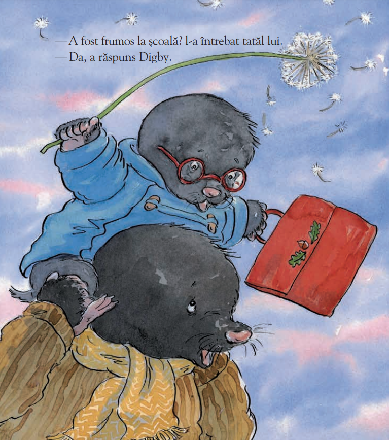 La școală înveţi lucruri interesante, te joci și îţi faci prieteni buni. Când Digby, un puiuţ de cârtiţă cu ochelari roșii, refuză să meargă la școală fiindcă se teme că nu va putea să se descurce, mama lui găsește cea mai ingenioasă soluţie: îi strecoară câţiva pupici în buzunarul hăinuţei, ca să-l încălzească și să-i dea curaj de-a lungul zilei.