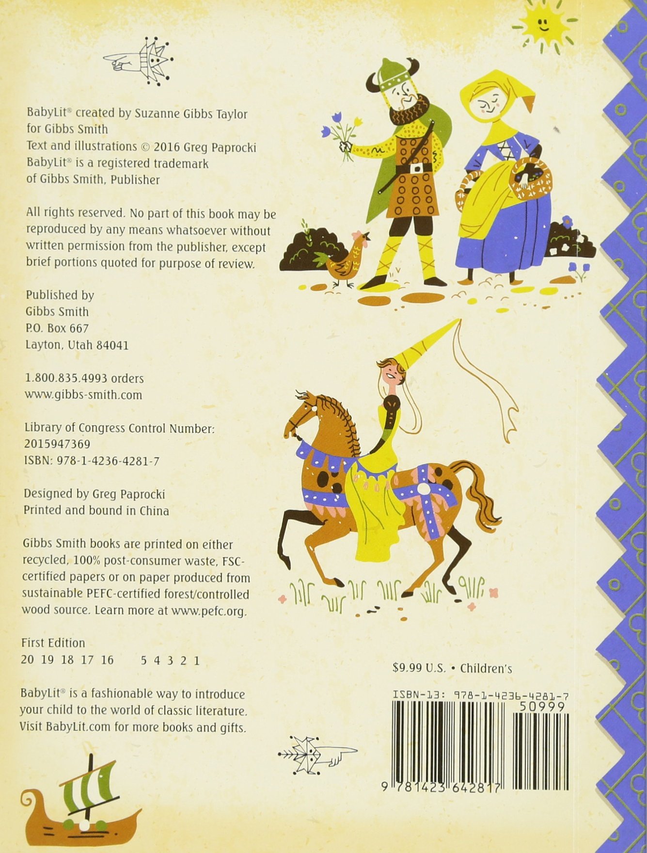 Noble knights, regal queens, and comical jesters all populate artist Greg Paprocki's wonderfully retro-looking illustrations. This book is guaranteed to enthrall your toddlers as they thrill to the excitement of fire-breathing dragons, ugly ogres, mystical unicorns, and stalwart Vikings in the pages of this worthy addition to Paprocki's popular series of alphabet primers.