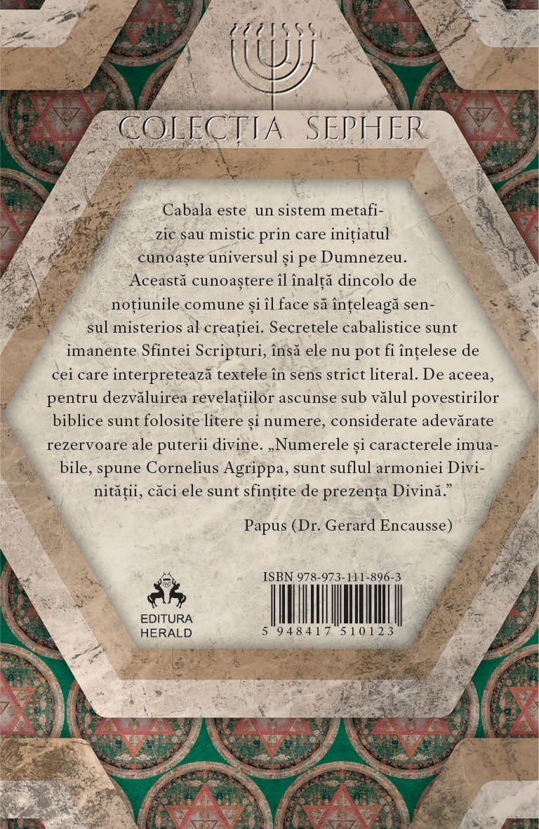 Cabala este un sistem metafizic sau mistic prin care initiatul cunoaste universul si pe Dumnezeu. Aceasta cunoastere il inalta dincolo de notiunile comune si il face sa inteleaga sensul misterios al creatiei. Secretele kabbalistice sunt imanente Sfintei Scripturi, insa ele nu pot fi intelese de cei care interpreteaza textele in sens strict literal. De aceea, pentru dezvaluirea revelatiilor ascunse sub valul povestirilor biblice sunt folosite litere si numere, considerate adevarate rezervoare ale puterii divine. „Numerele si caracterele imuabile, spune Cornelius Agrippa, sunt suflul armoniei Divinitatii, caci ele sunt sfintite de prezenta Divina. - Papus (Dr. Gerard Encausse)