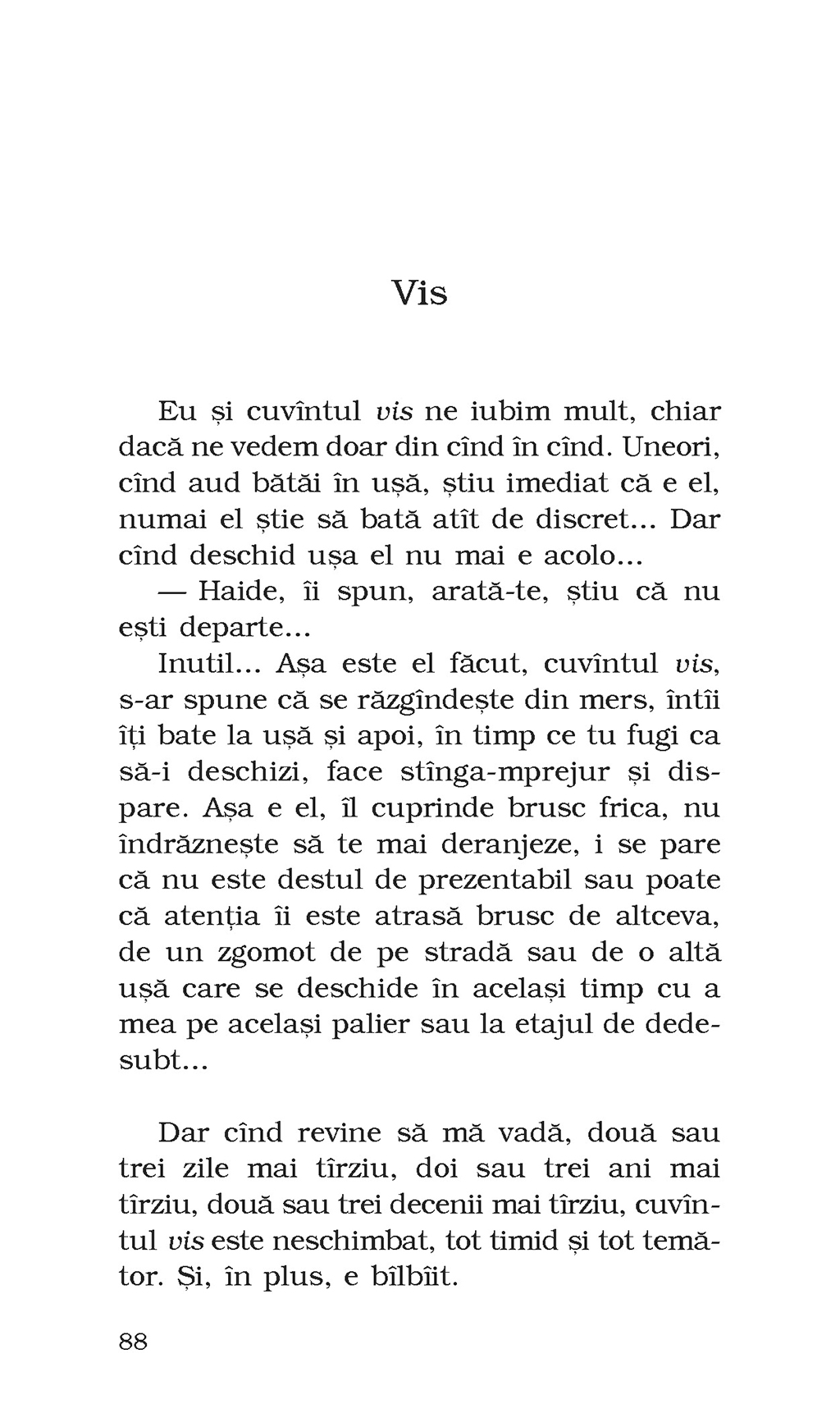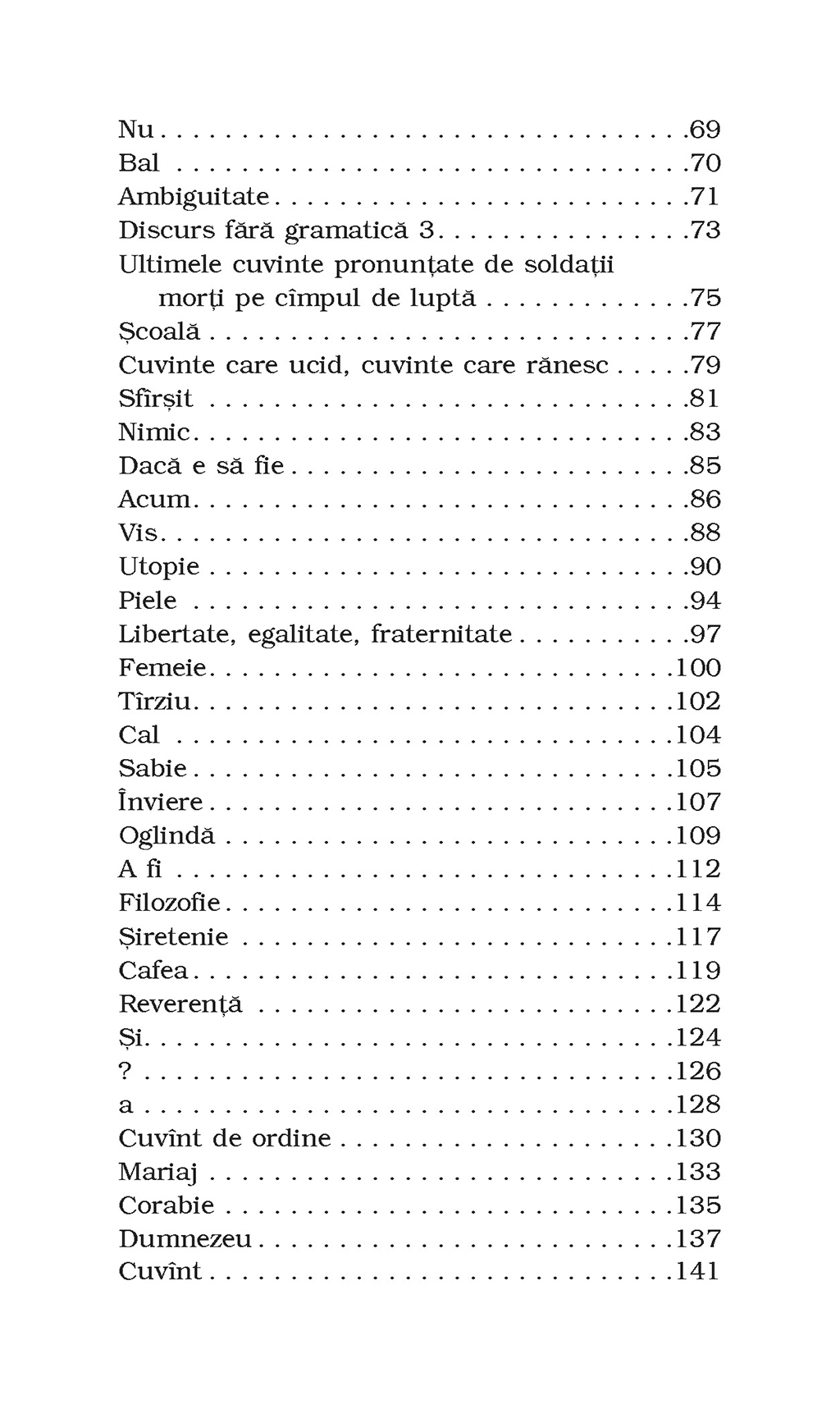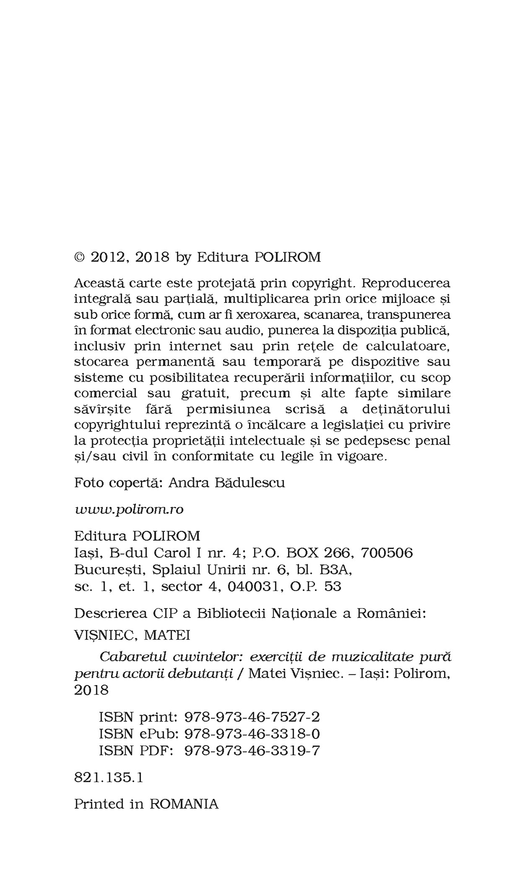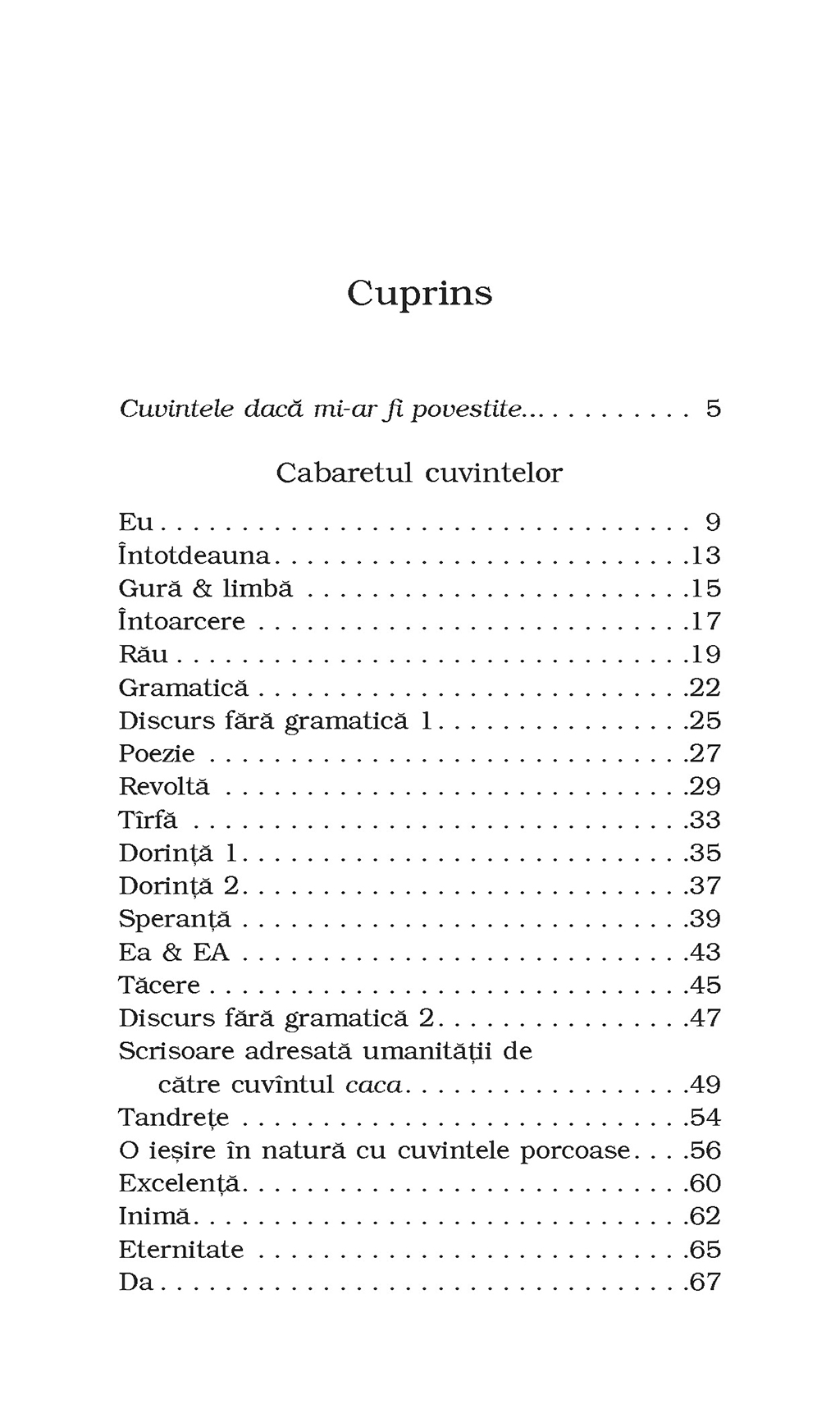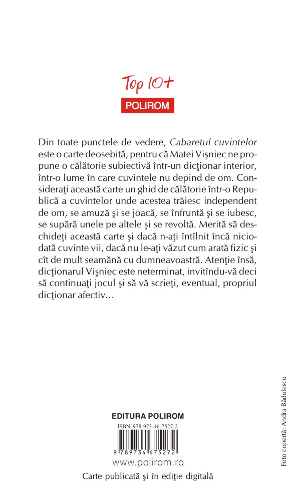 Din toate punctele de vedere, Cabaretul cuvintelor este o carte deosebită, pentru că Matei Vişniec ne propune o călătorie subiectivă într-un dicţionar interior, într-o lume în care cuvintele nu depind de om. Consideraţi această carte un ghid de călătorie într-o Republică a cuvintelor unde acestea trăiesc independent de om, se amuză şi se joacă, se înfruntă şi se iubesc, se supără unele pe altele şi se revoltă. Merită să deschideţi această carte şi dacă n-aţi întîlnit încă niciodată cuvinte vii, dacă nu le-aţi văzut cum arată fizic şi cît de mult seamănă cu dumneavoastră. Atenţie însă, dicţionarul Vişniec este neterminat, invitîndu-vă deci să continuaţi jocul şi să vă scrieţi, eventual, propriul dicţionar afectiv...