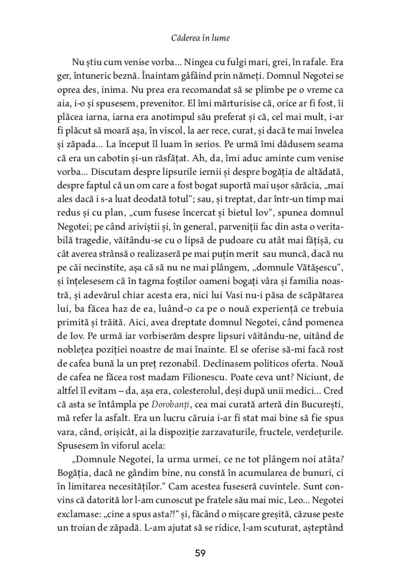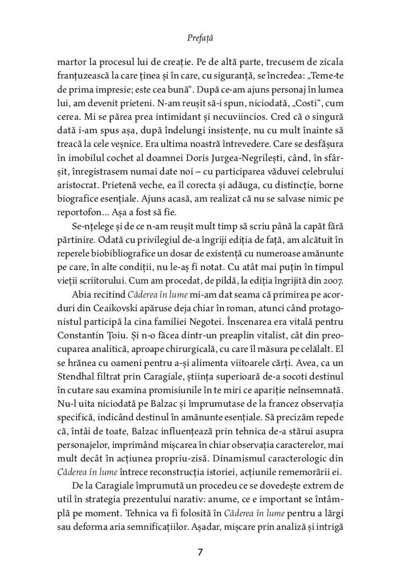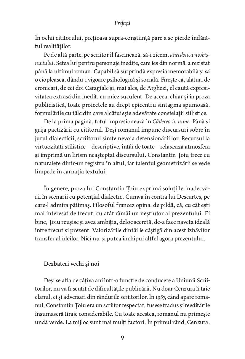 Capodoperă a deceniului nouă, rămasă destulă vreme, asemenea unui diamant, în clarobscuritatea epocii, Căderea în lume are anvergura romanului proteic, în care totul, de la polifonie la discursivitate, de la galeria personajelor la cea a conceptelor, până la amănuntul anecdotic și banal, rezonează într-o istorie a lumii cum nu se mai poartă. - Marius Miheț