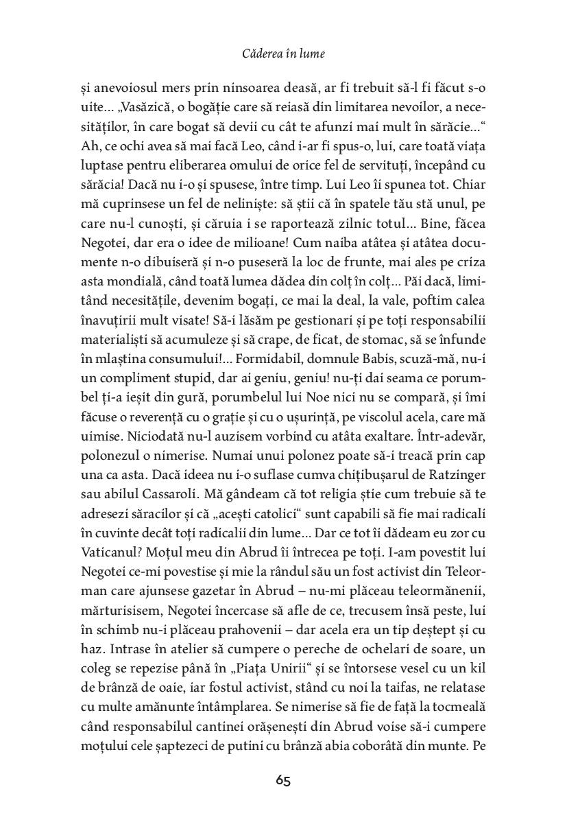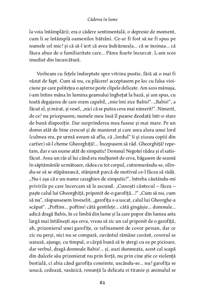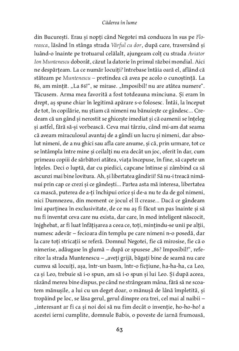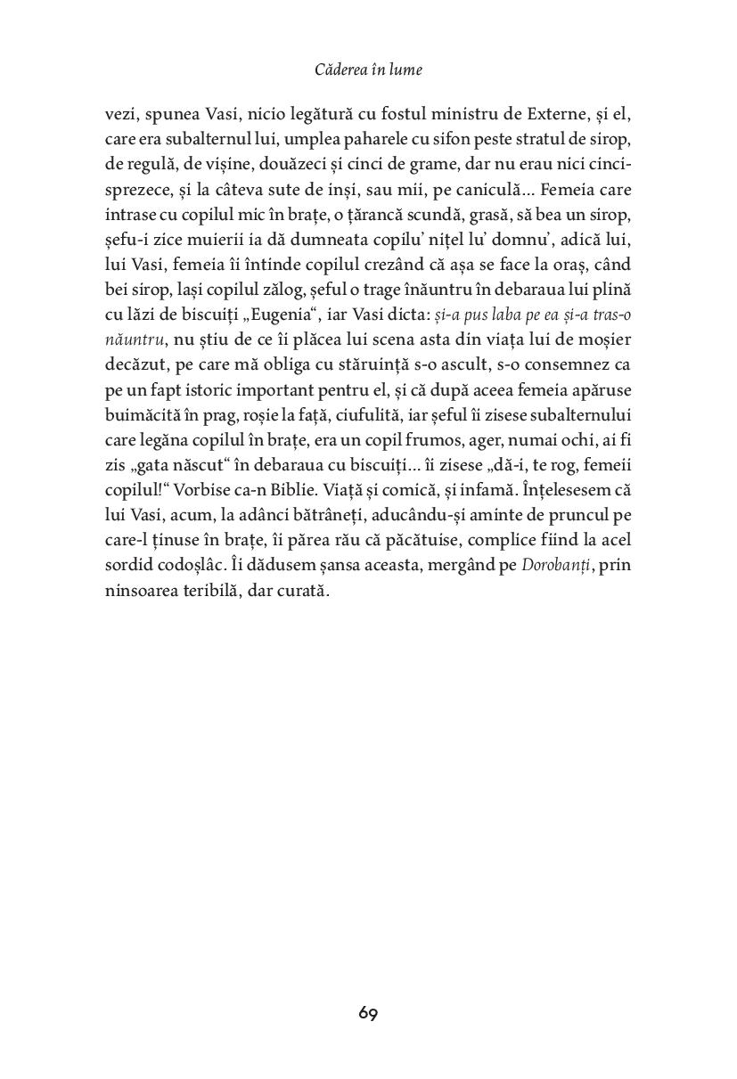 Capodoperă a deceniului nouă, rămasă destulă vreme, asemenea unui diamant, în clarobscuritatea epocii, Căderea în lume are anvergura romanului proteic, în care totul, de la polifonie la discursivitate, de la galeria personajelor la cea a conceptelor, până la amănuntul anecdotic și banal, rezonează într-o istorie a lumii cum nu se mai poartă. - Marius Miheț