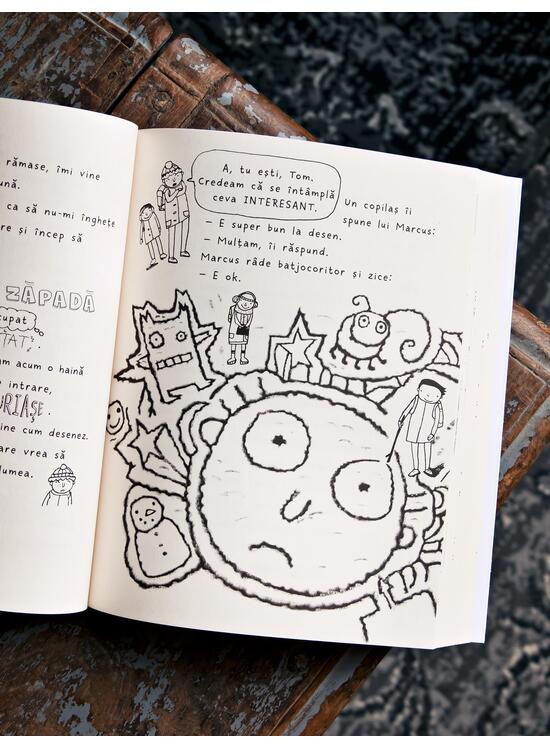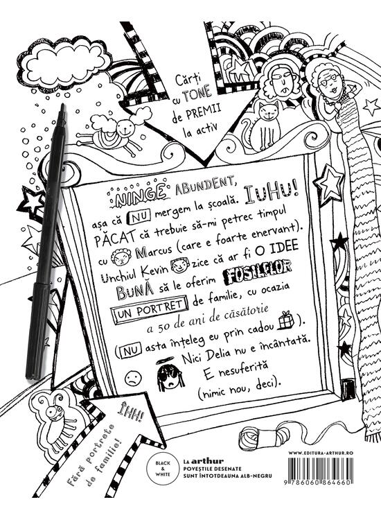 NINGE ABUNDENT, așa că NU mergem la școală. IUHU! PĂCAT că trebuie să-mi petrec timpul cu Marcus (care e foarte enervant). Unchiul Kevin zice că ar fi O IDEE BUNĂ să le oferim FOSILELOR UN PORTRET de familie, cu ocazia a 50 de ani de căsătorie (NU asta înțeleg eu prin cadou). Nici Delia nu e încântată. E nesuferită (nimic nou, deci).