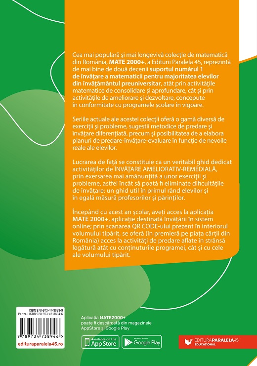 Cea mai populară şi mai longevivă colecţie de matematică din România, MATE 2000+, a Editurii Paralela 45, reprezintă de mai bine de două decenii suportul numărul 1 de învăţare a matematicii pentru majoritatea elevilor din învăţământul preuniversitar, atât prin activităţile matematice de consolidare şi aprofundare, cât şi prin activităţile de ameliorare şi dezvoltare, concepute în conformitate cu programele şcolare în vigoare.