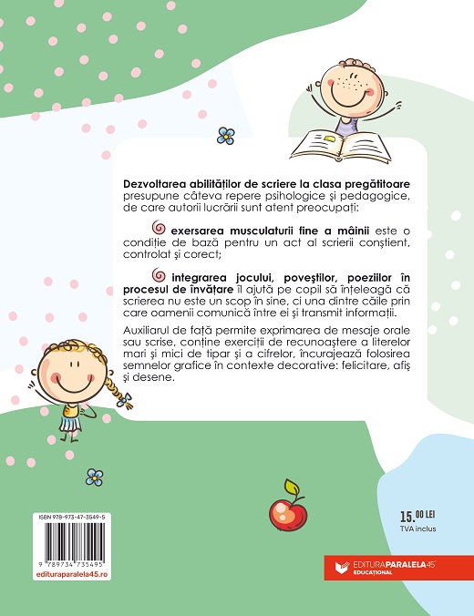 Auxiliarul de faţă permite exprimarea de mesaje orale sau scrise, conţine exerciţii de recunoaştere a literelor mari şi mici de tipar şi a