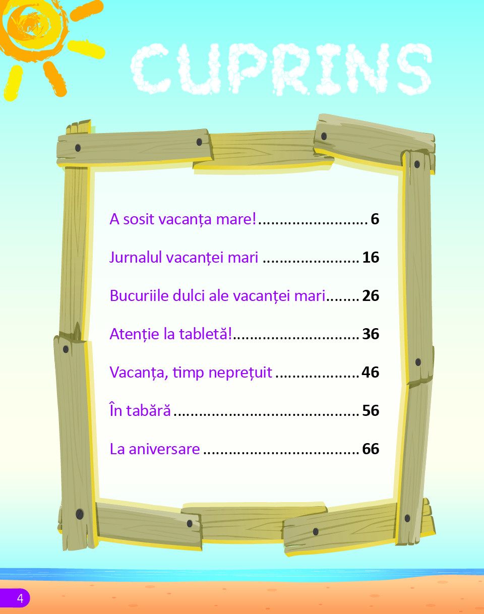 Caietul propune „Jocuri de vacanță”, care vizează dezvoltarea spiritului de observație, a limbajului, a gândirii și a creativității.