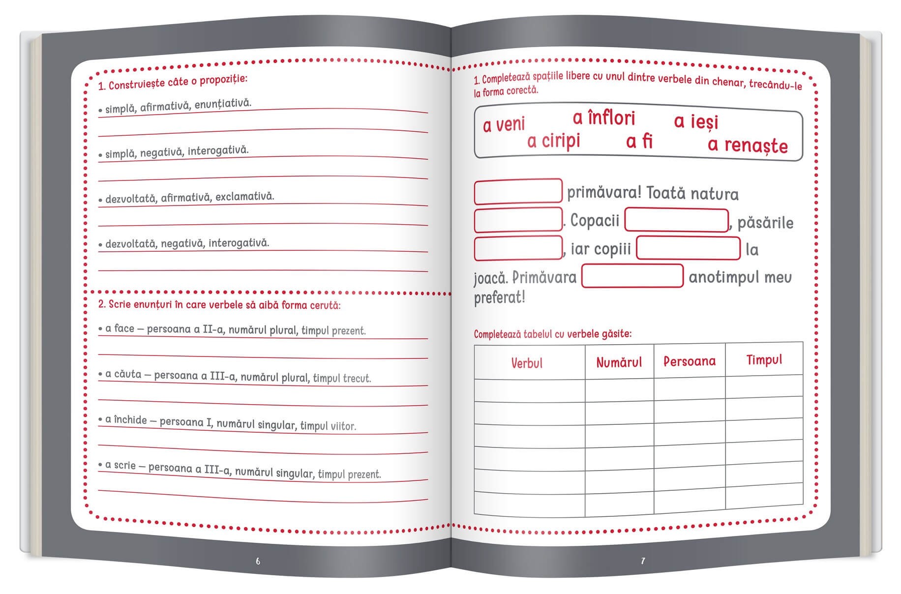 propoziții simple și dezvoltate • părțile de propoziție • analiza părților de propoziție • vorbirea directă și cea indirectă • acordul subiectului cu predicatul • positive, negative and interrogative sentences • „do / does” • „must / mustn’t” • Present Simple