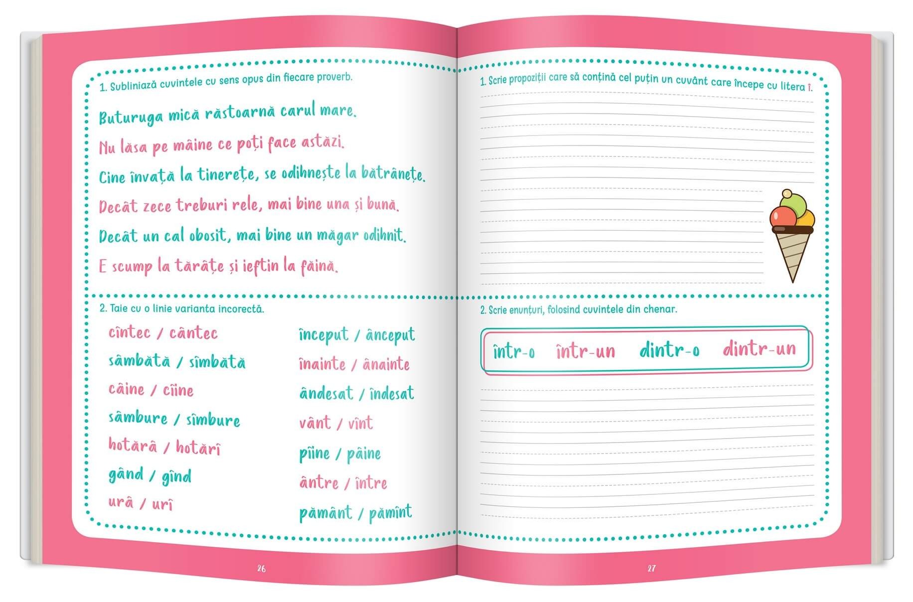 grupurile de litere (ea, ia, oa, ua etc.) • formule de salut • scrierea corectă a cuvintelor care conţin consoana „m” înainte de „b” şi „p” • scrierea corectă a cuvintelor „într-un/ într-o”, „dintr-un/ dintr-o” • semne de punctuație • recunoașterea însușirilor • feluri de propoziții