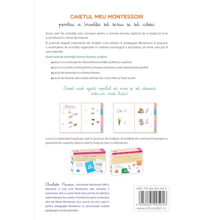 Caietul meu Montessori pentru a invata sa scriu si sa citesc se adreseaza copiilor cu varstele intre 3 si 6 ani, este special conceput pentru a stimula dorinta unui copil de a invata sa scrie si sa citeasca, respectand in acelasi timp ritmul sau natural.
